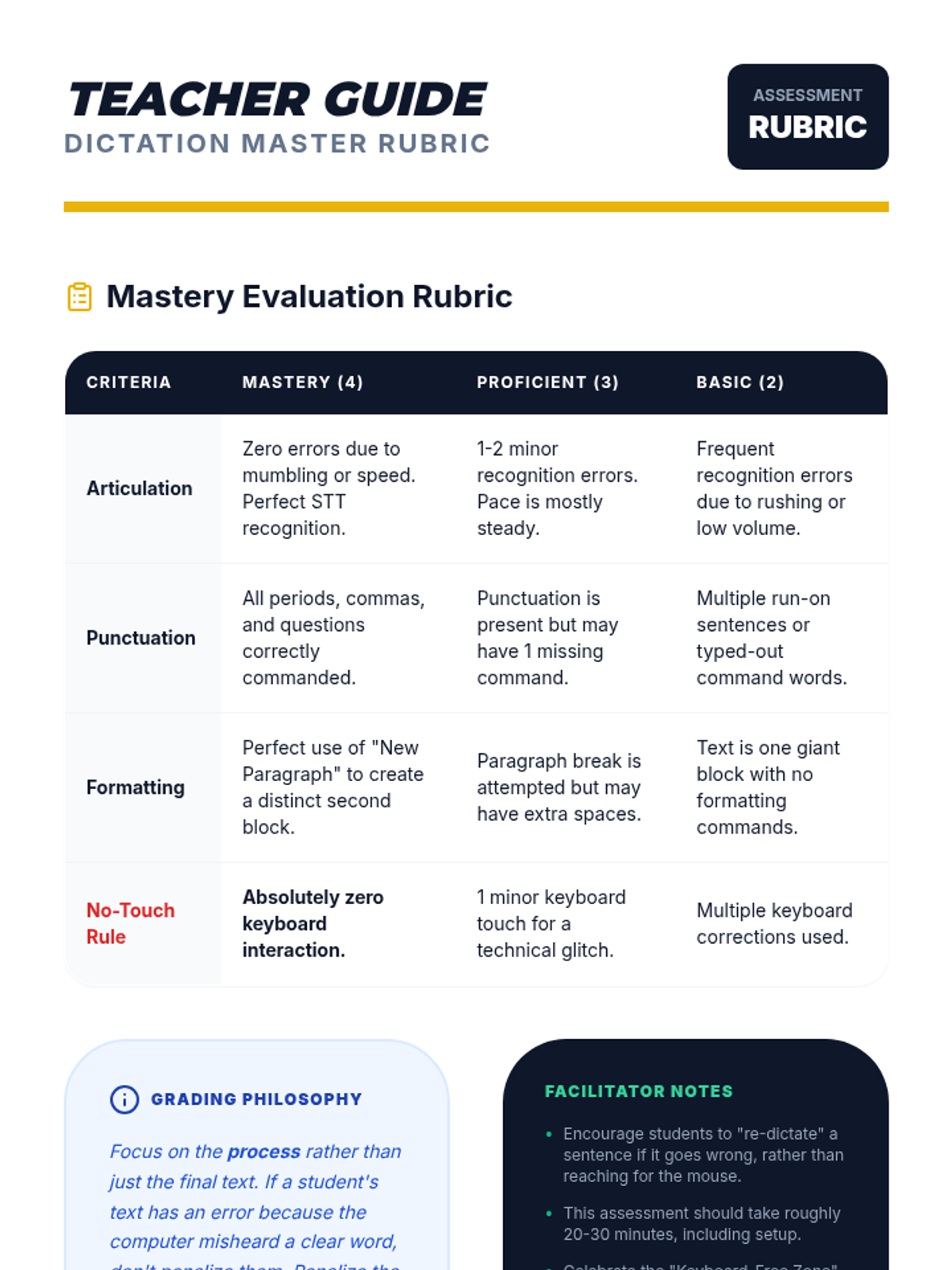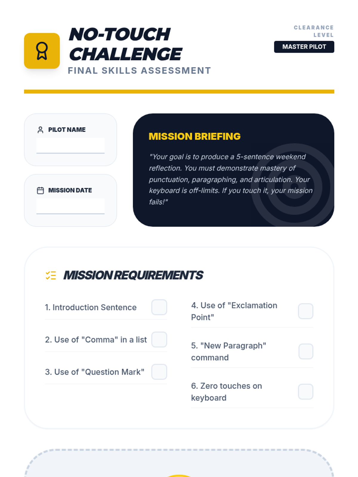Students combine all previous skills to dictate a 5-sentence reflection on their weekend. They must demonstrate correct setup, clear articulation, and accurate punctuation without touching the keyboard.