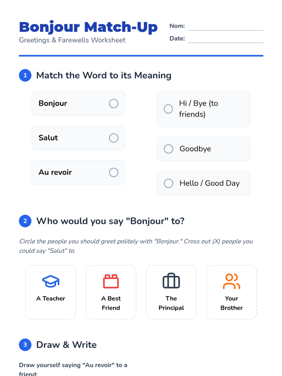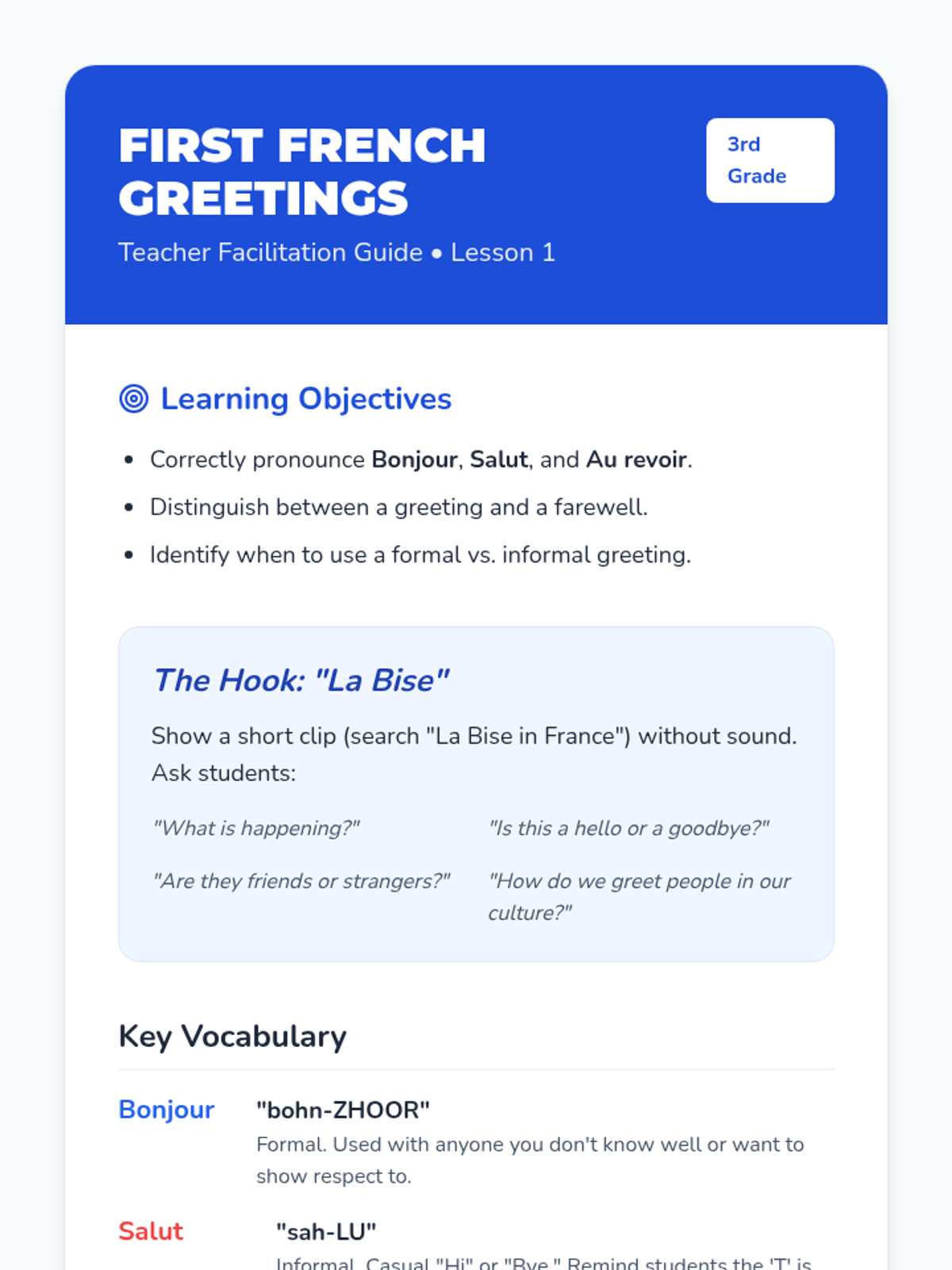 Students learn the core vocabulary for saying hello and goodbye, including 'Bonjour,' 'Salut,' and 'Au revoir.' Through repetition and a 'ball toss' game, they practice pronunciation and association.
