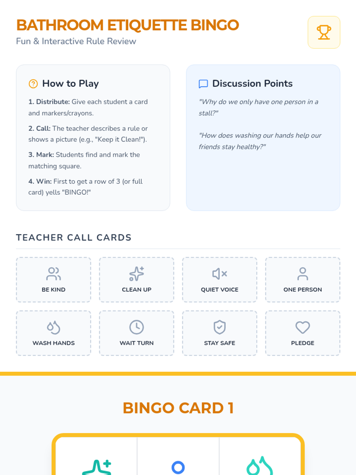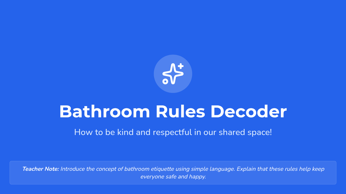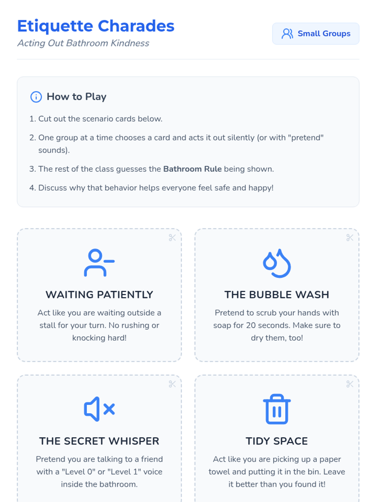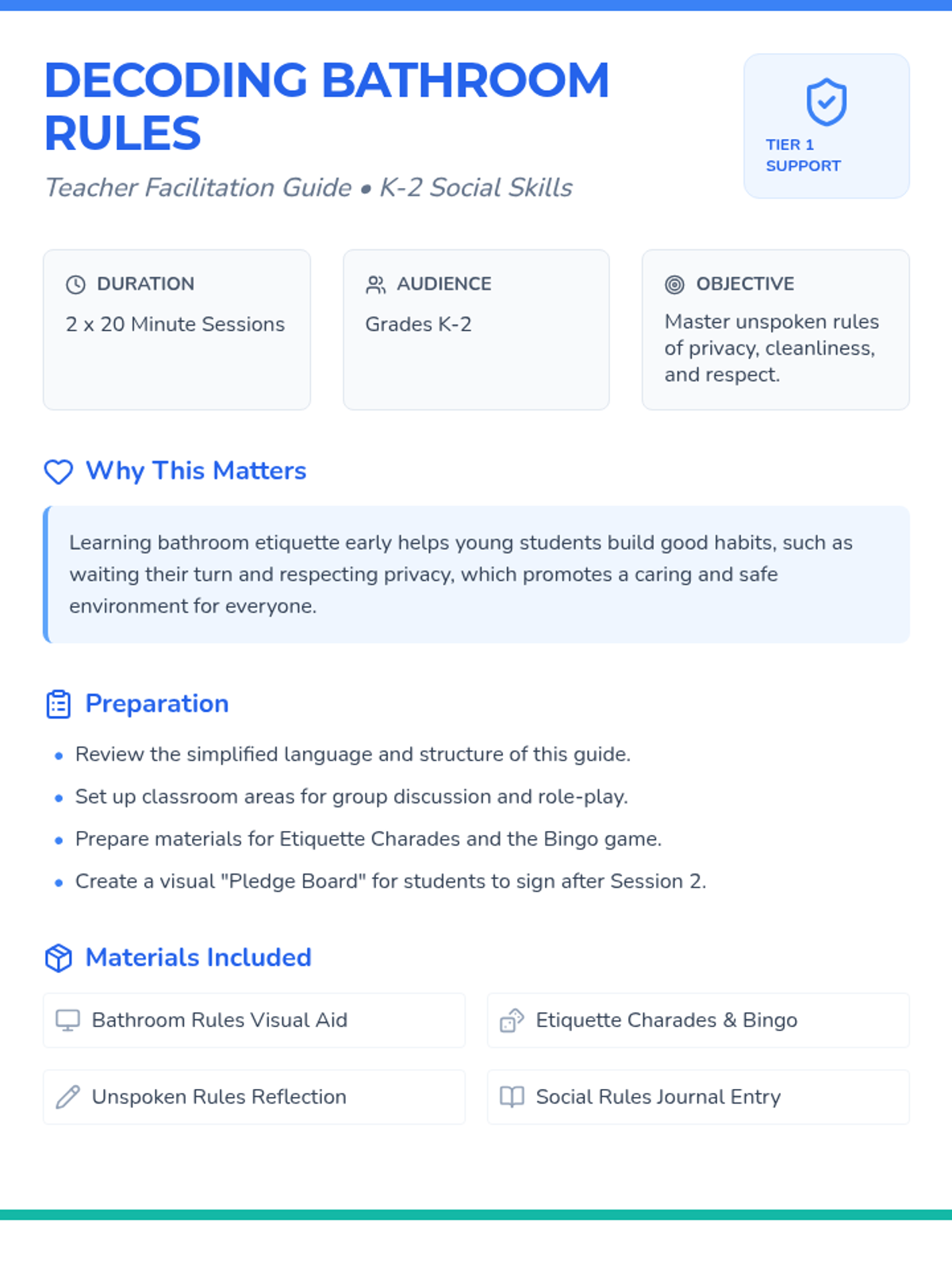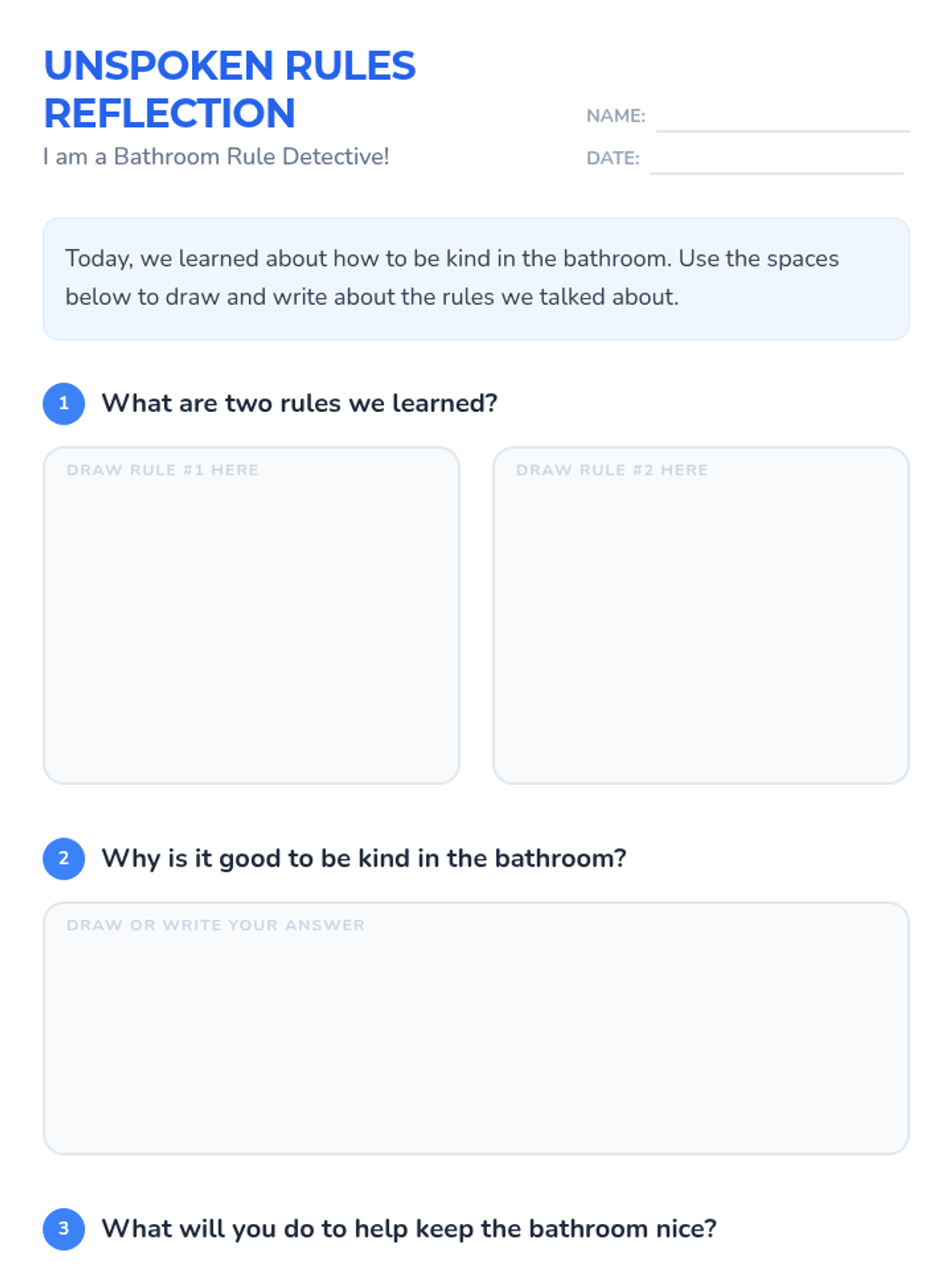 A two-session lesson for K-2 students to learn the unspoken social rules of bathroom etiquette through games, discussion, and reflection. Students will explore concepts of privacy, cleanliness, and kindness in shared spaces.