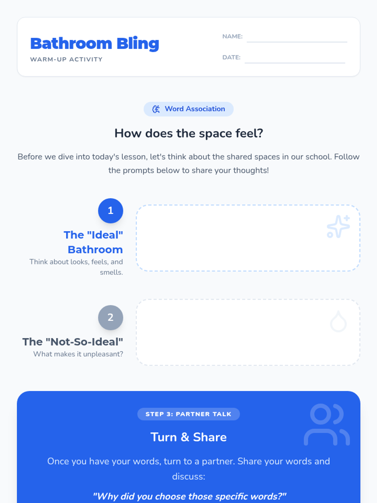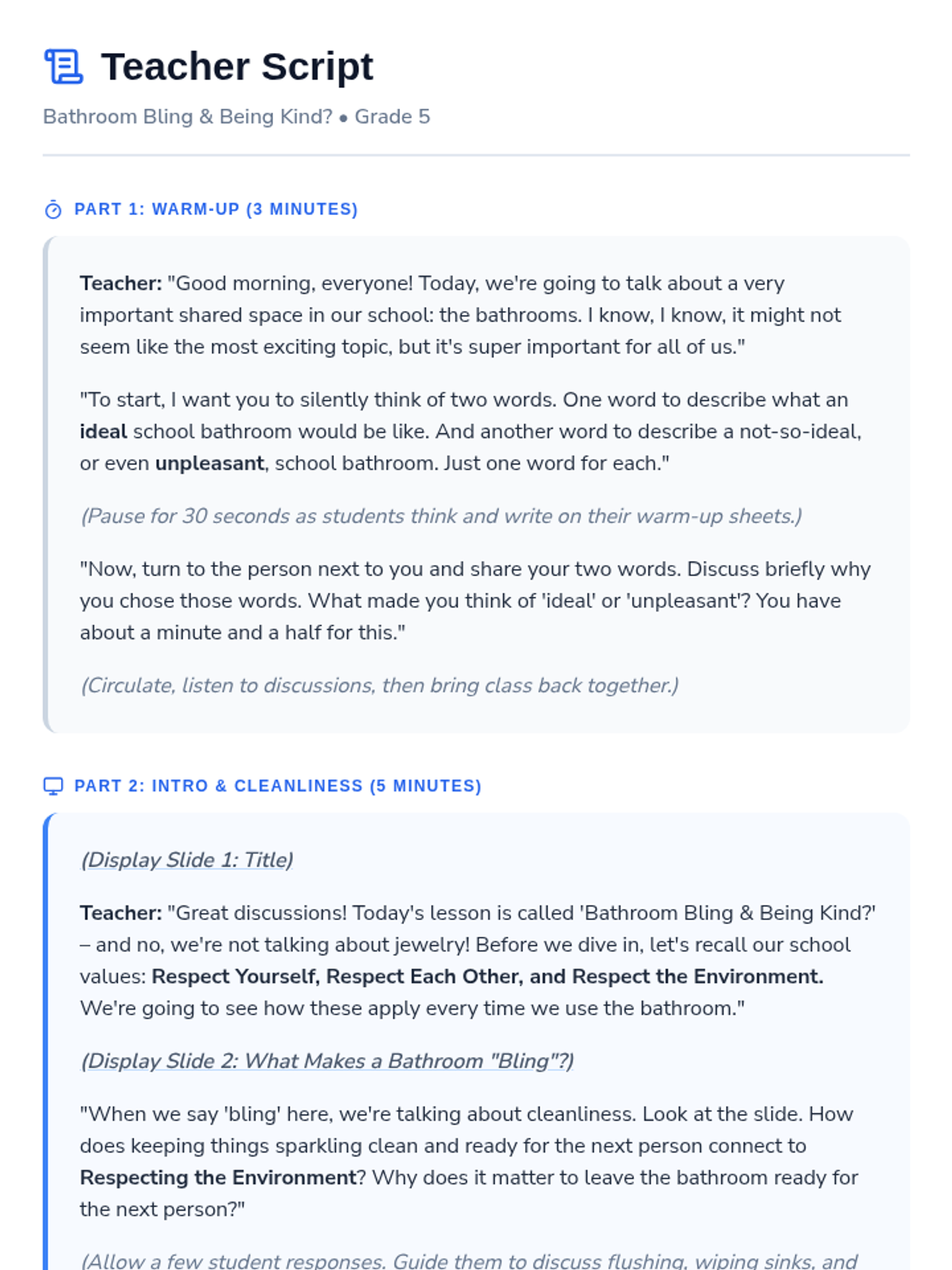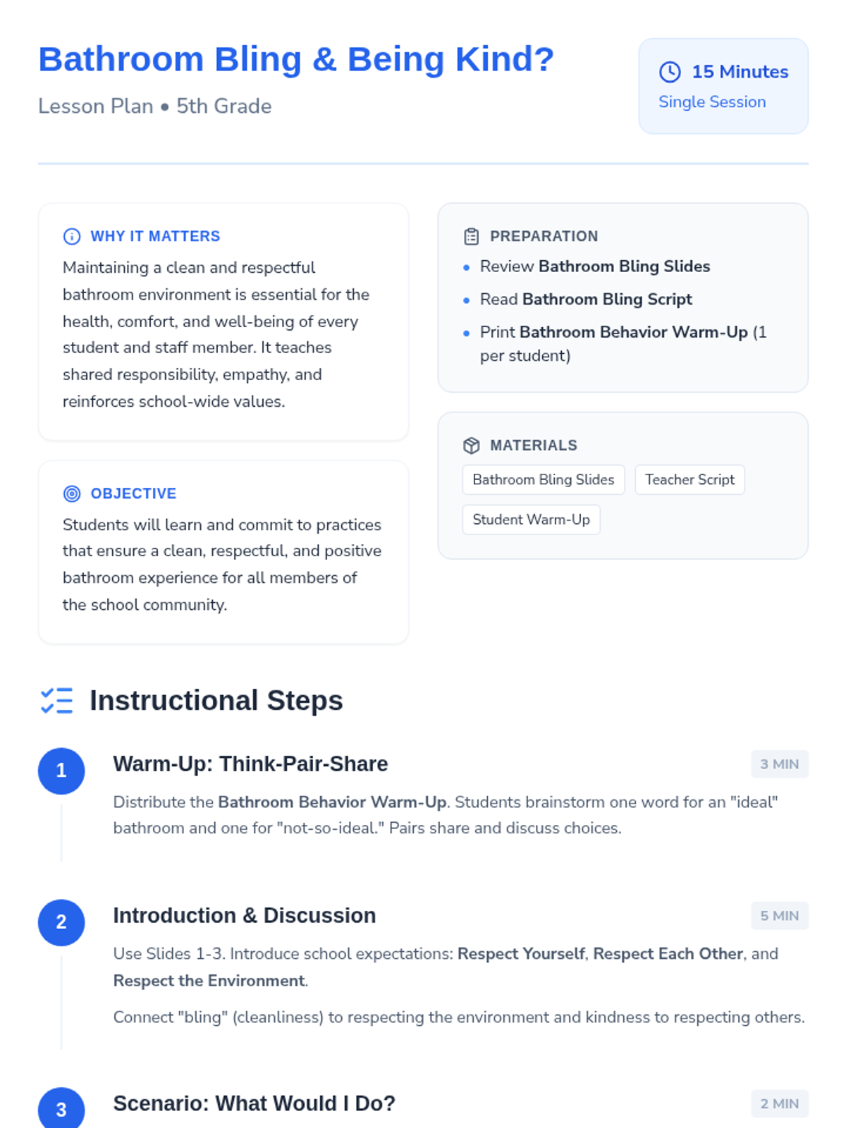 A 15-minute lesson for 5th-grade students on responsible bathroom behavior, focusing on cleanliness and respect for others through the school-wide values of Respect Yourself, Respect Each Other, and Respect the Environment.