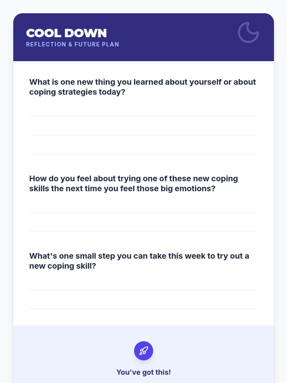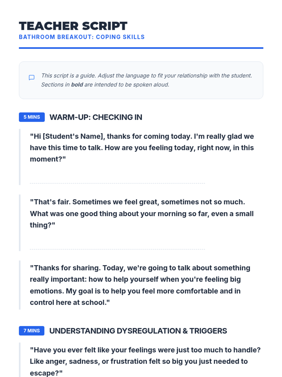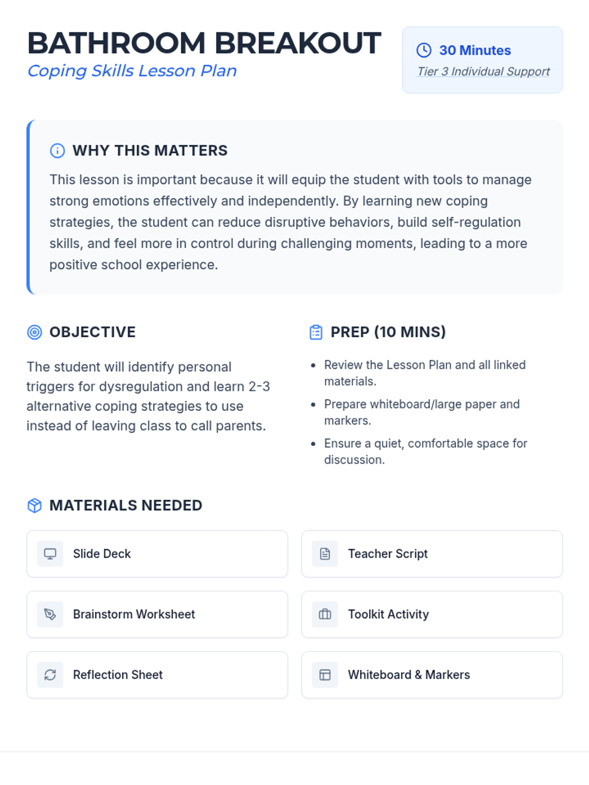 This individual Tier 3 lesson for a 7th-grade student focuses on developing alternative coping strategies for dysregulation. It helps the student identify triggers and practice new skills over a 30-minute session to reduce reliance on disruptive behaviors.