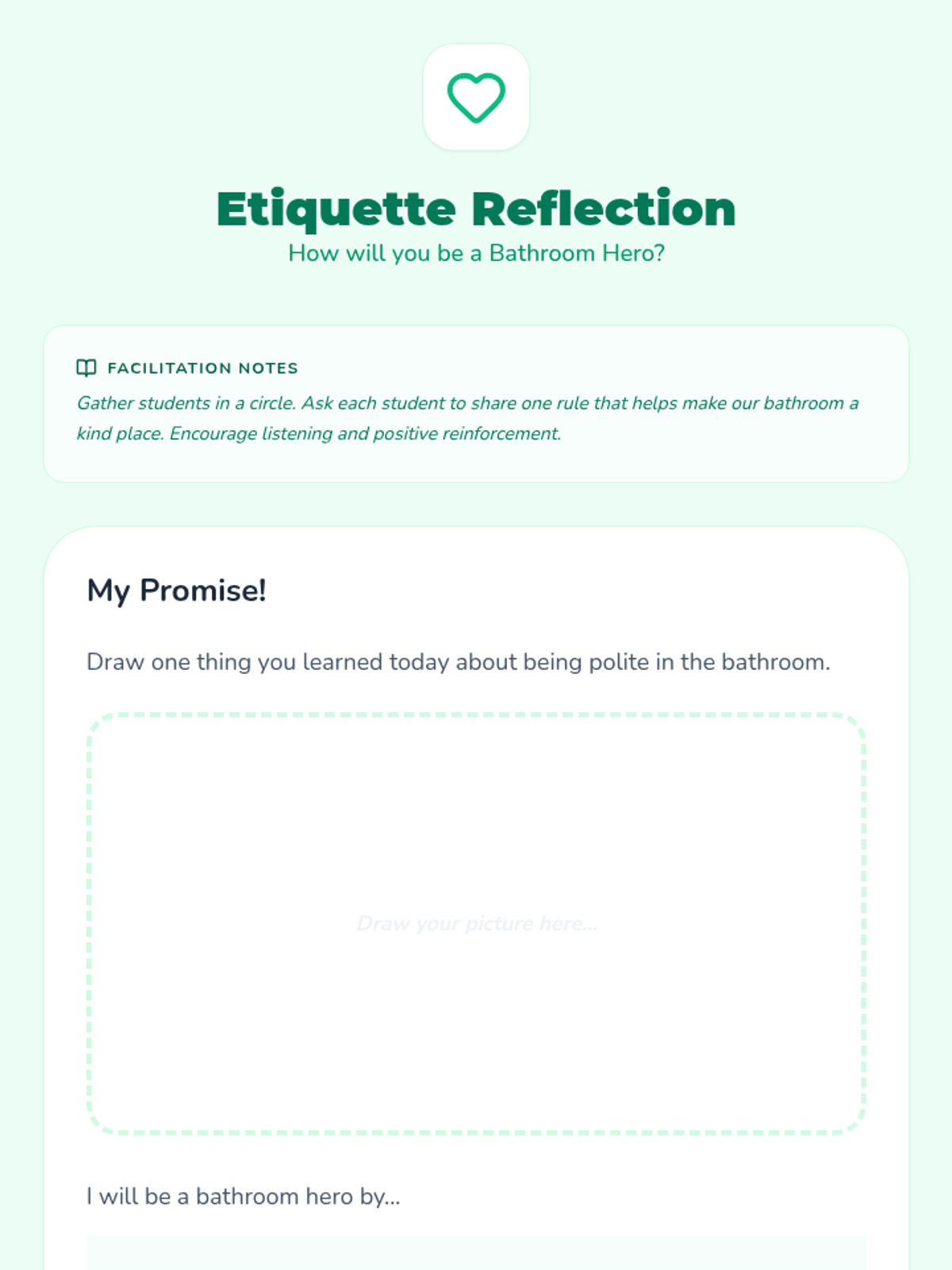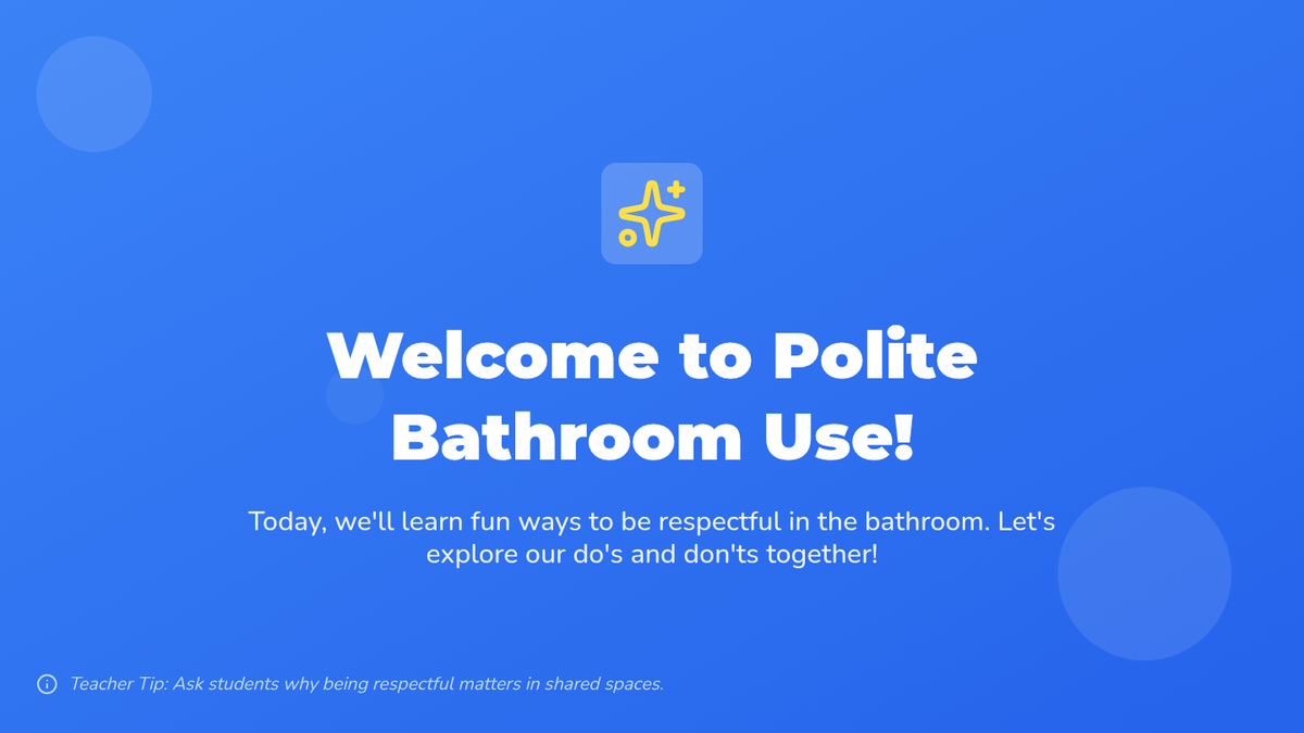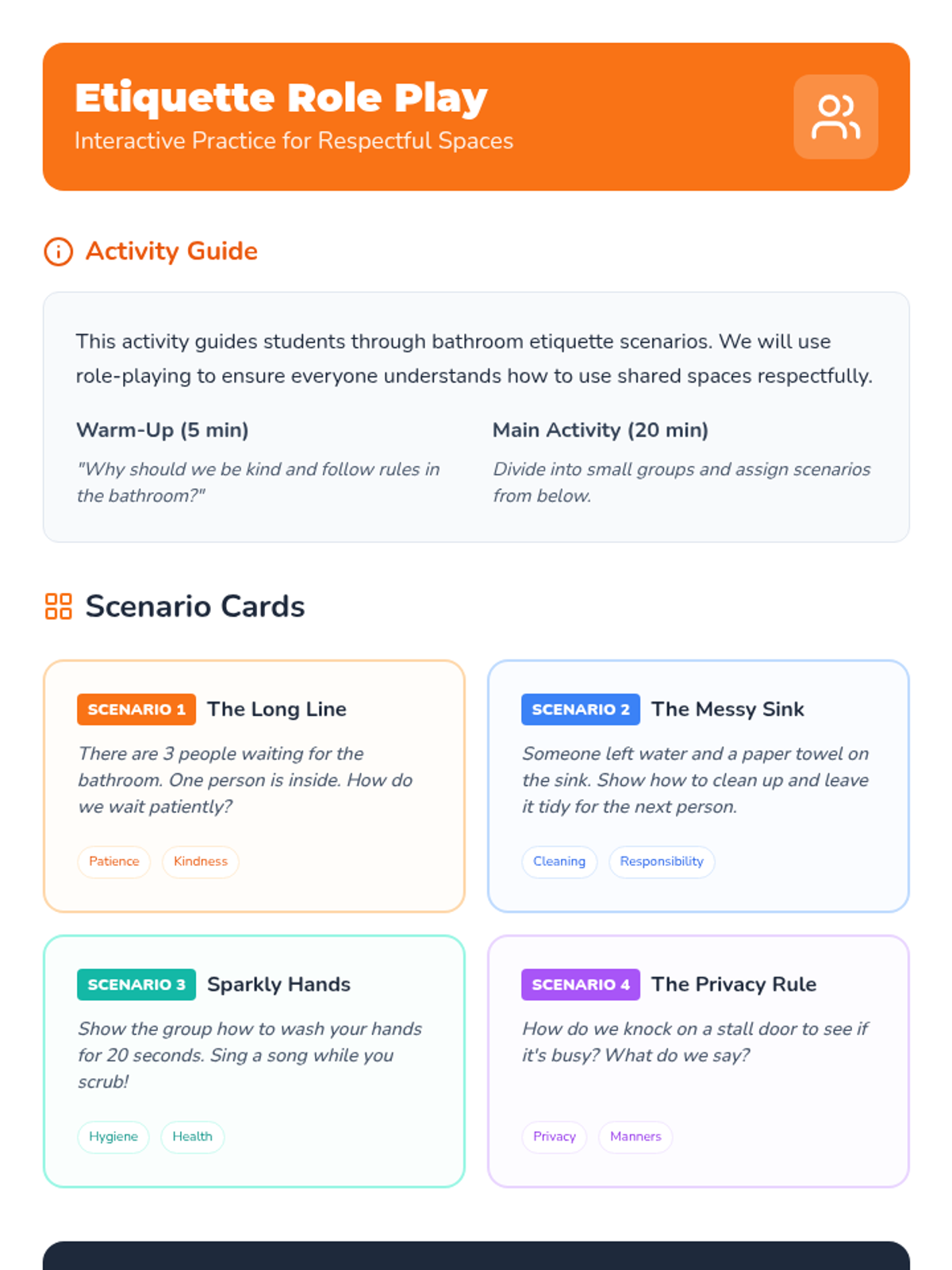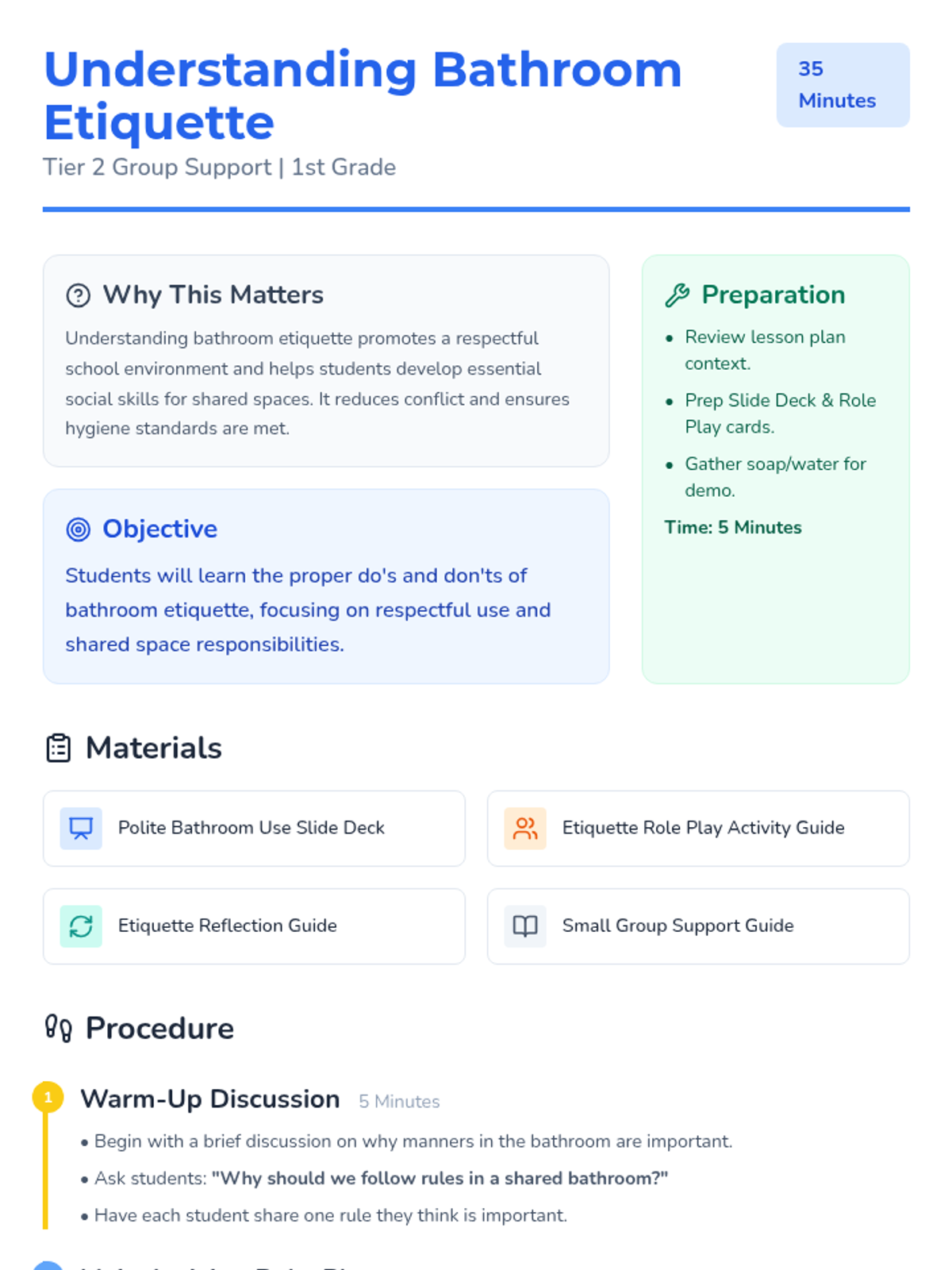 This 35-minute lesson for 1st-grade small groups focuses on the essential do's and don'ts of bathroom etiquette. Students engage with interactive slides, role-play scenarios, and reflective discussions to foster respect and consideration in shared school spaces.