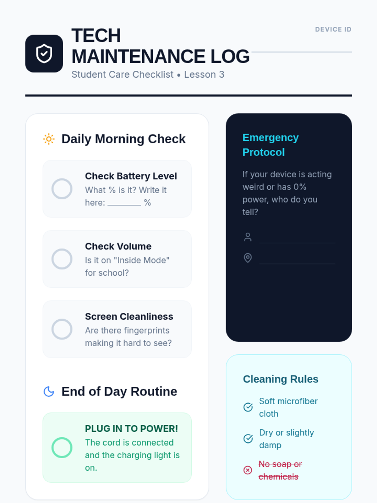 Students learn to monitor battery status and develop a routine for device care, including cleaning and charging, to ensure their communication tools are always ready.