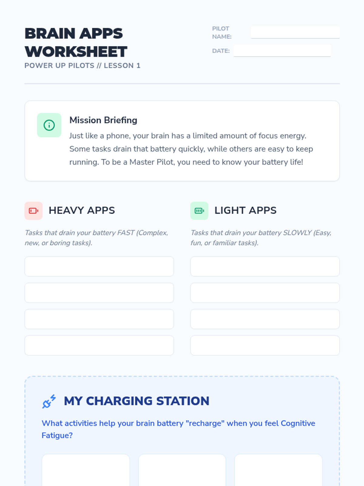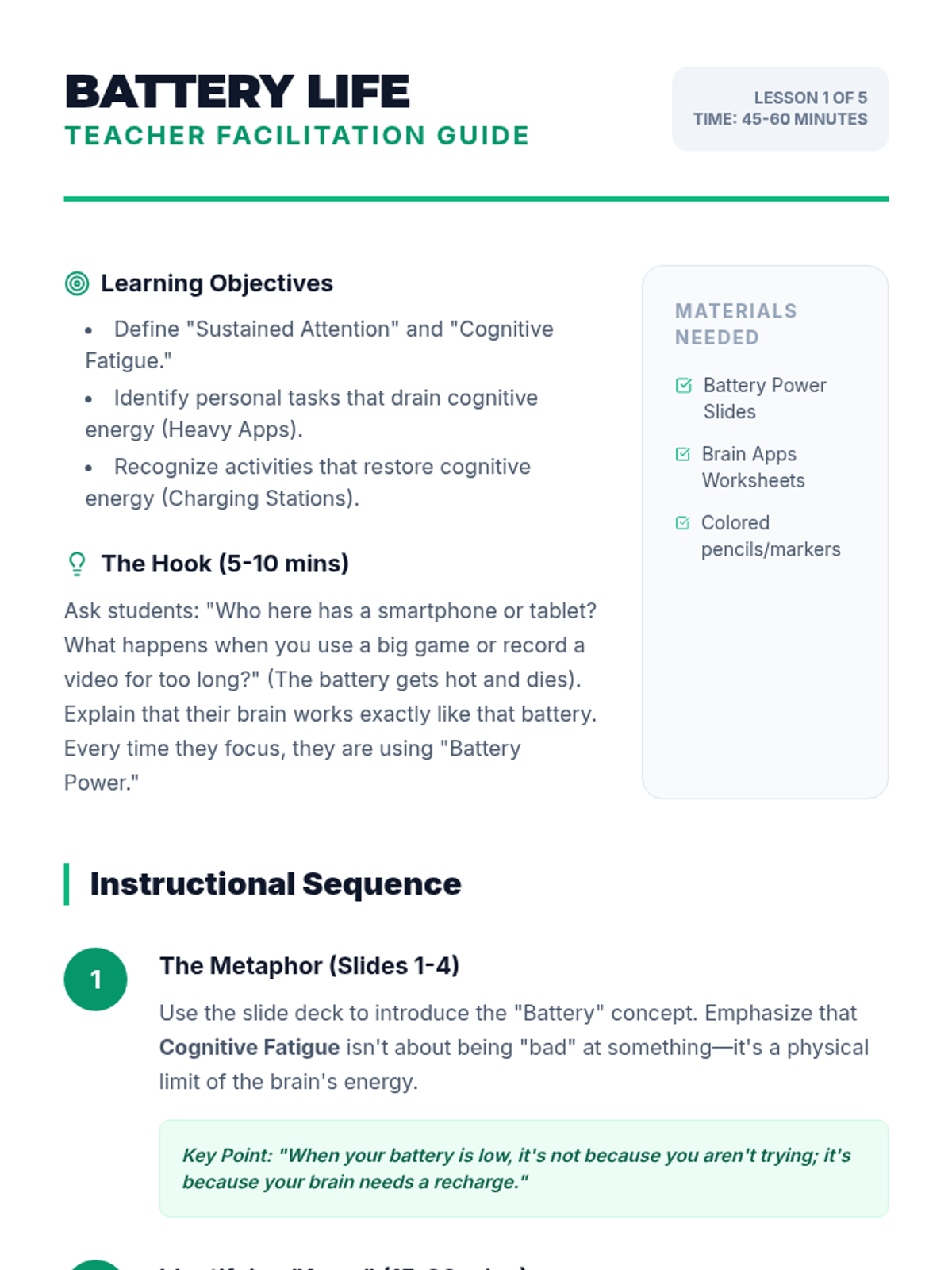 Students are introduced to the concept of attention as a battery that drains and needs recharging. They identify which tasks drain their battery and learn the vocabulary of 'sustained attention' and 'cognitive fatigue.'