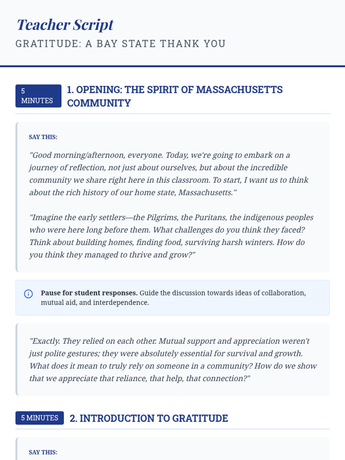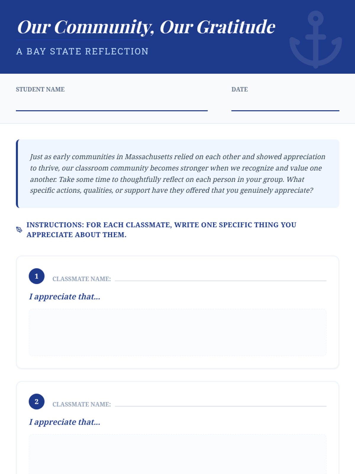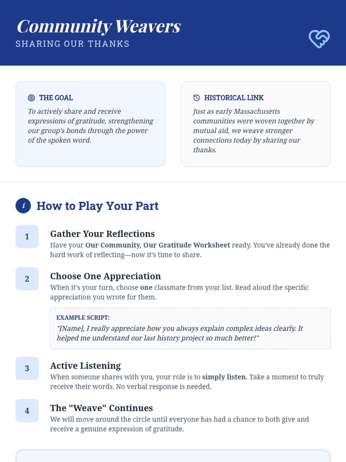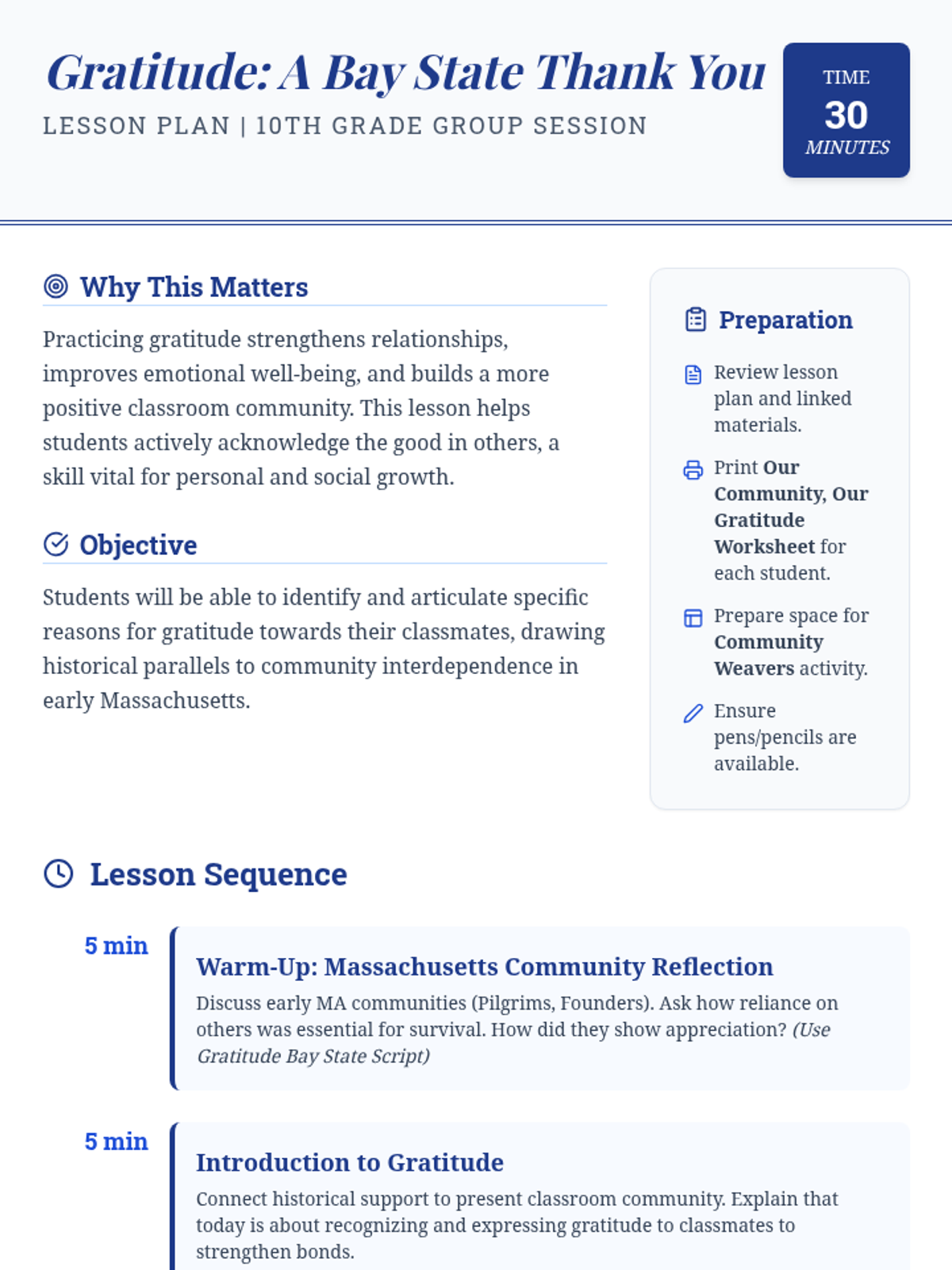 A 30-minute group session for 10th-grade girls that explores gratitude through the lens of early Massachusetts history, fostering community and mutual support.