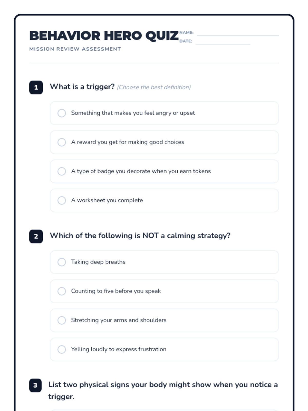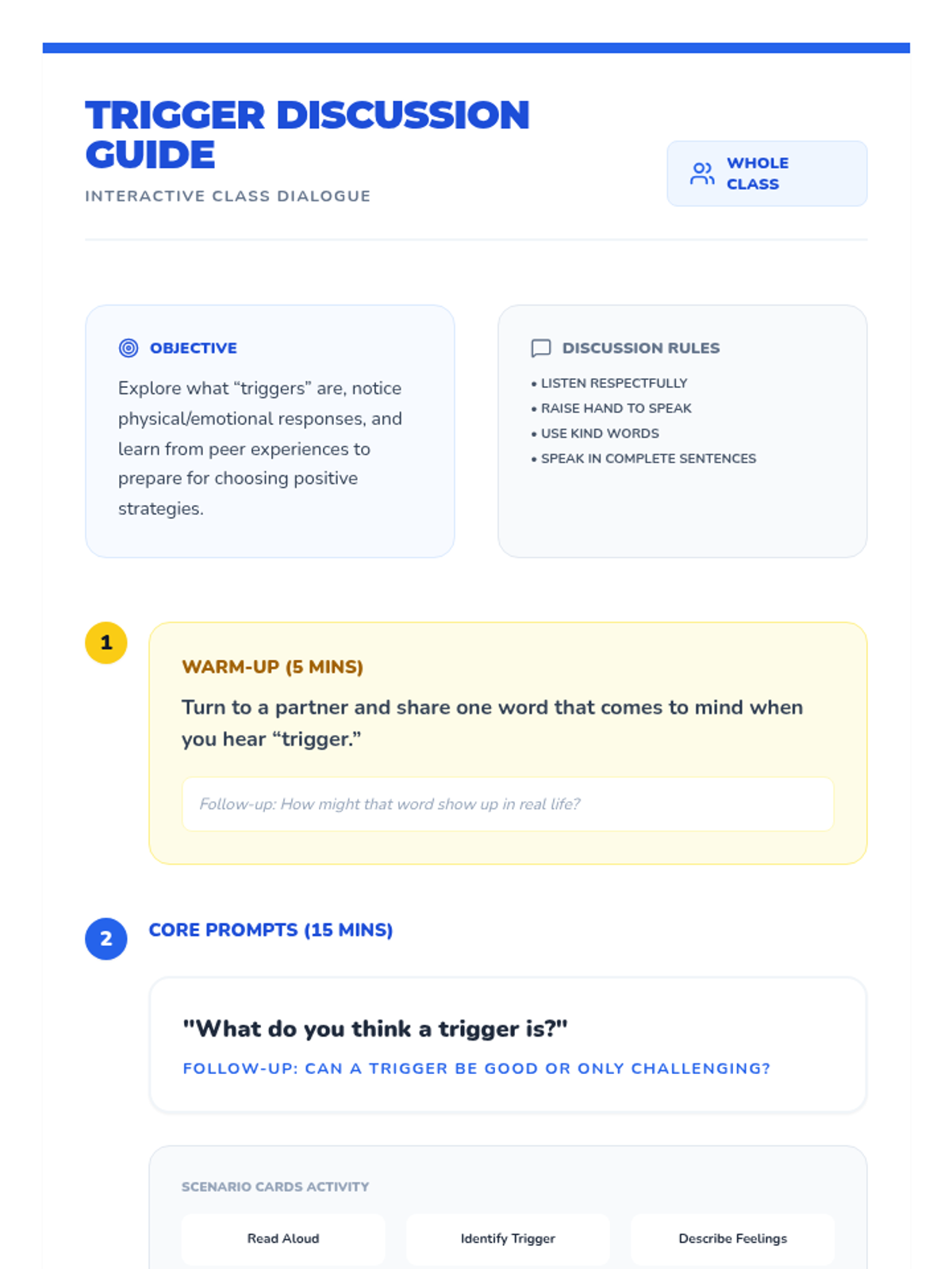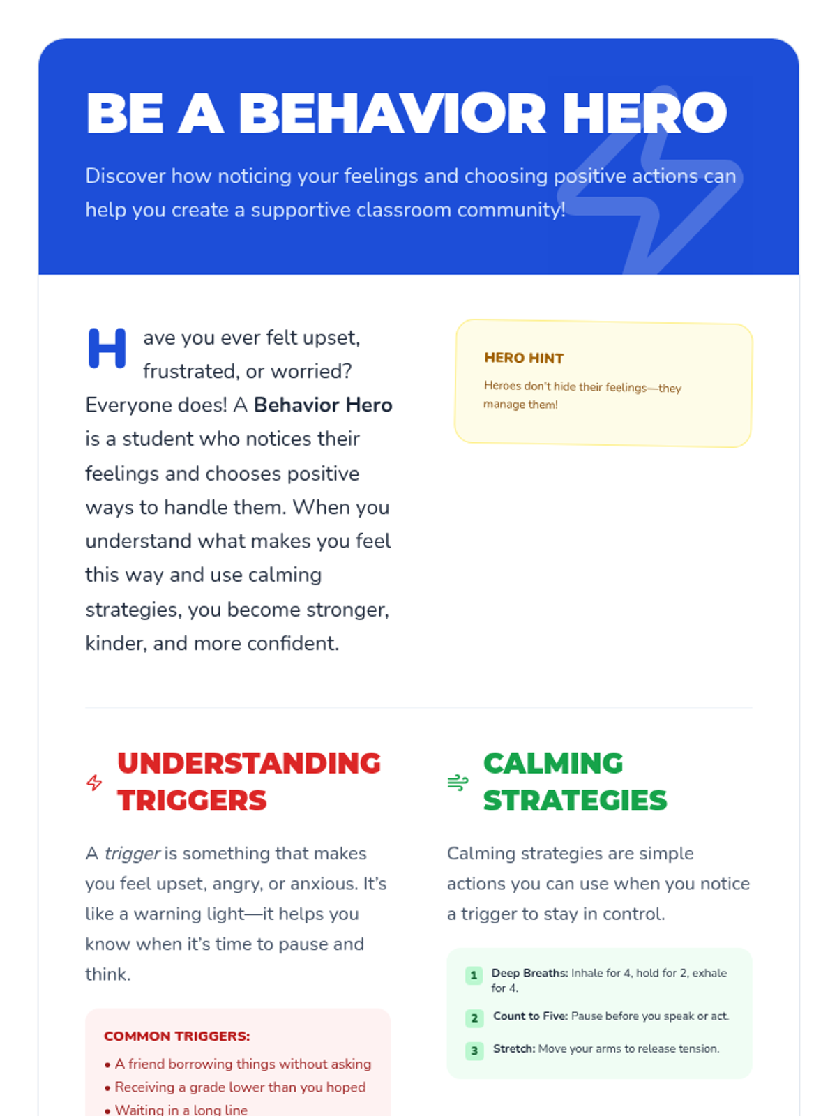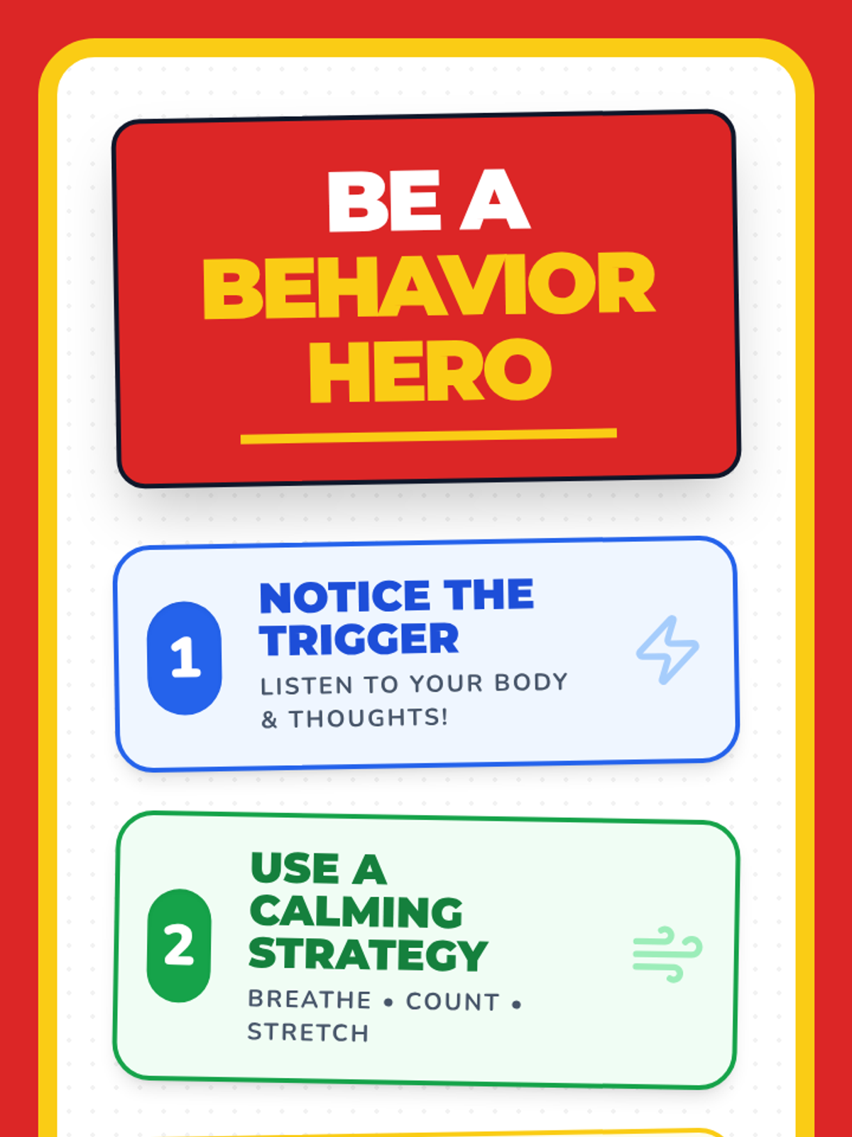 In this 30-minute lesson, 4th graders learn positive behavior strategies and self-regulation skills to create a supportive classroom community. Students will practice recognizing triggers, using calming strategies, and reinforcing positive choices.