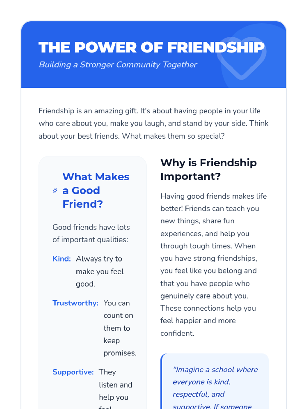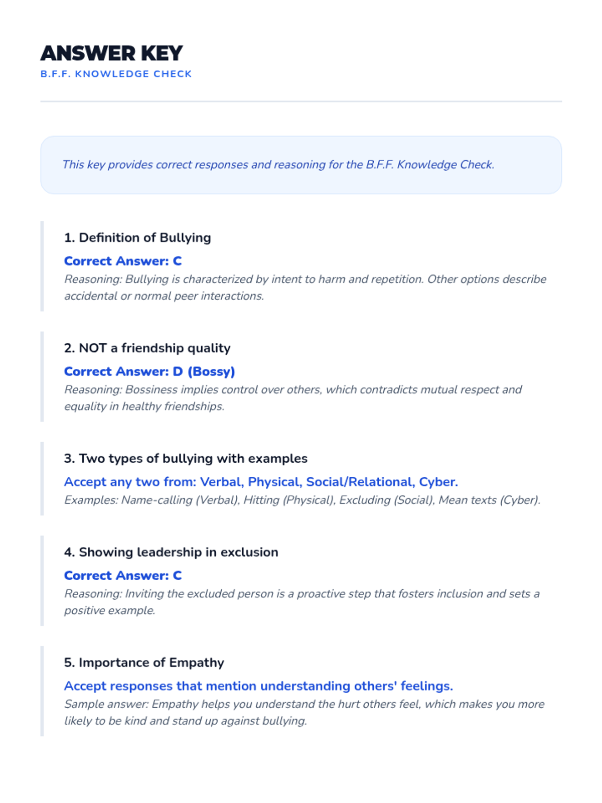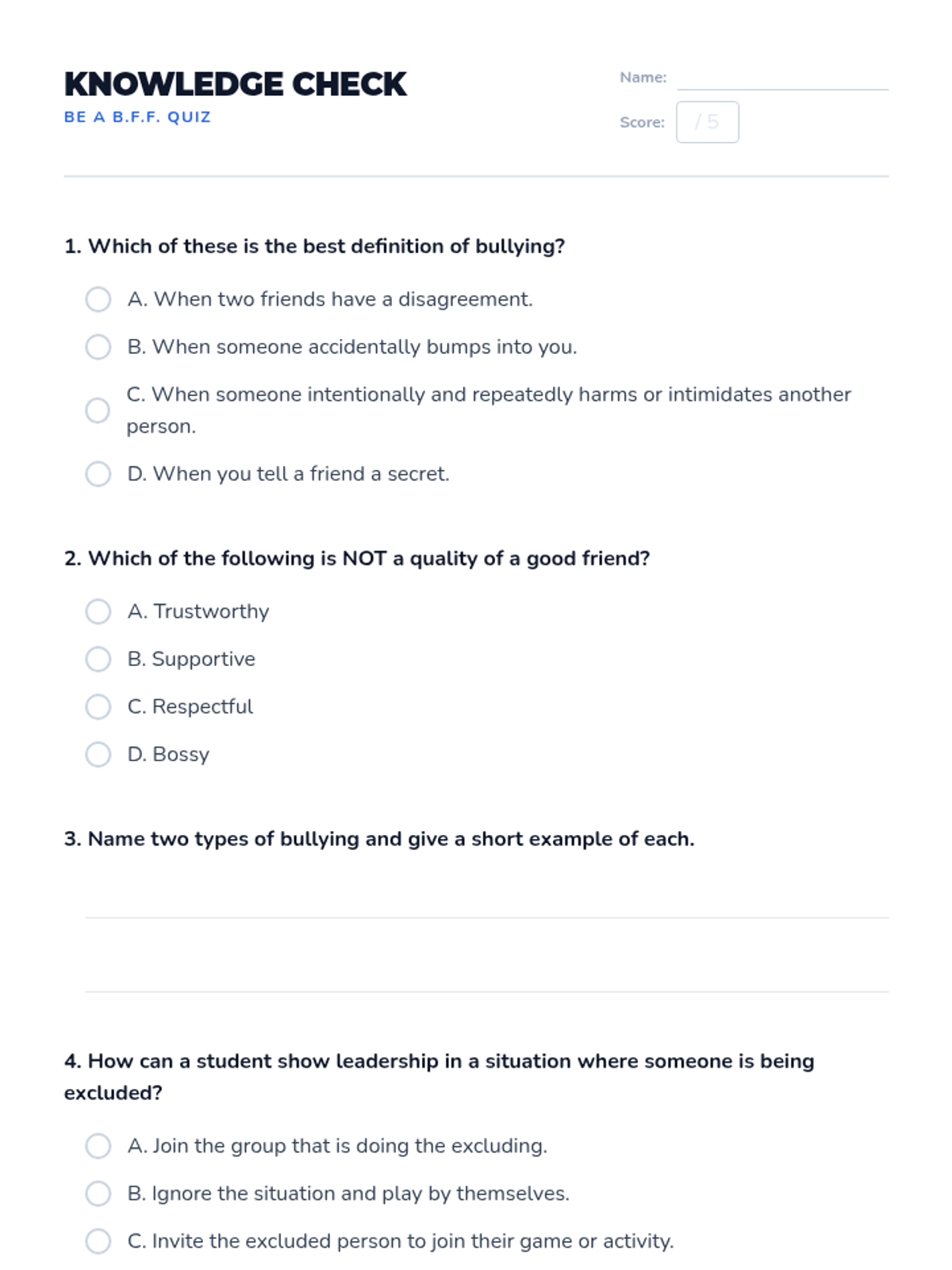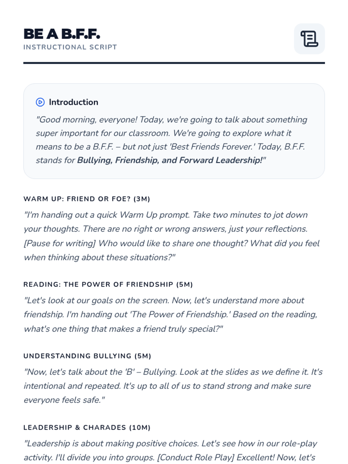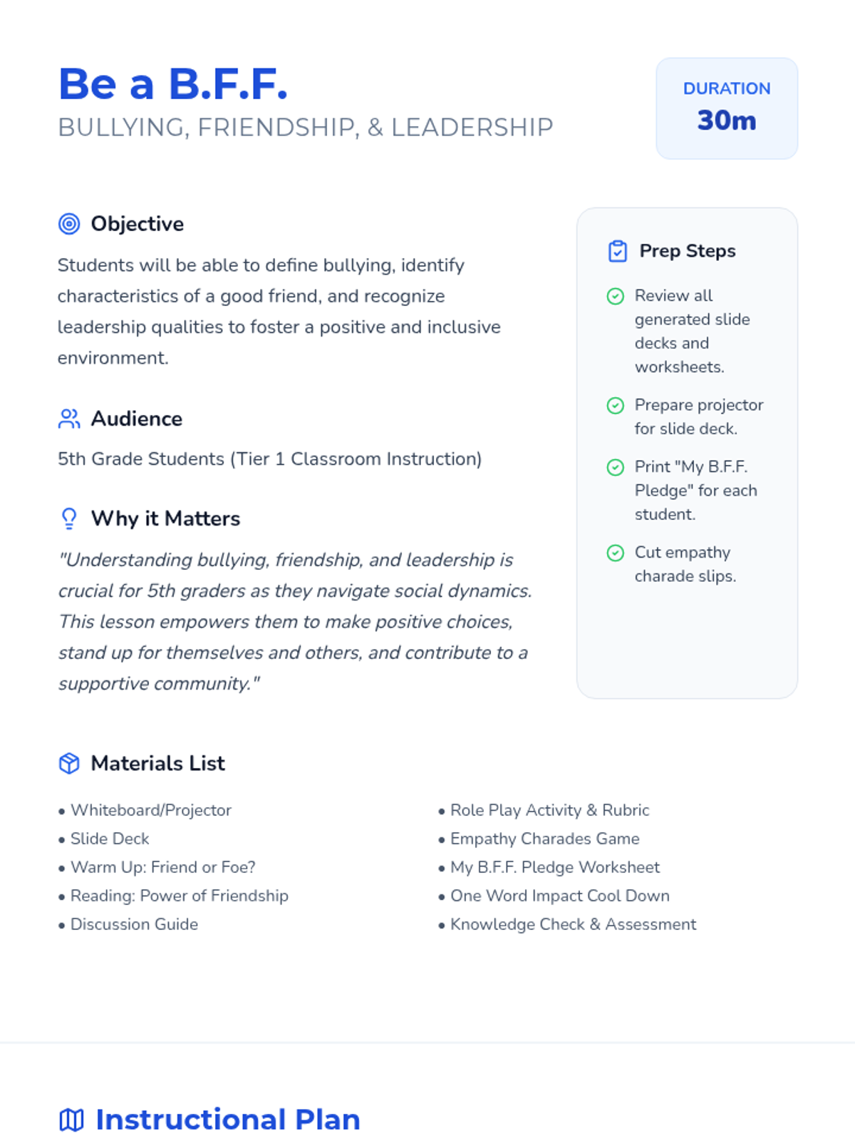 This 30-minute lesson for 5th-grade students explores the critical concepts of bullying, building strong friendships, and demonstrating positive leadership through interactive discussions and role-play.