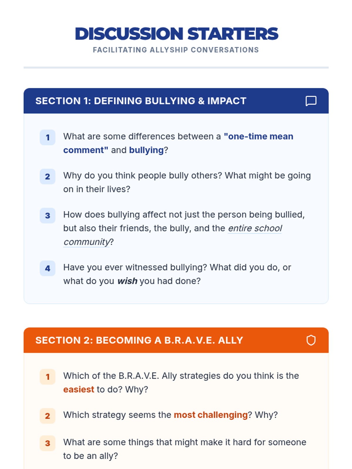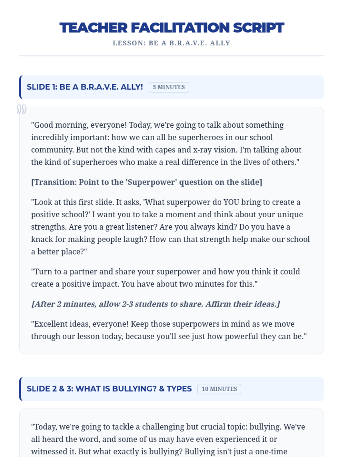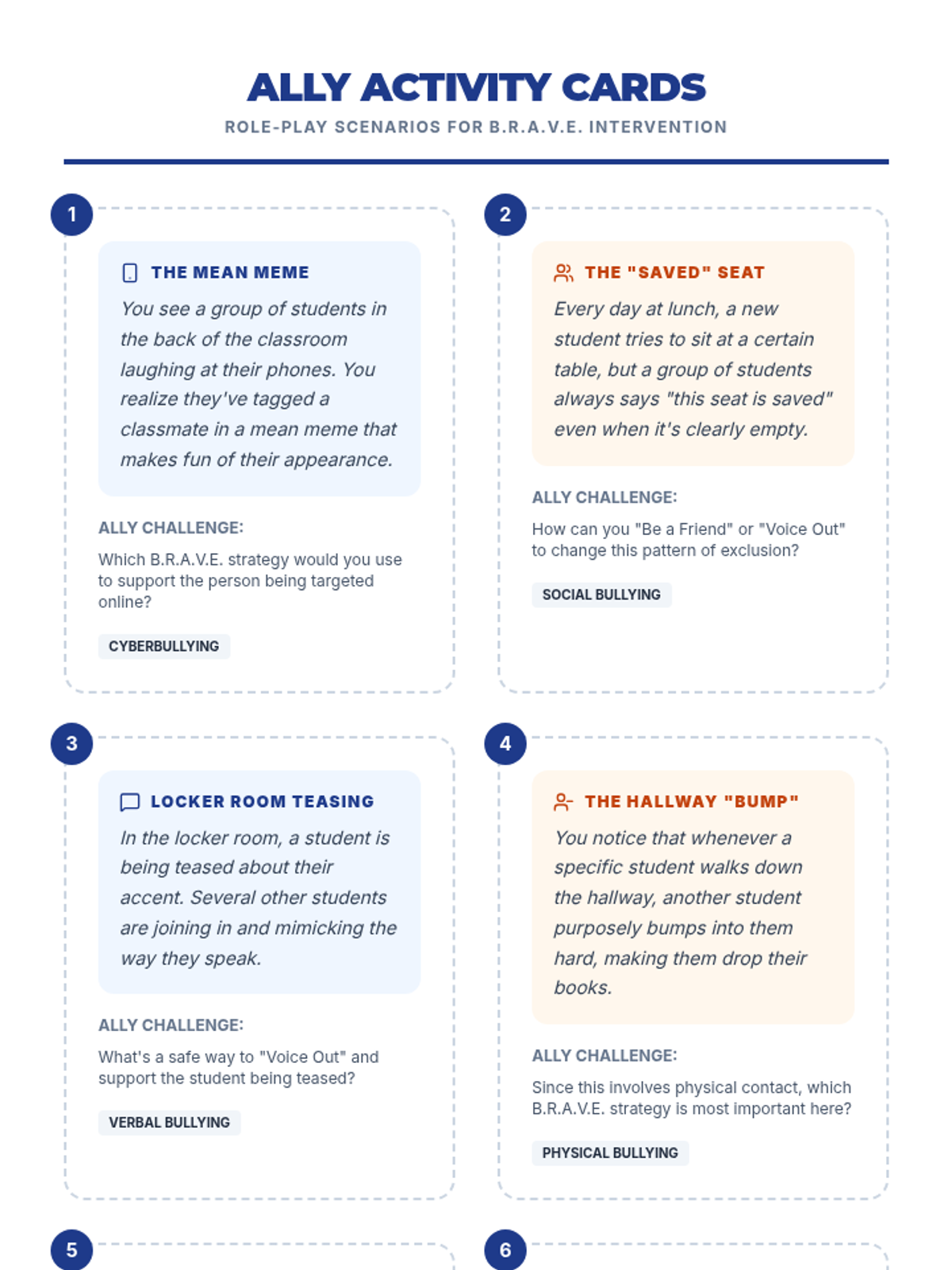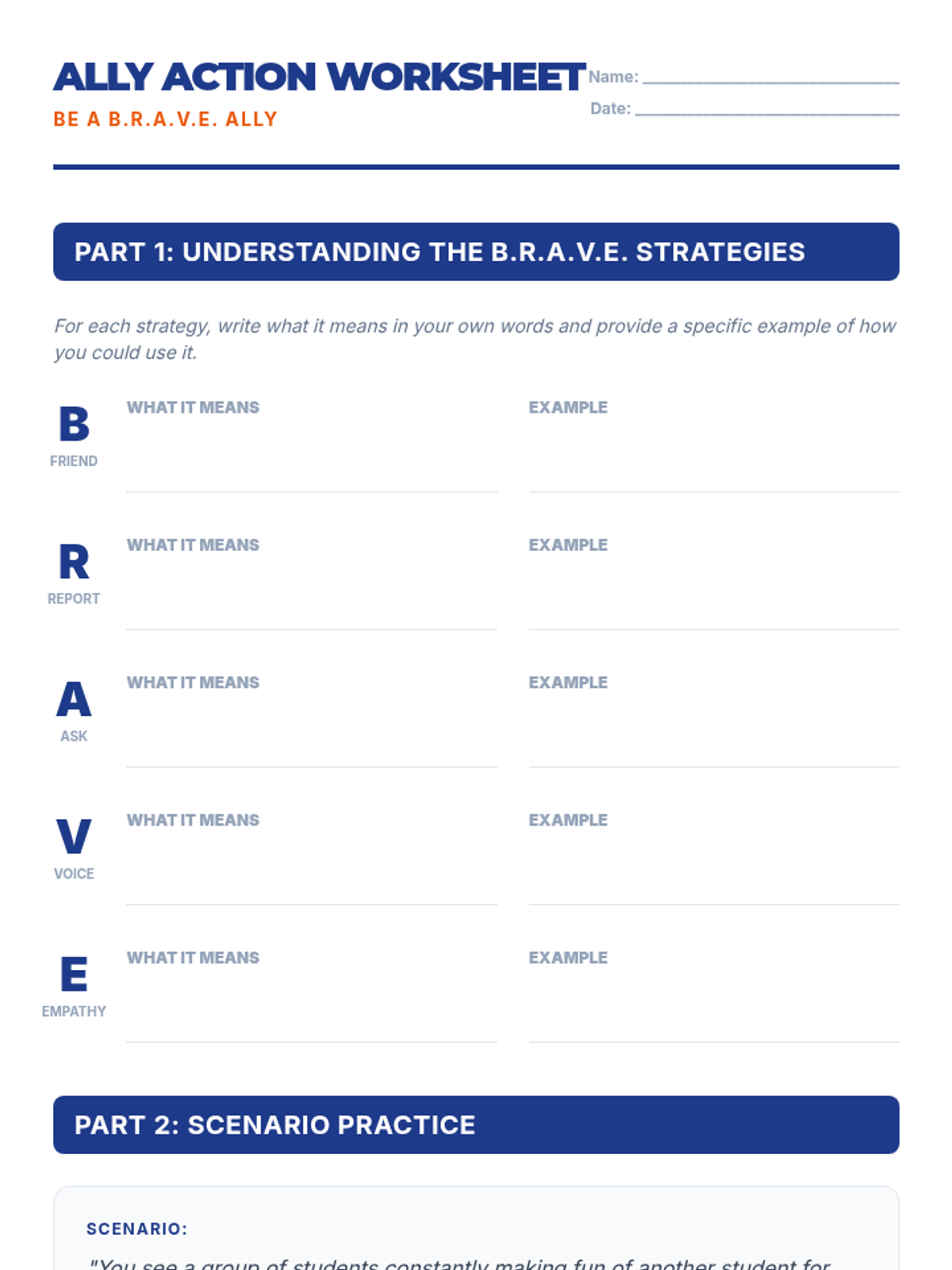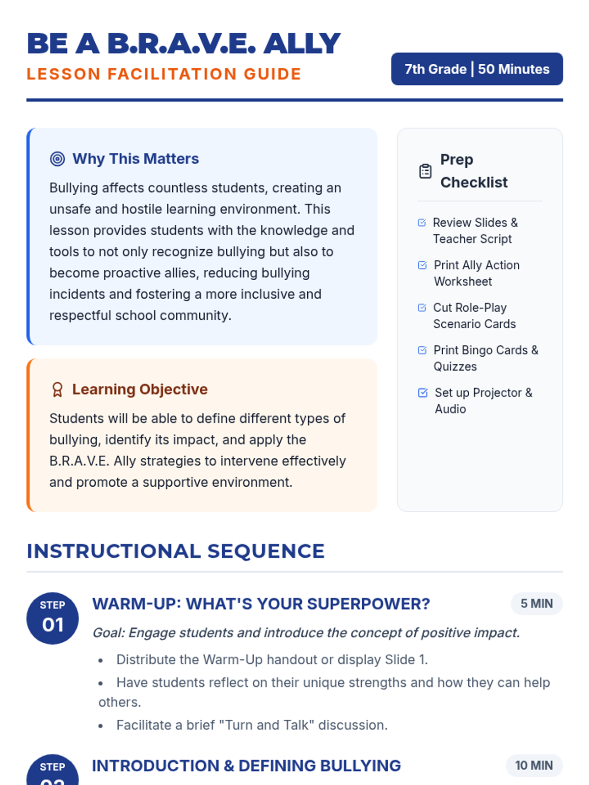 A comprehensive 50-minute lesson for 7th graders designed to transform bystanders into active allies. Students learn to identify bullying types, understand its impact, and apply the B.R.A.V.E. framework (Be a friend, Report, Ask for help, Voice out, Empathize) through role-play, discussion, and reflection.