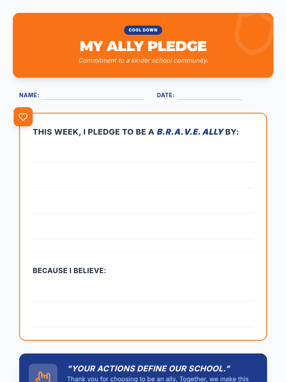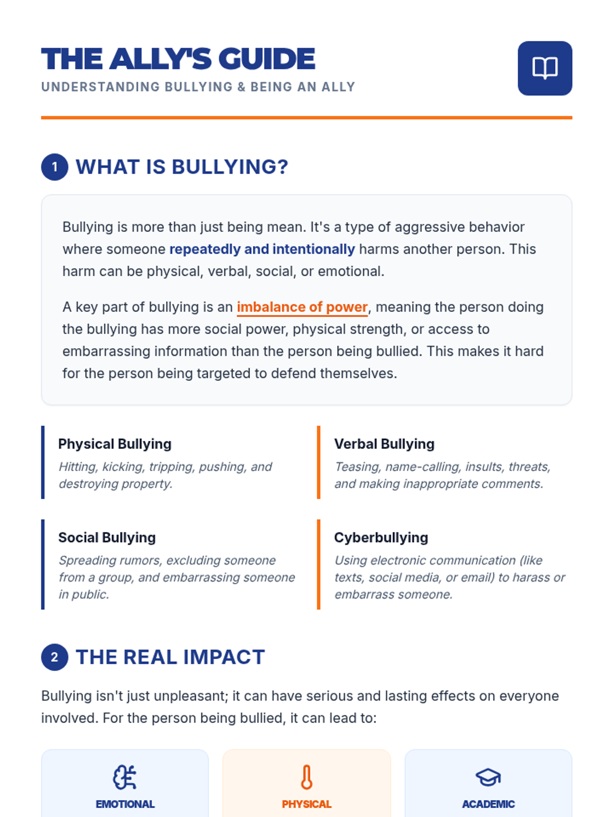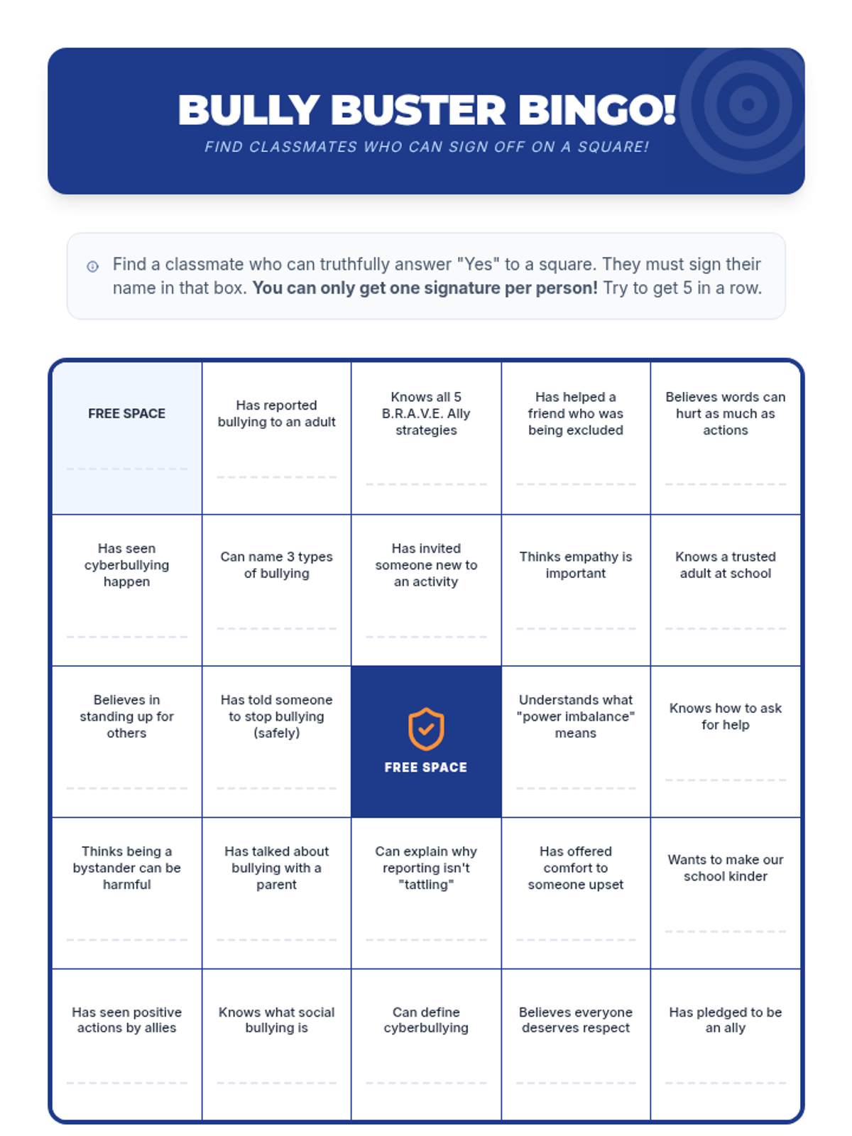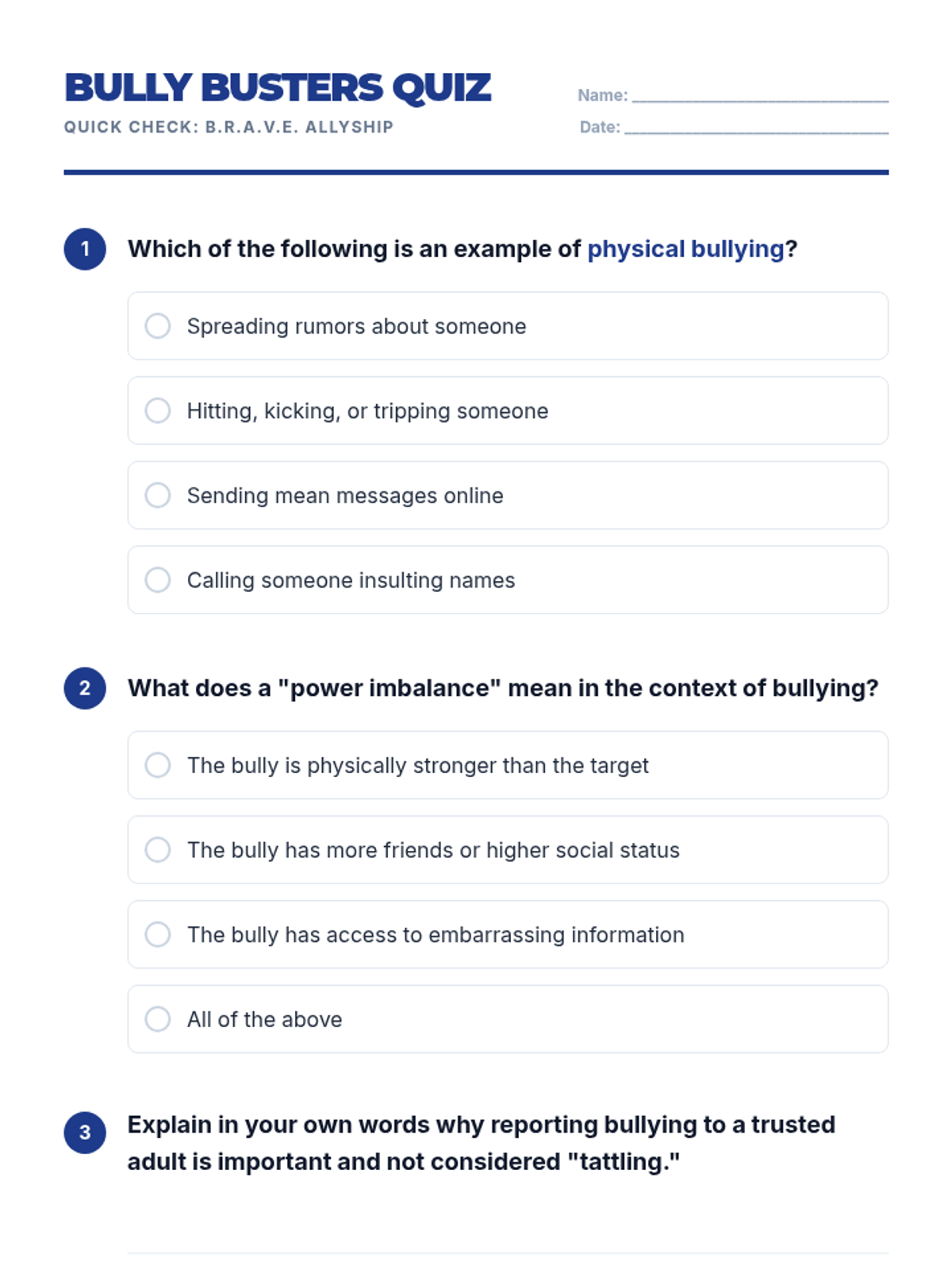 A comprehensive 50-minute lesson for 7th graders designed to transform bystanders into active allies. Students learn to identify bullying types, understand its impact, and apply the B.R.A.V.E. framework (Be a friend, Report, Ask for help, Voice out, Empathize) through role-play, discussion, and reflection.