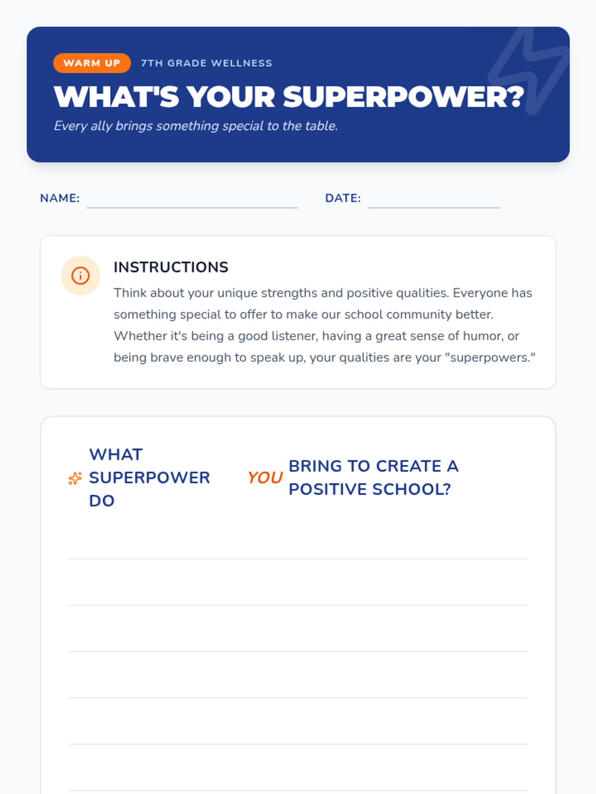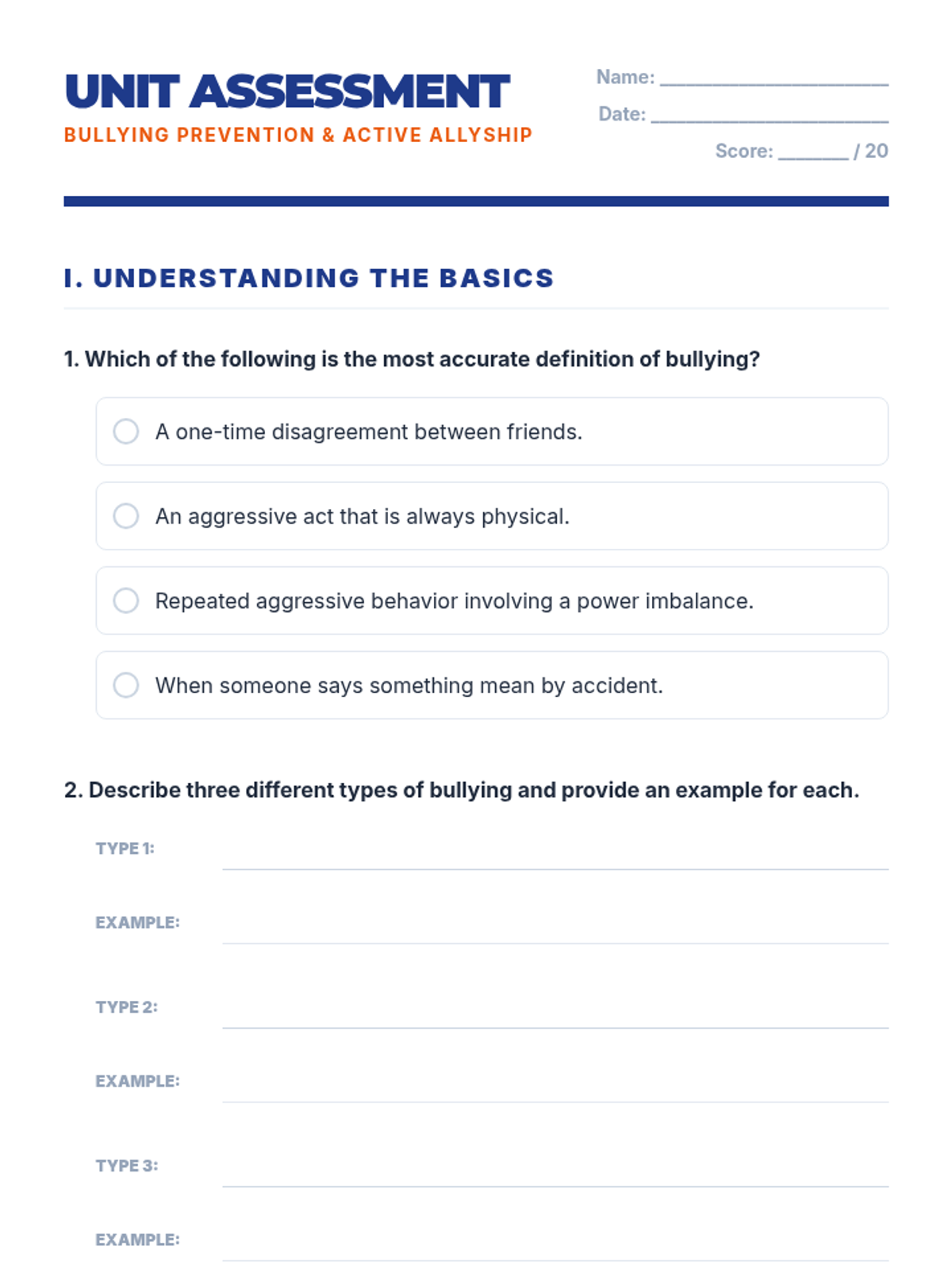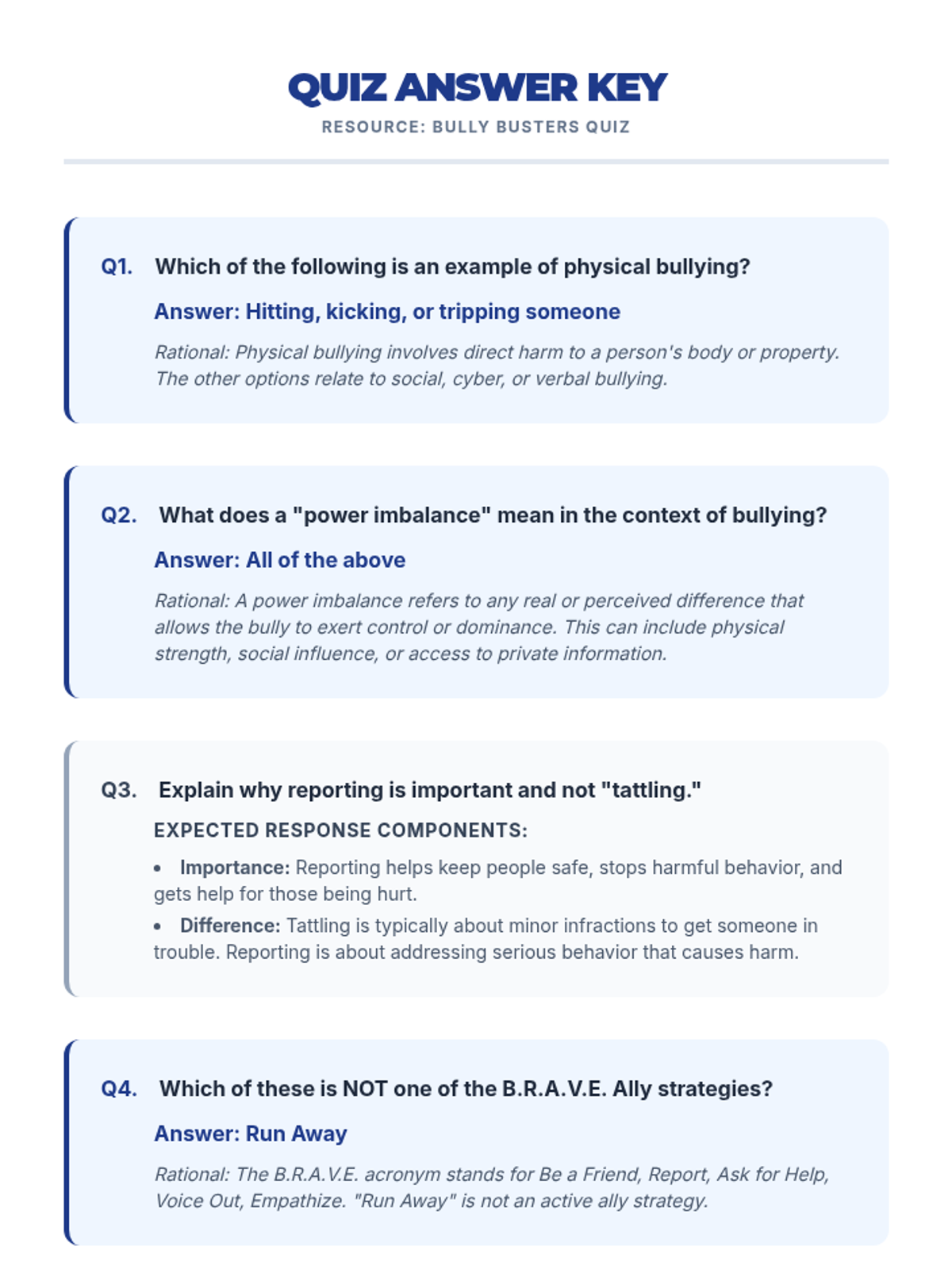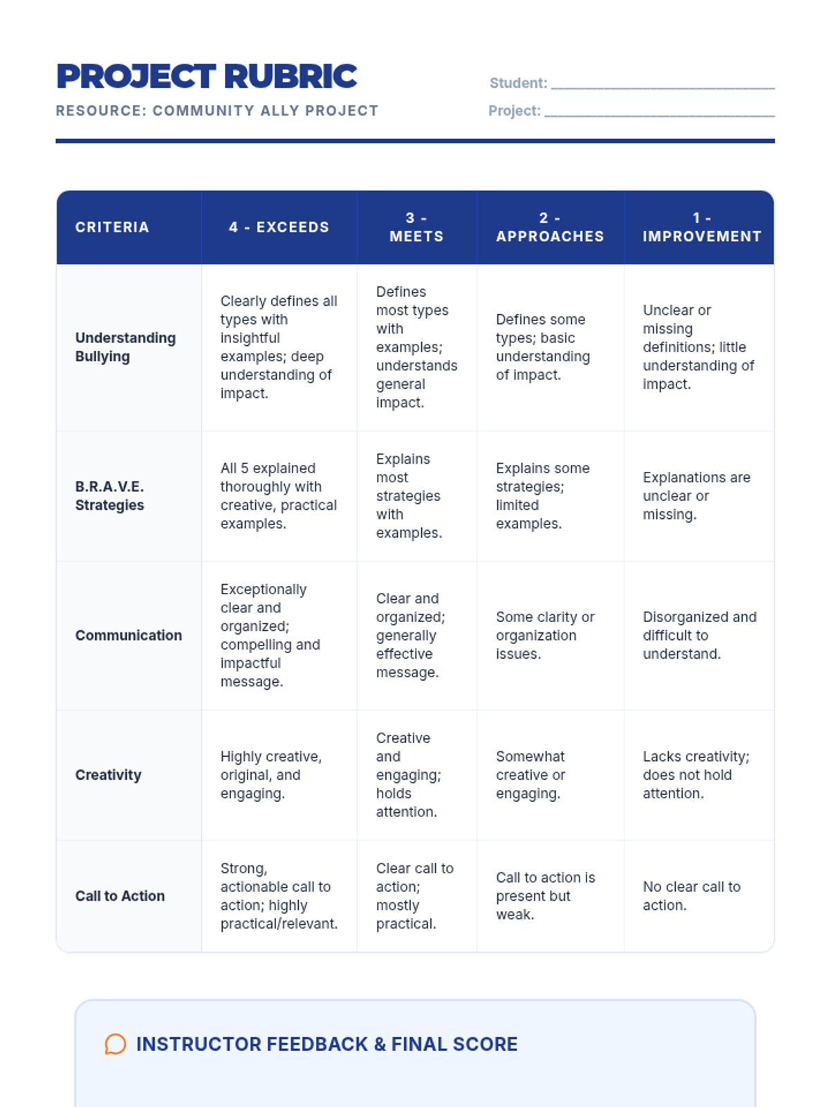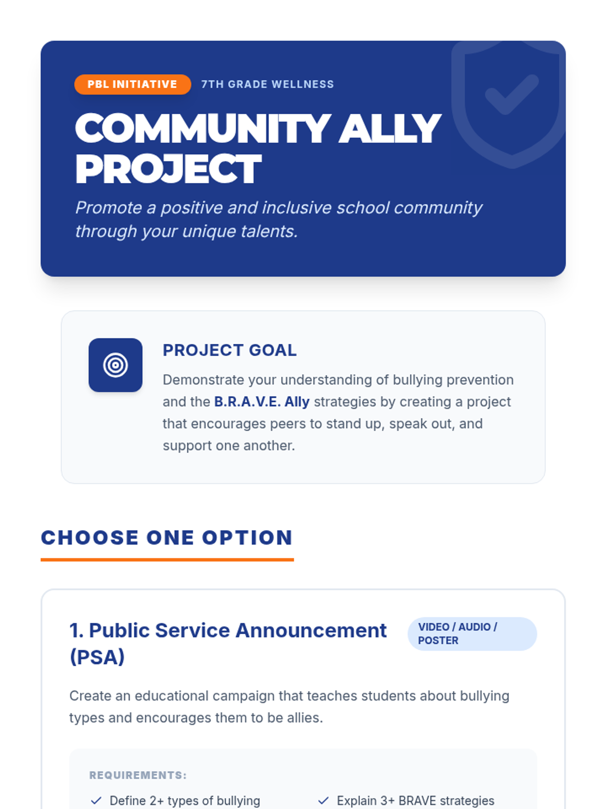 A comprehensive 50-minute lesson for 7th graders designed to transform bystanders into active allies. Students learn to identify bullying types, understand its impact, and apply the B.R.A.V.E. framework (Be a friend, Report, Ask for help, Voice out, Empathize) through role-play, discussion, and reflection.