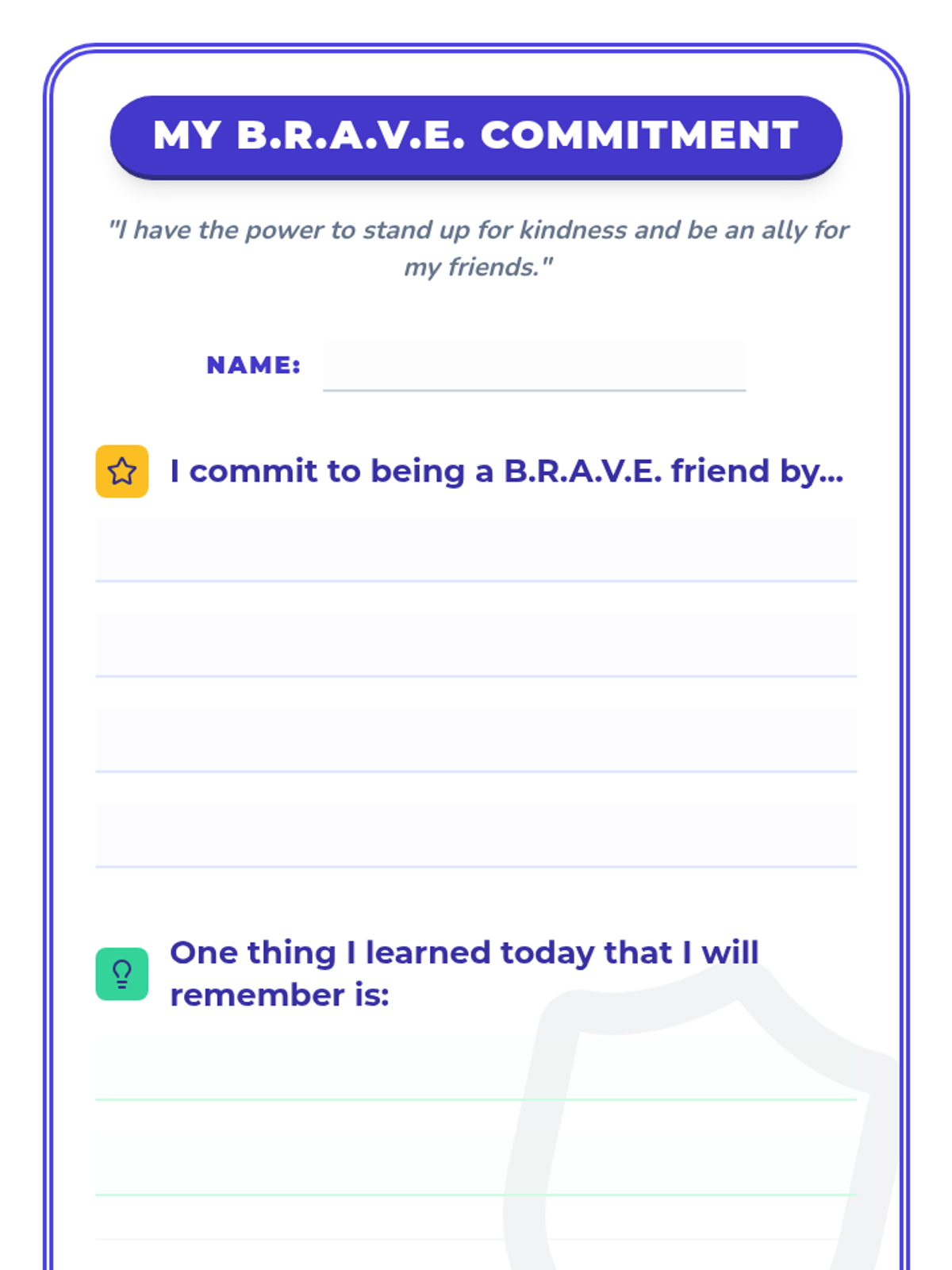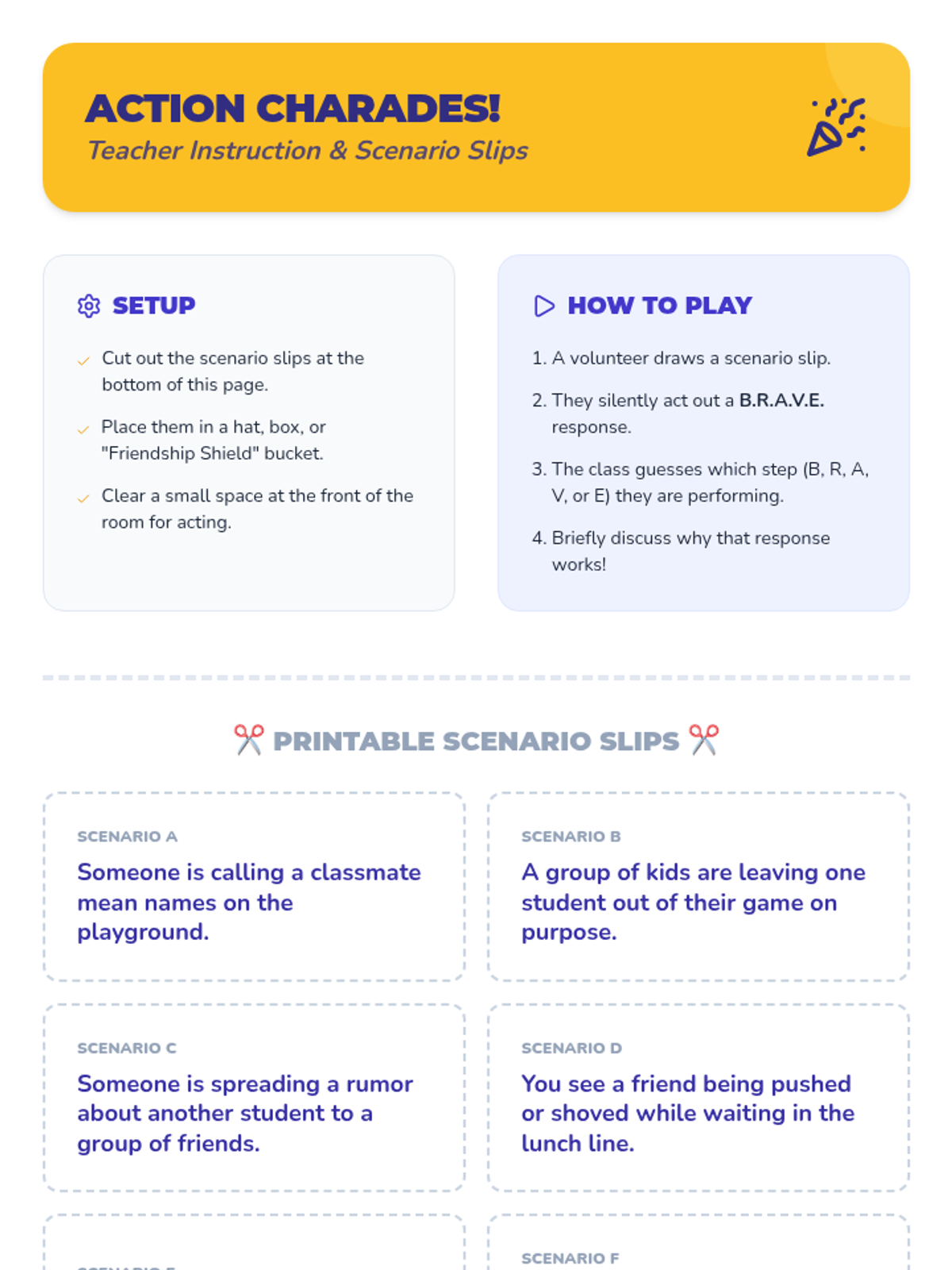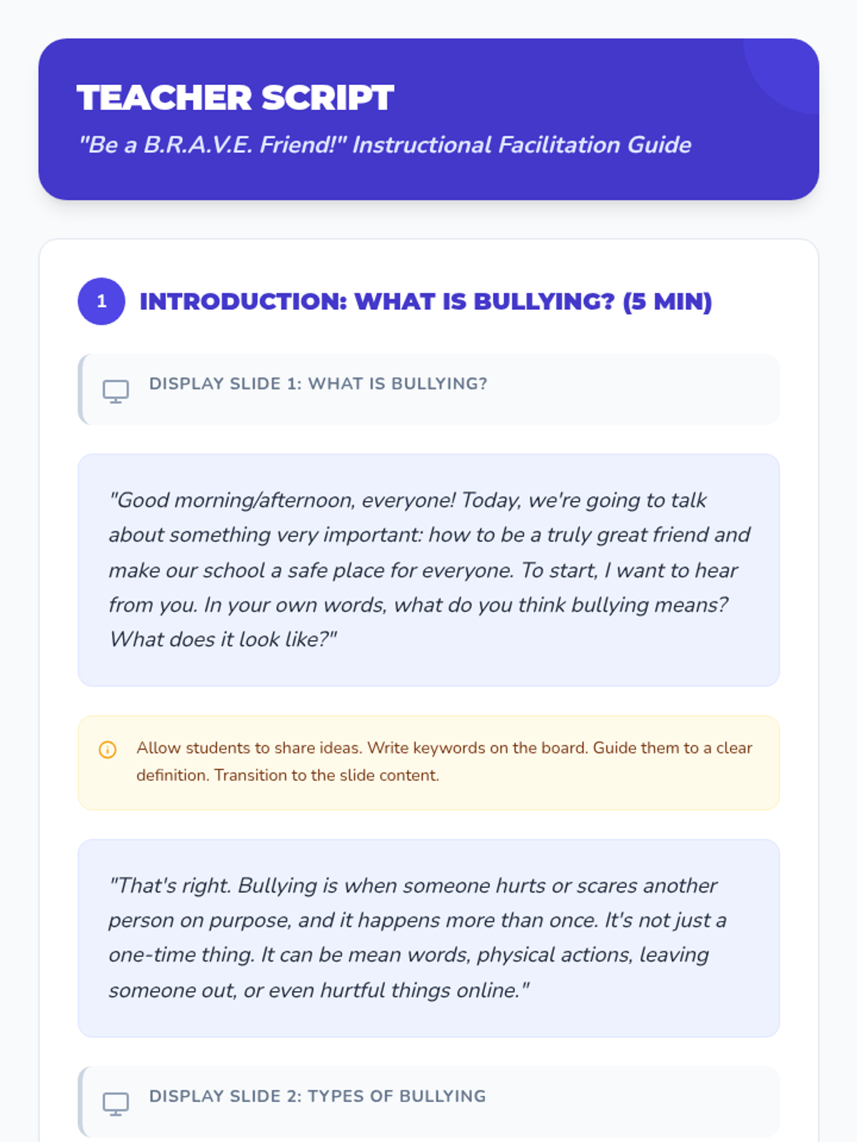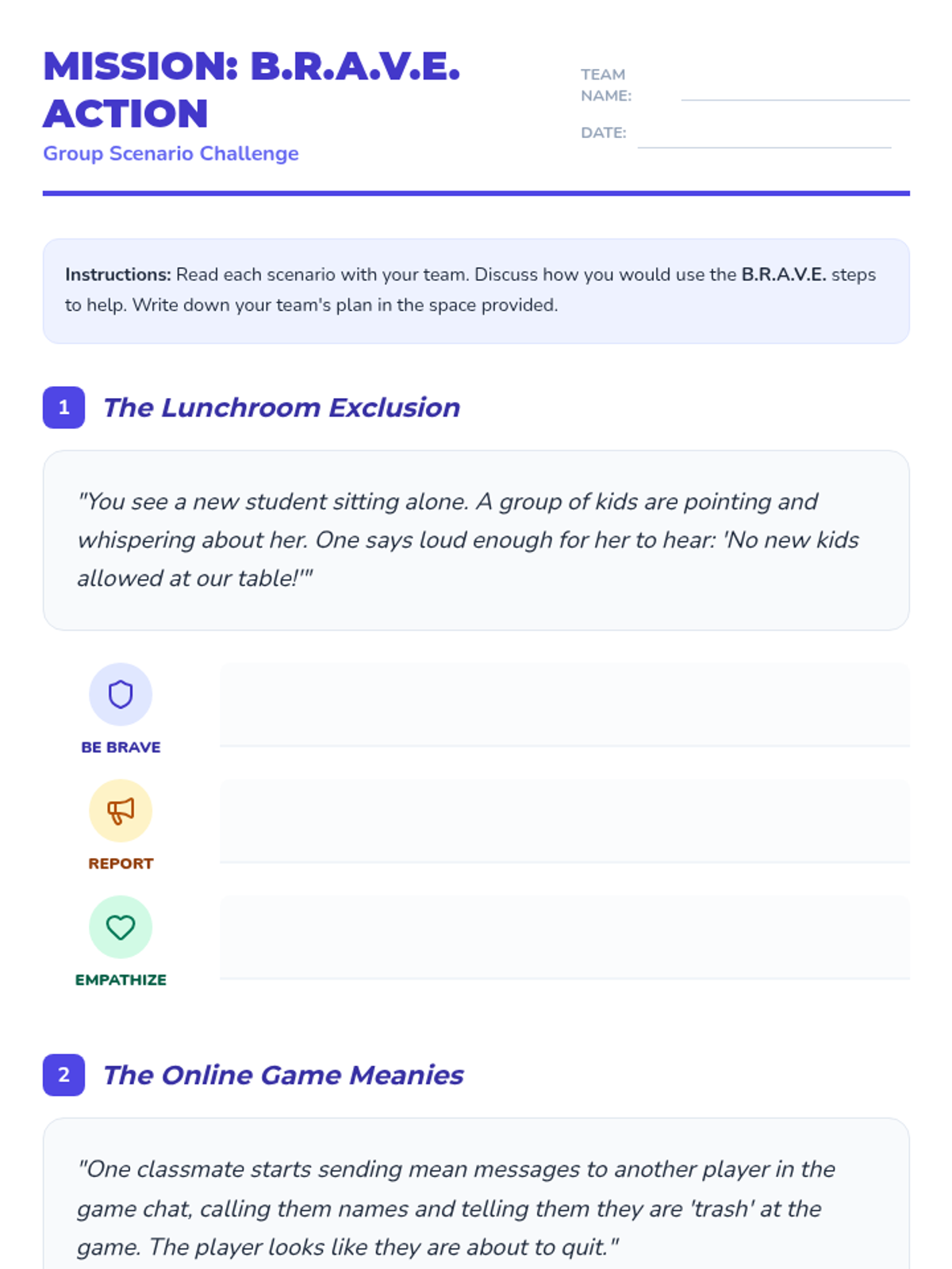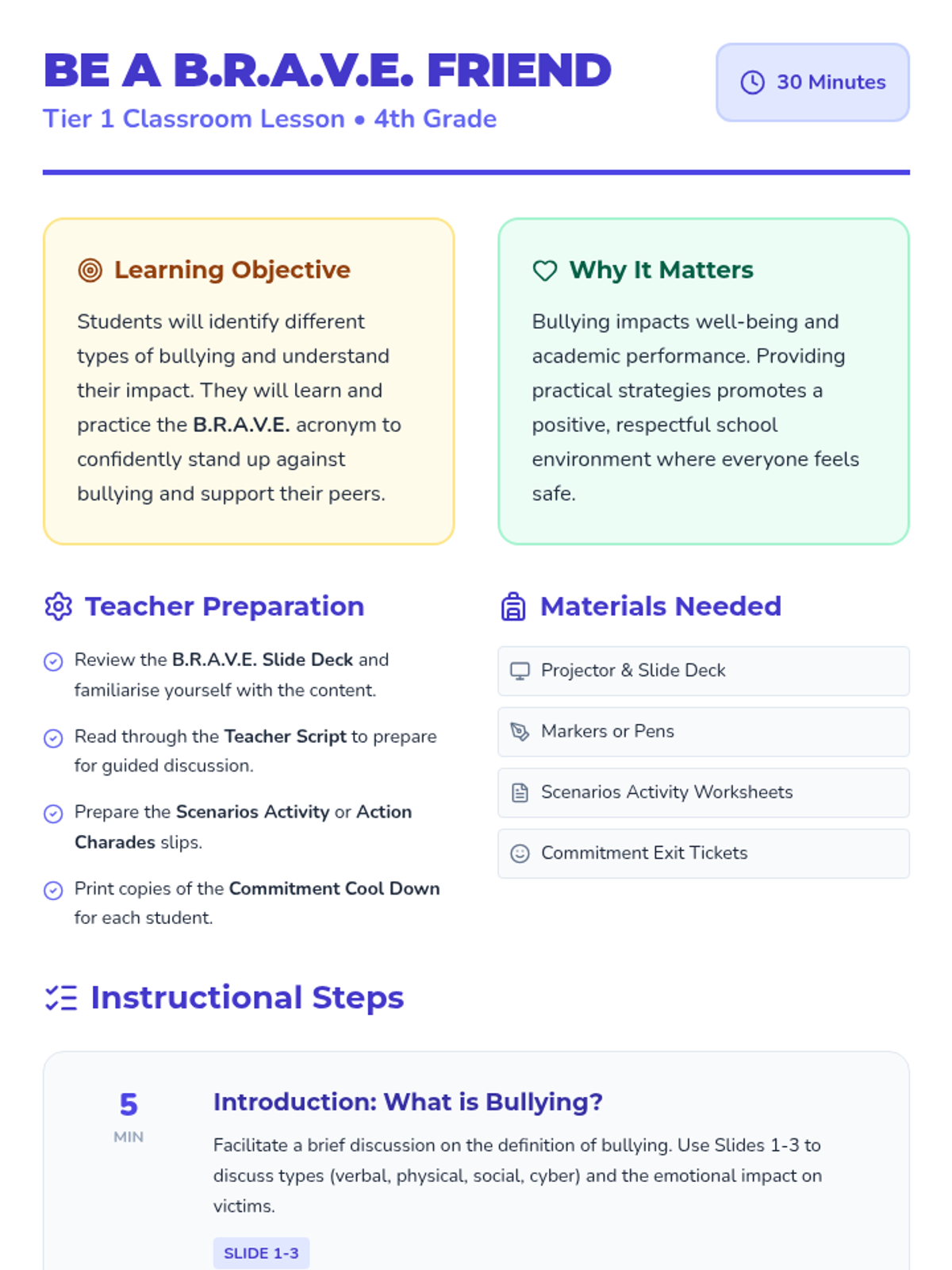 A 30-minute lesson for 4th-grade students that teaches the B.R.A.V.E. acronym to identify bullying and empower students to become proactive allies in their school community.