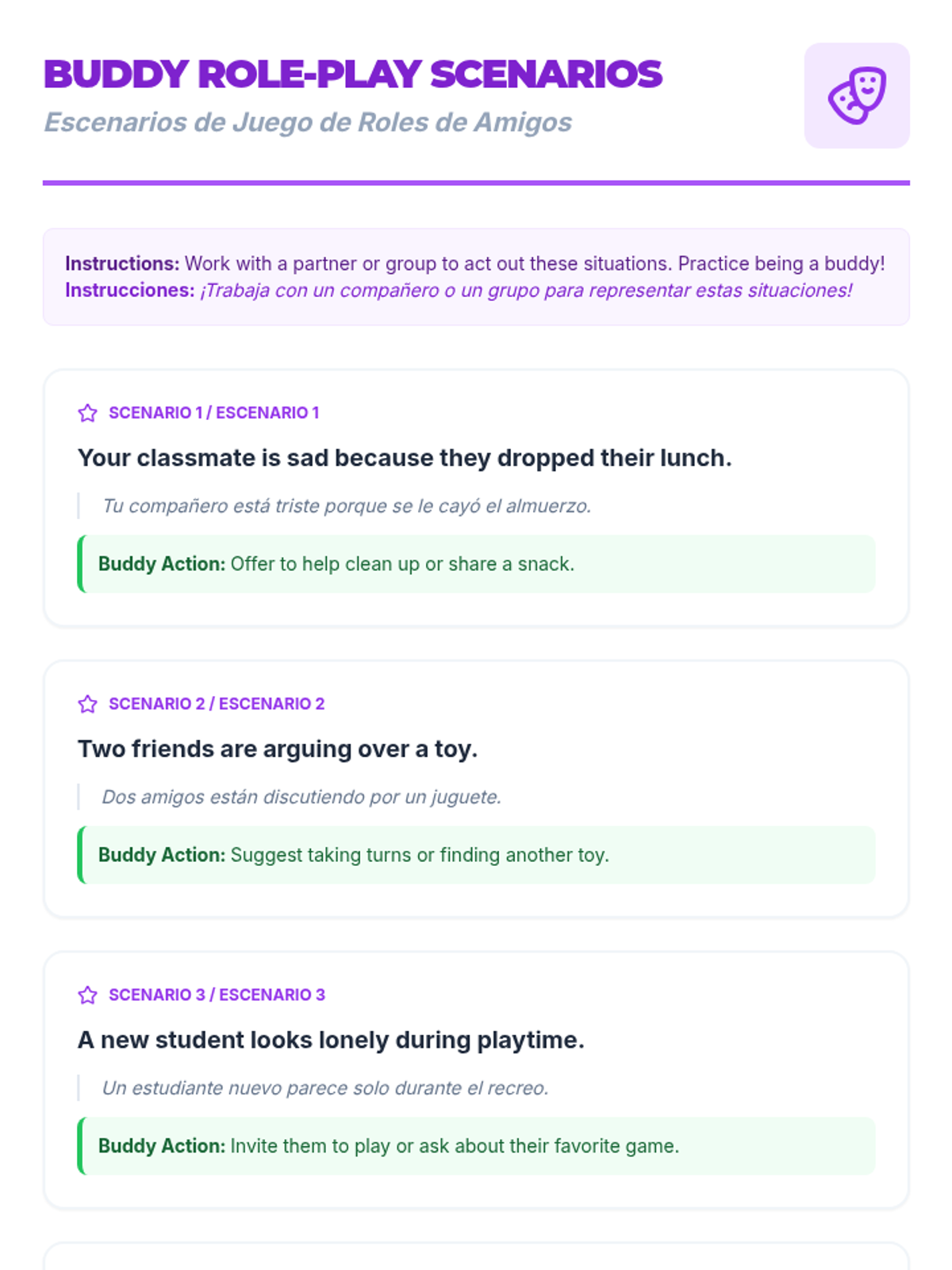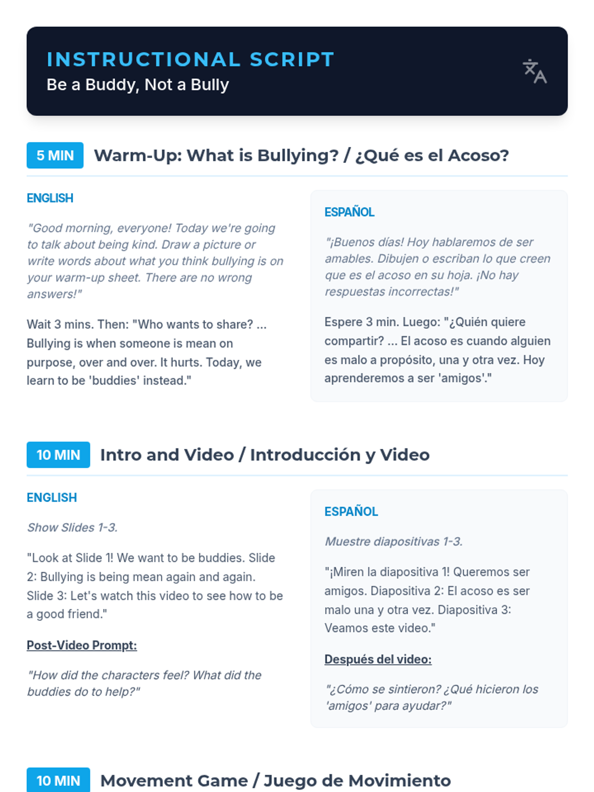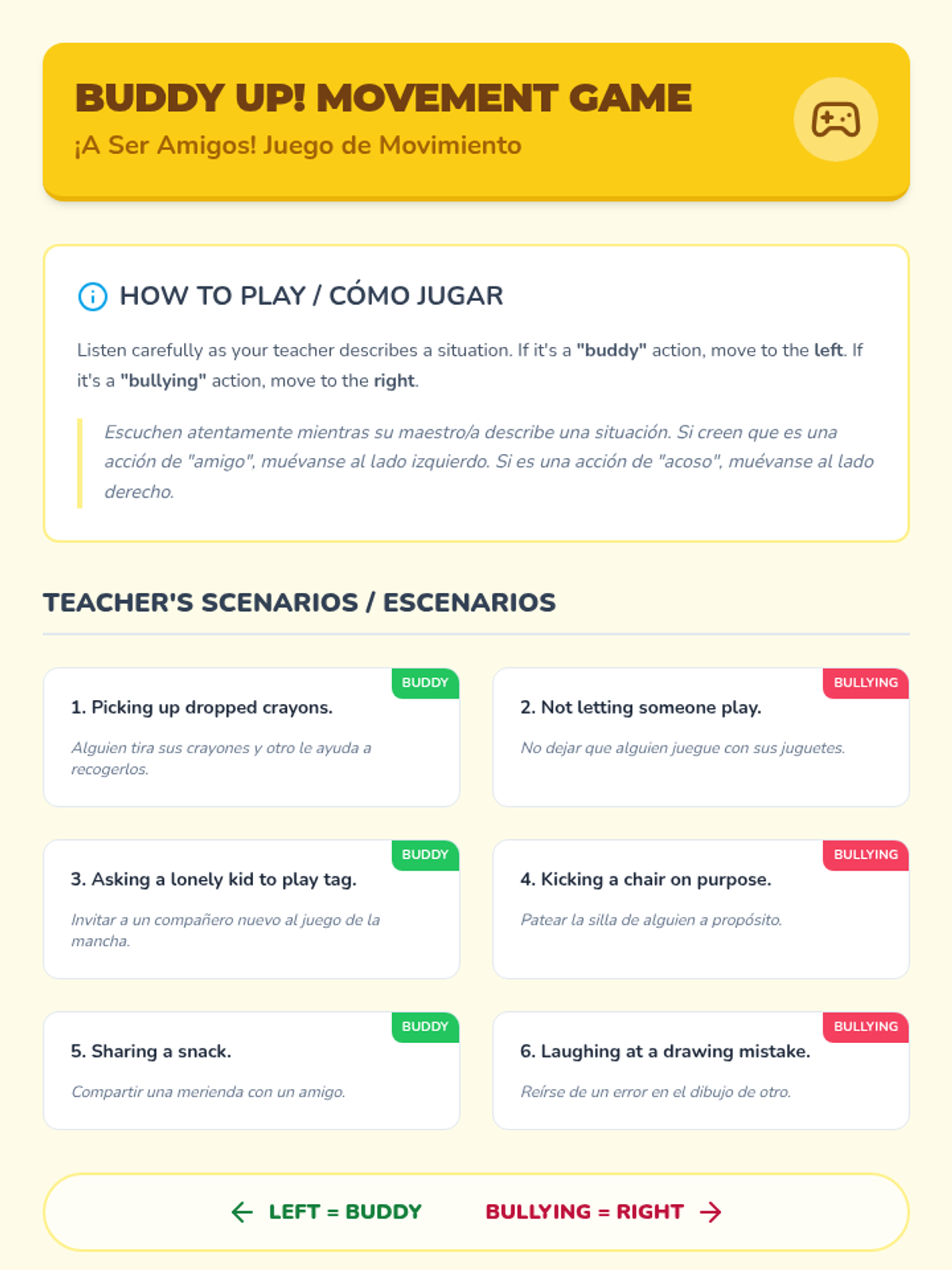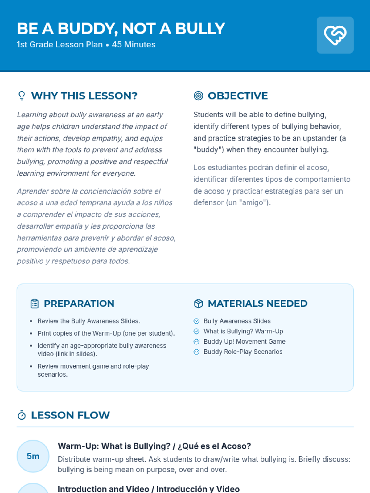 A 45-minute 1st Grade lesson designed to help students define bullying, identify hurtful behaviors, and practice being an 'upstander' (a buddy) through interactive games and role-play.
