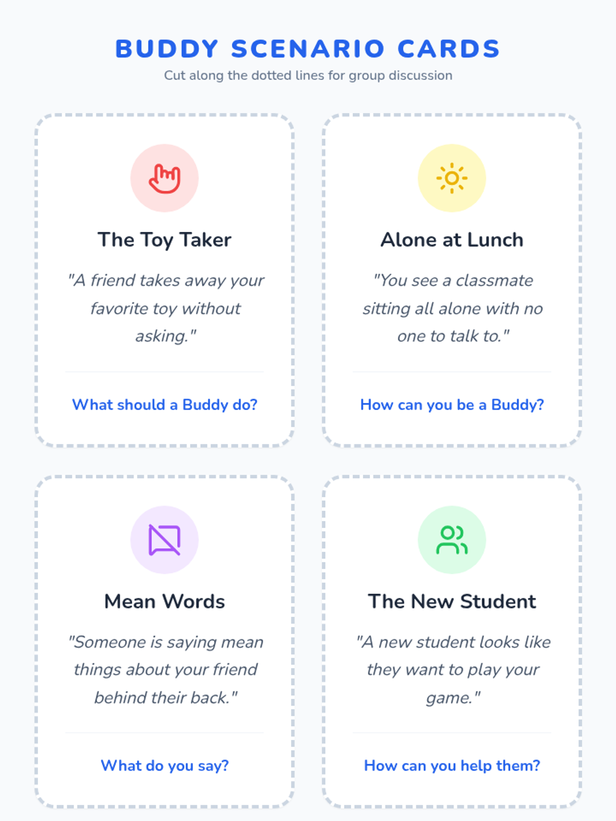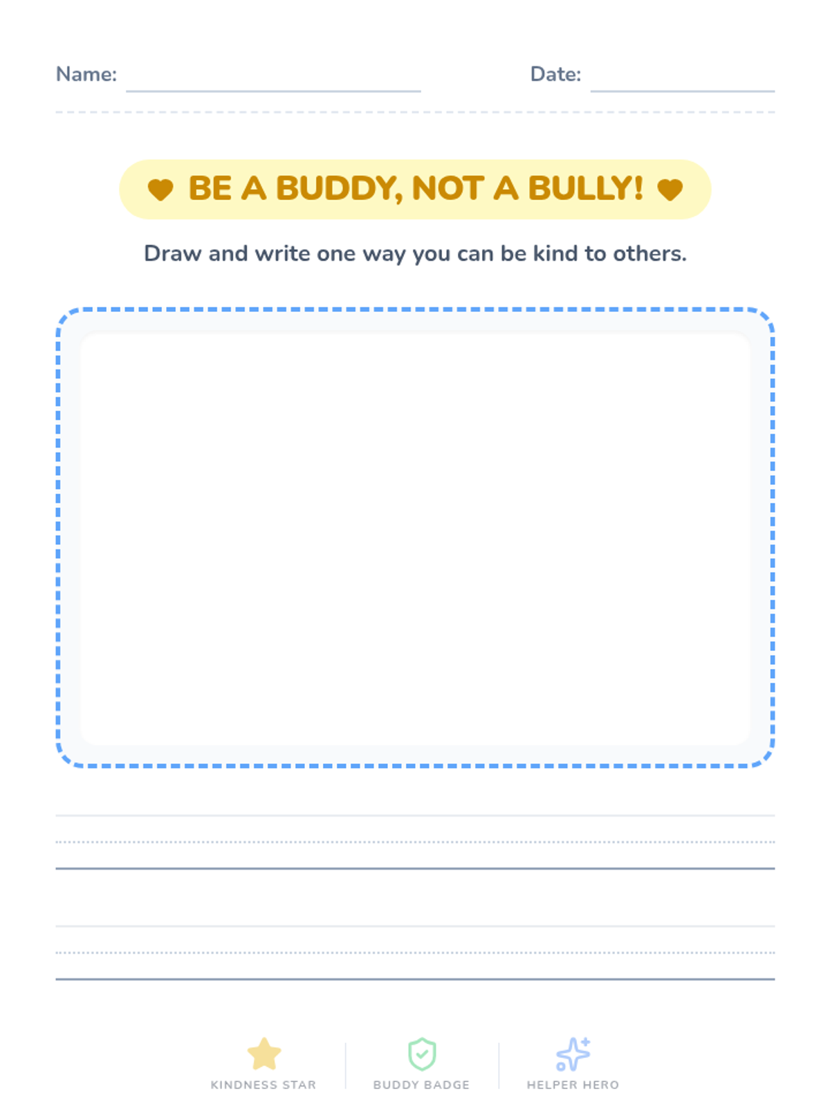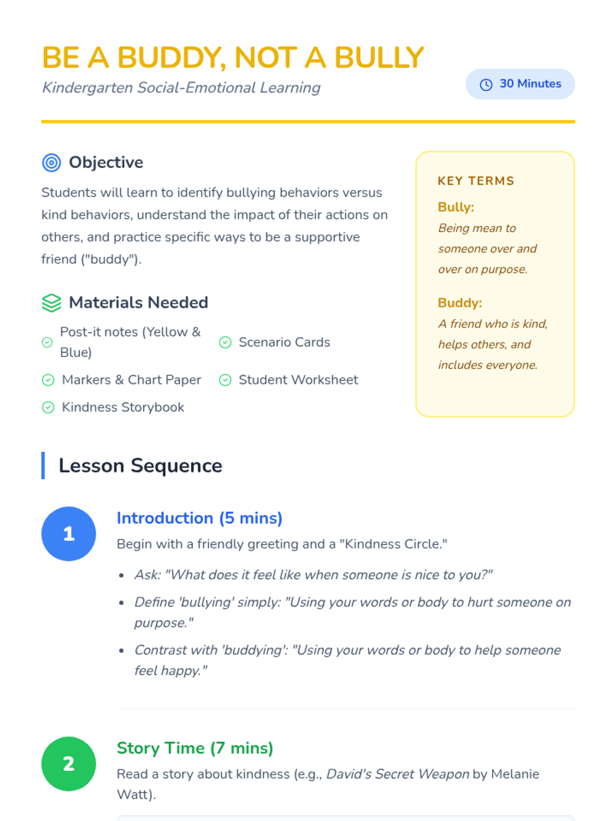 A Kindergarten lesson focused on identifying bullying behaviors and practicing kindness through stories, discussions, and creative activities.