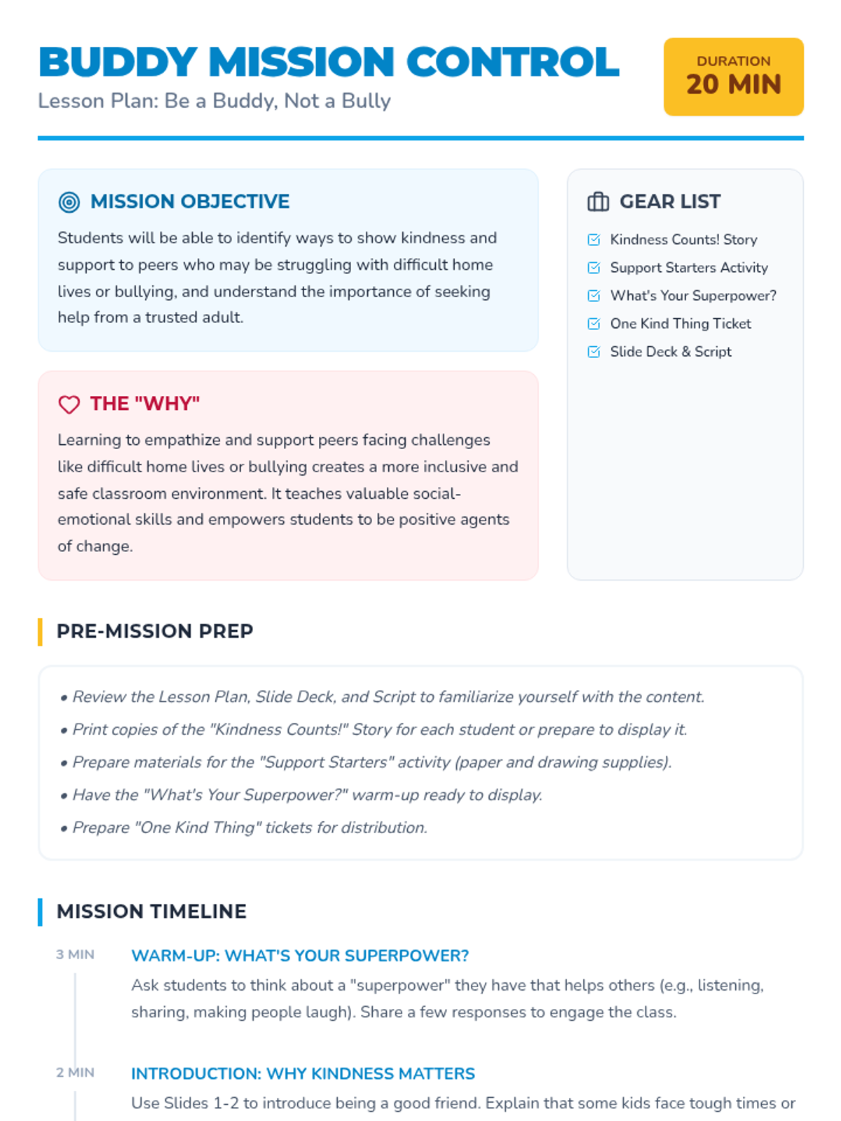 A 20-minute SEL lesson for 3rd graders focusing on empathy, recognizing peer distress, and becoming supportive allies against bullying.