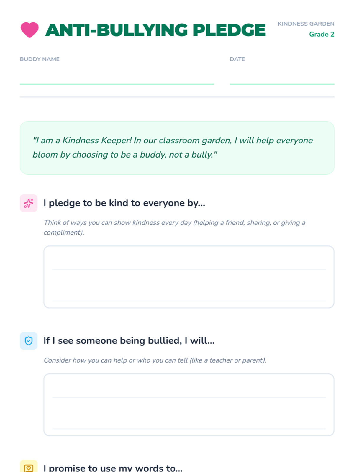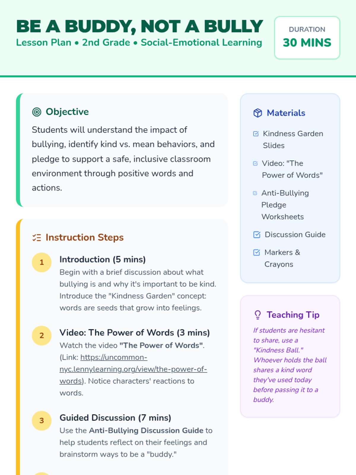 A 30-minute interactive lesson for 2nd graders to learn about bullying, empathy, and the power of kindness using video and creative pledging activities.