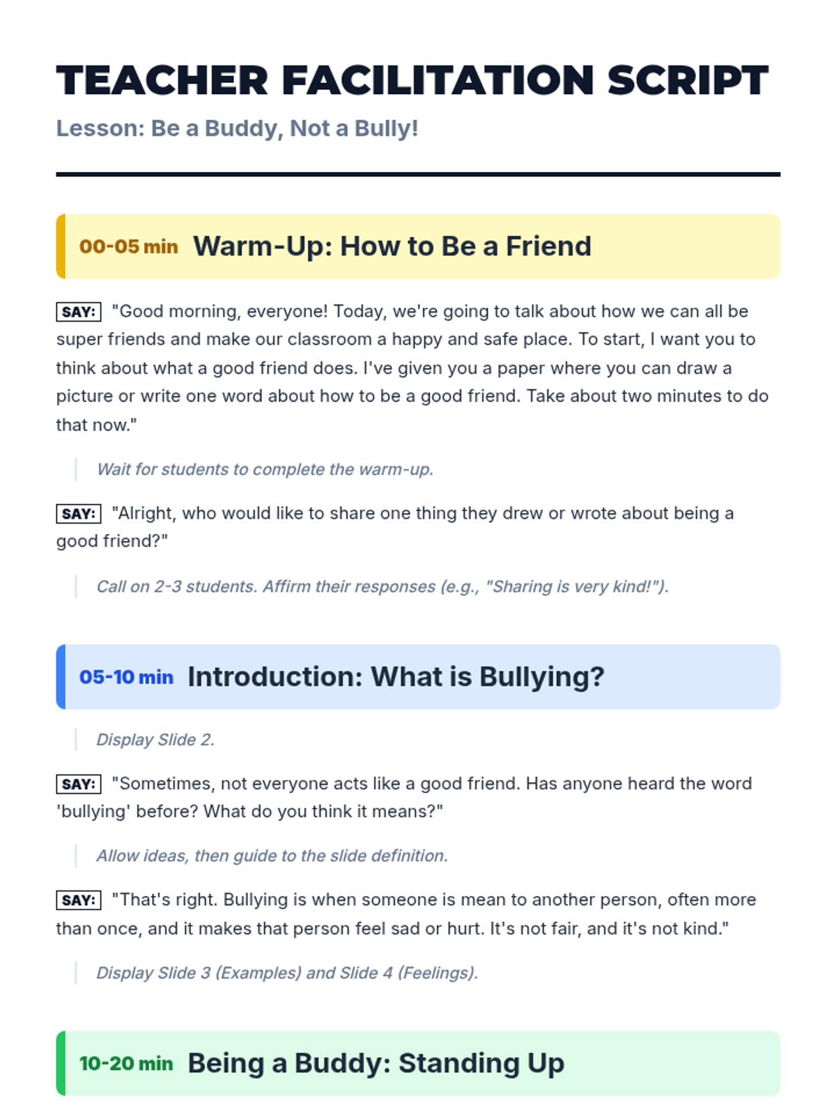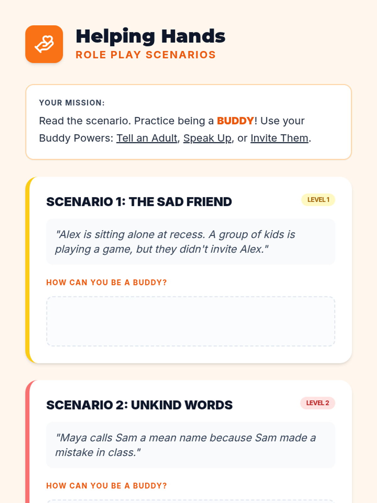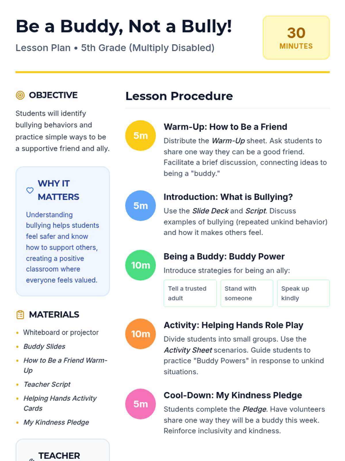 A 30-minute lesson for 5th-grade multiply disabled students focused on identifying bullying behaviors and practicing kindness and allyship through role-play and reflection.