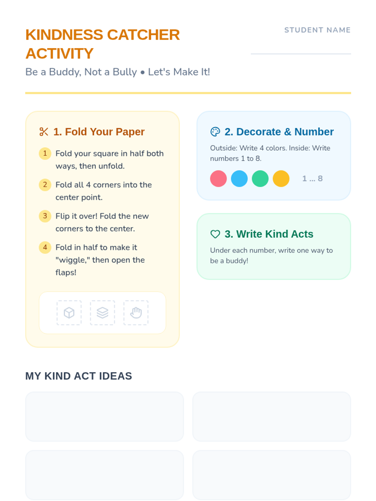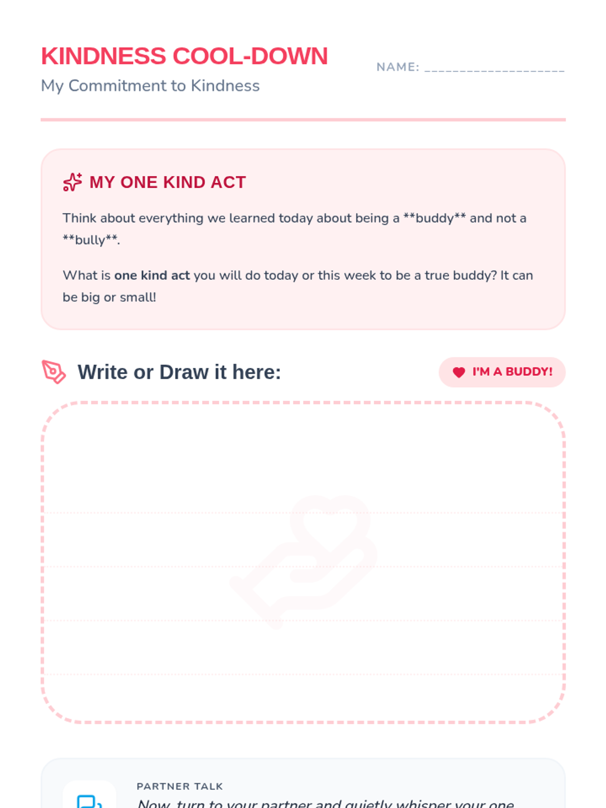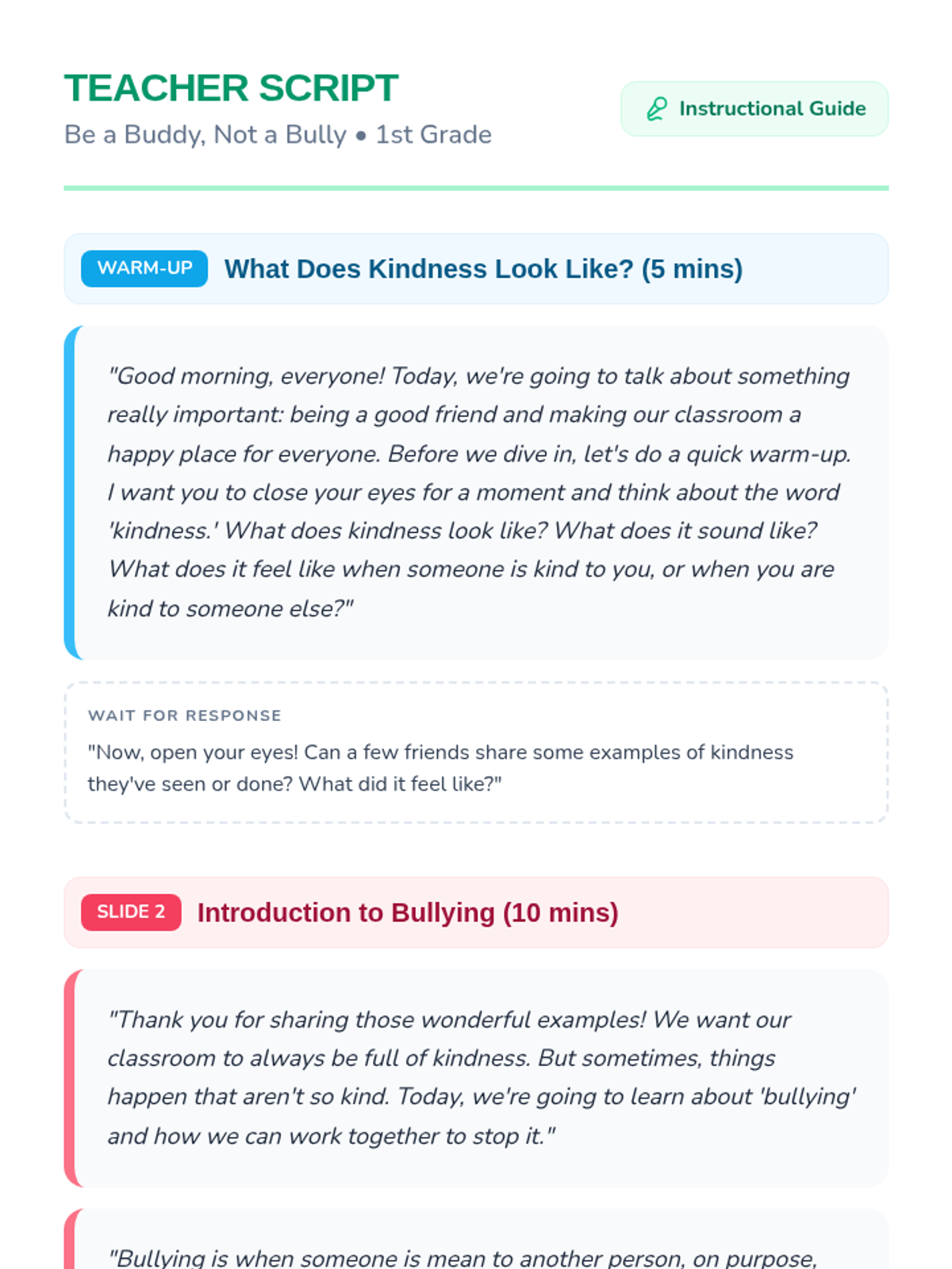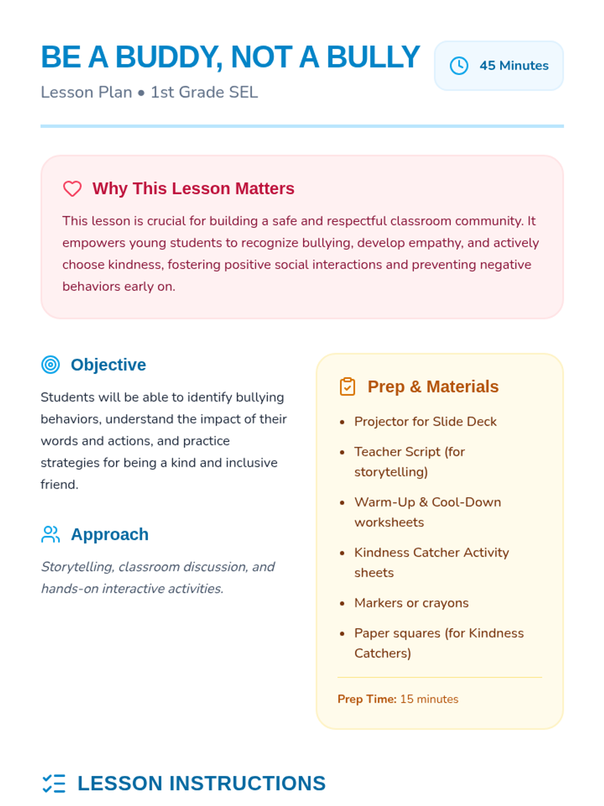 This lesson teaches 1st-grade students to identify bullying behaviors, understand the importance of empathy, and practice strategies for being a kind and inclusive friend through interactive storytelling and activities.