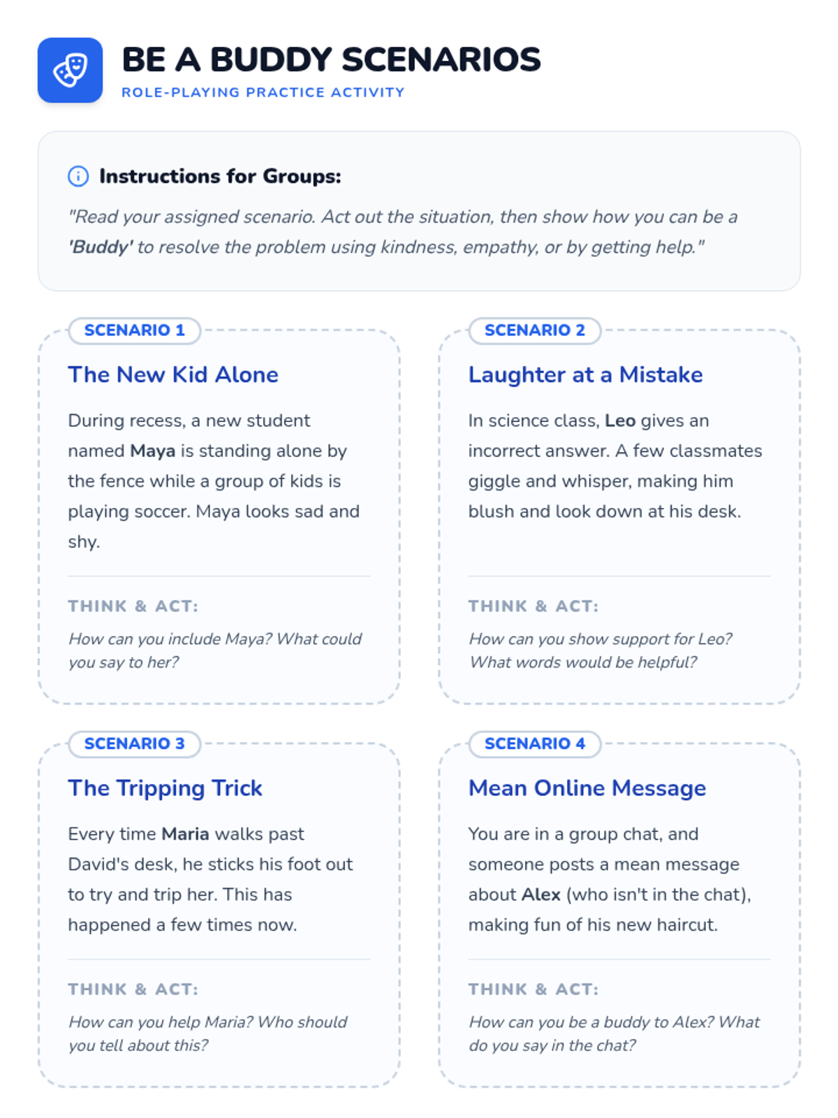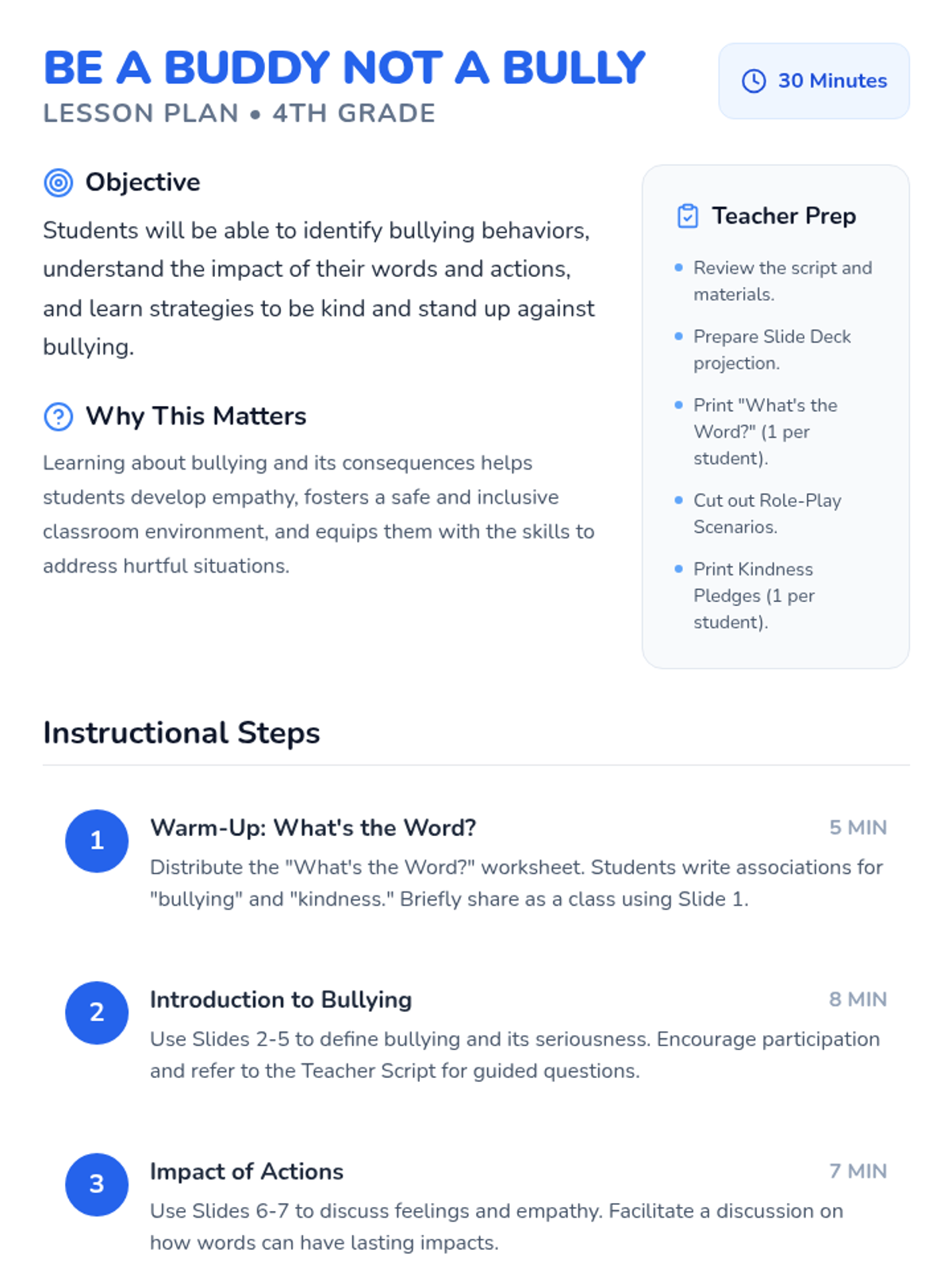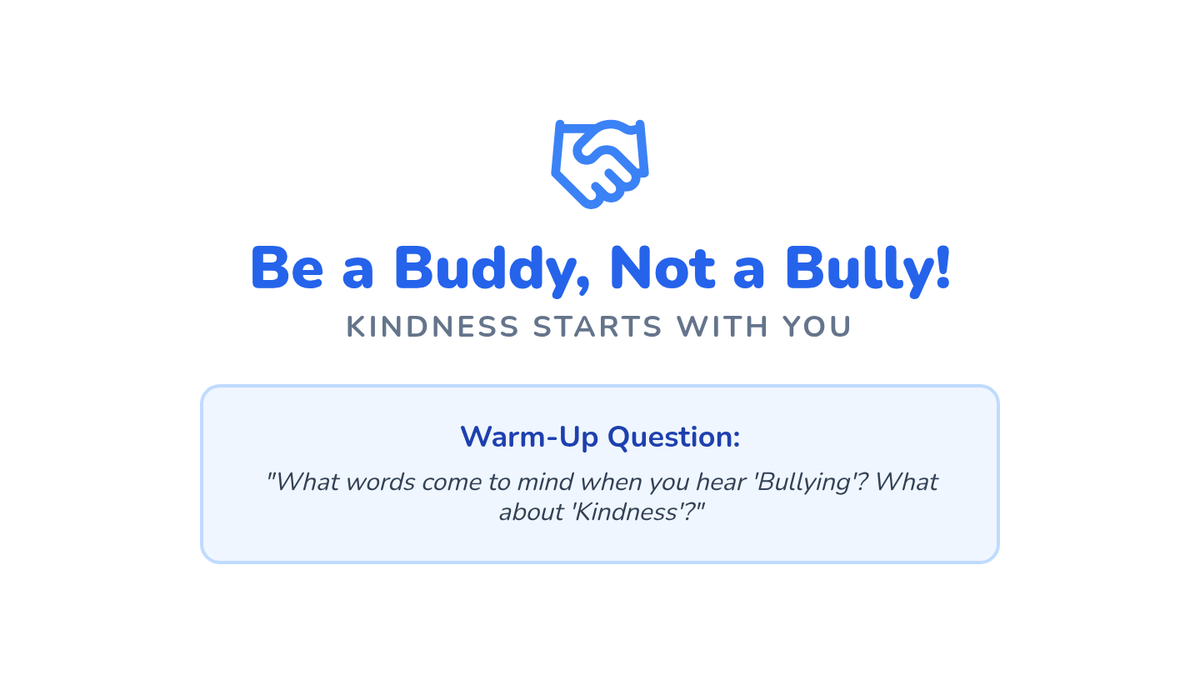 A 30-minute lesson for 4th-grade students focused on identifying bullying behaviors, fostering empathy, and practicing positive 'buddy' interventions through role-play and personal reflection.