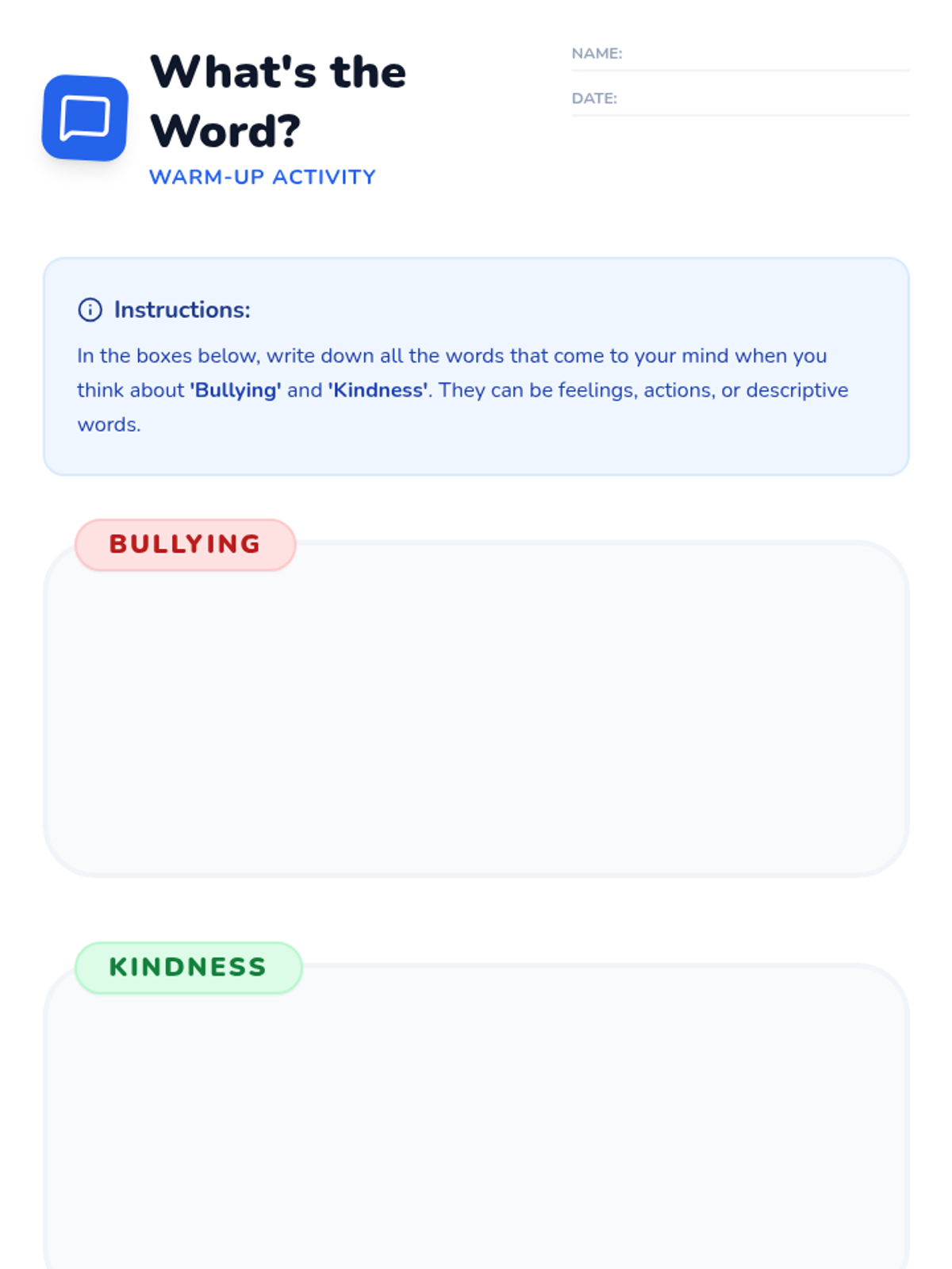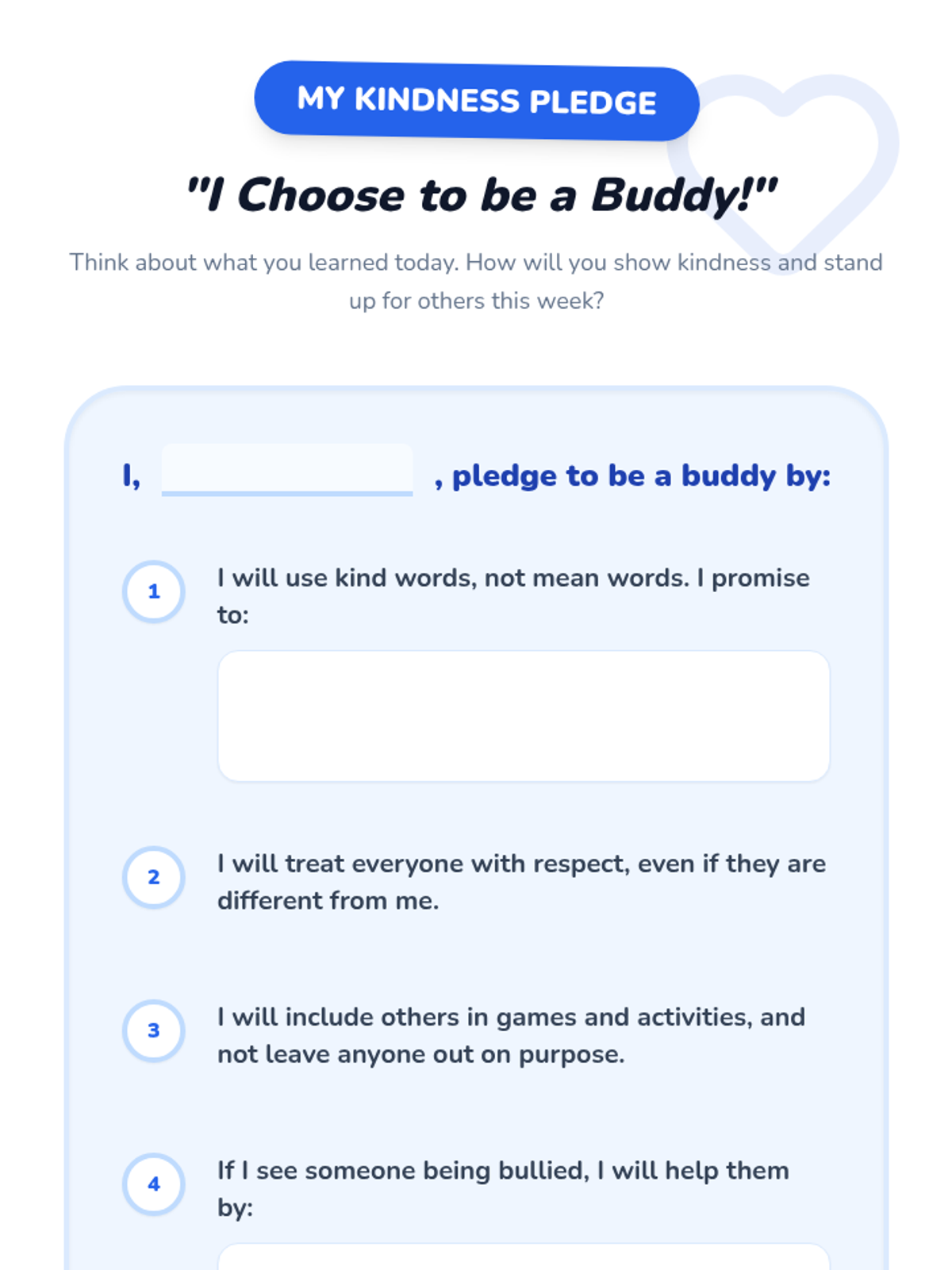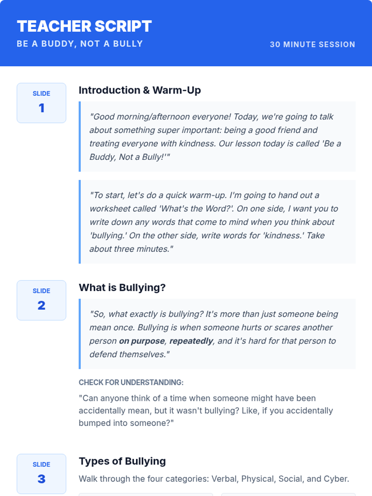 A 30-minute lesson for 4th-grade students focused on identifying bullying behaviors, fostering empathy, and practicing positive 'buddy' interventions through role-play and personal reflection.