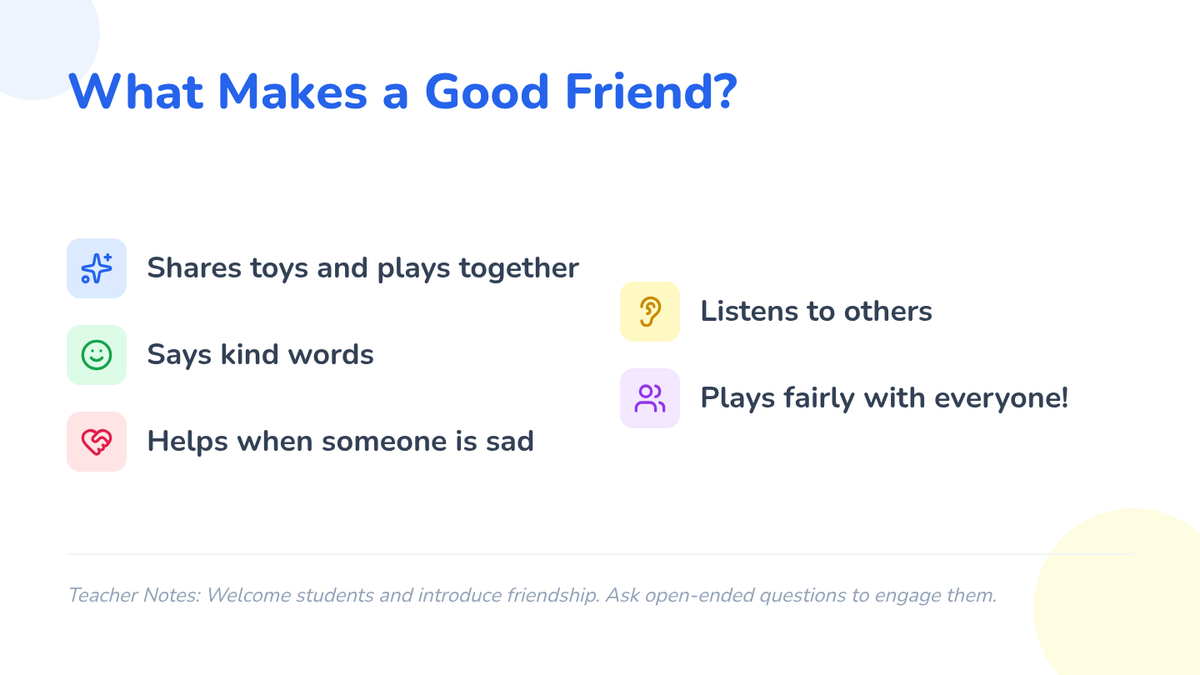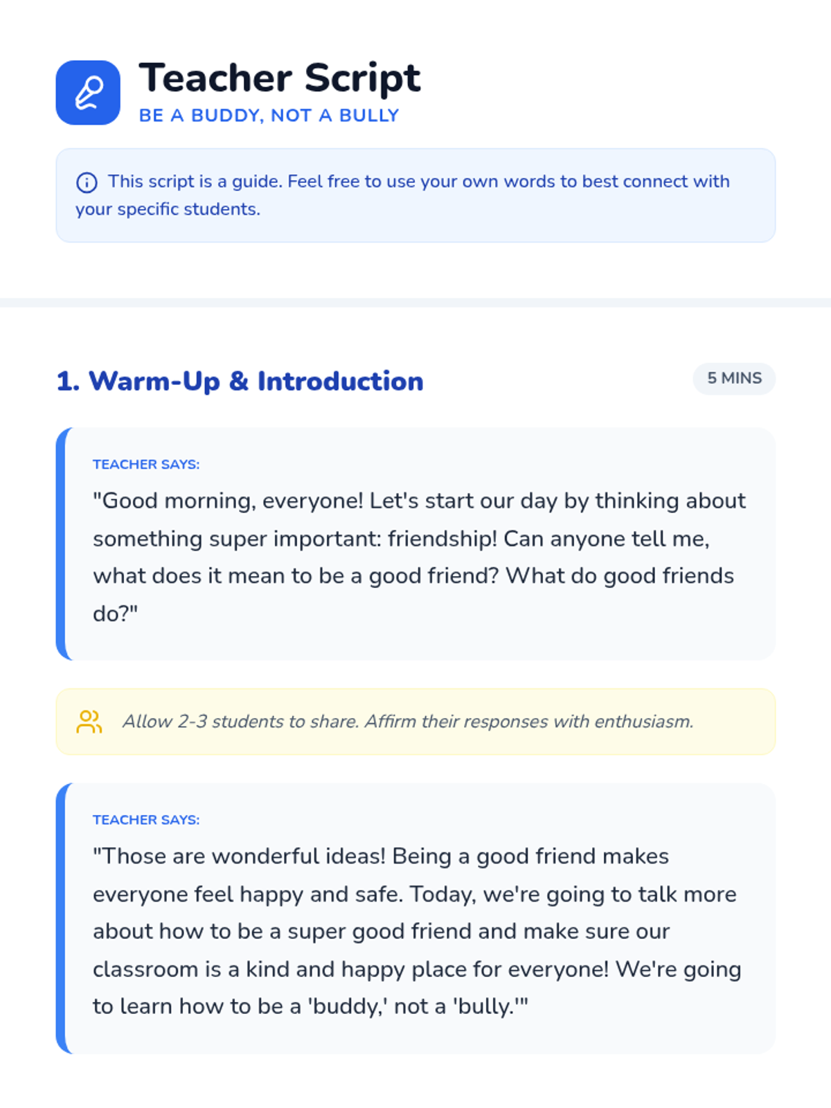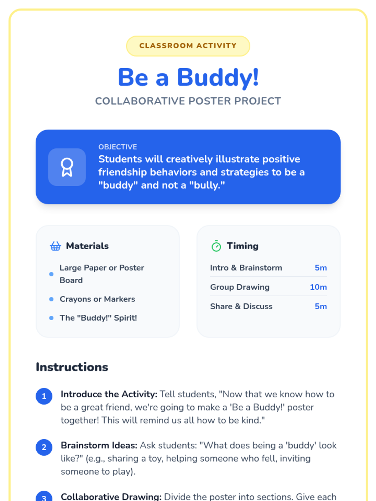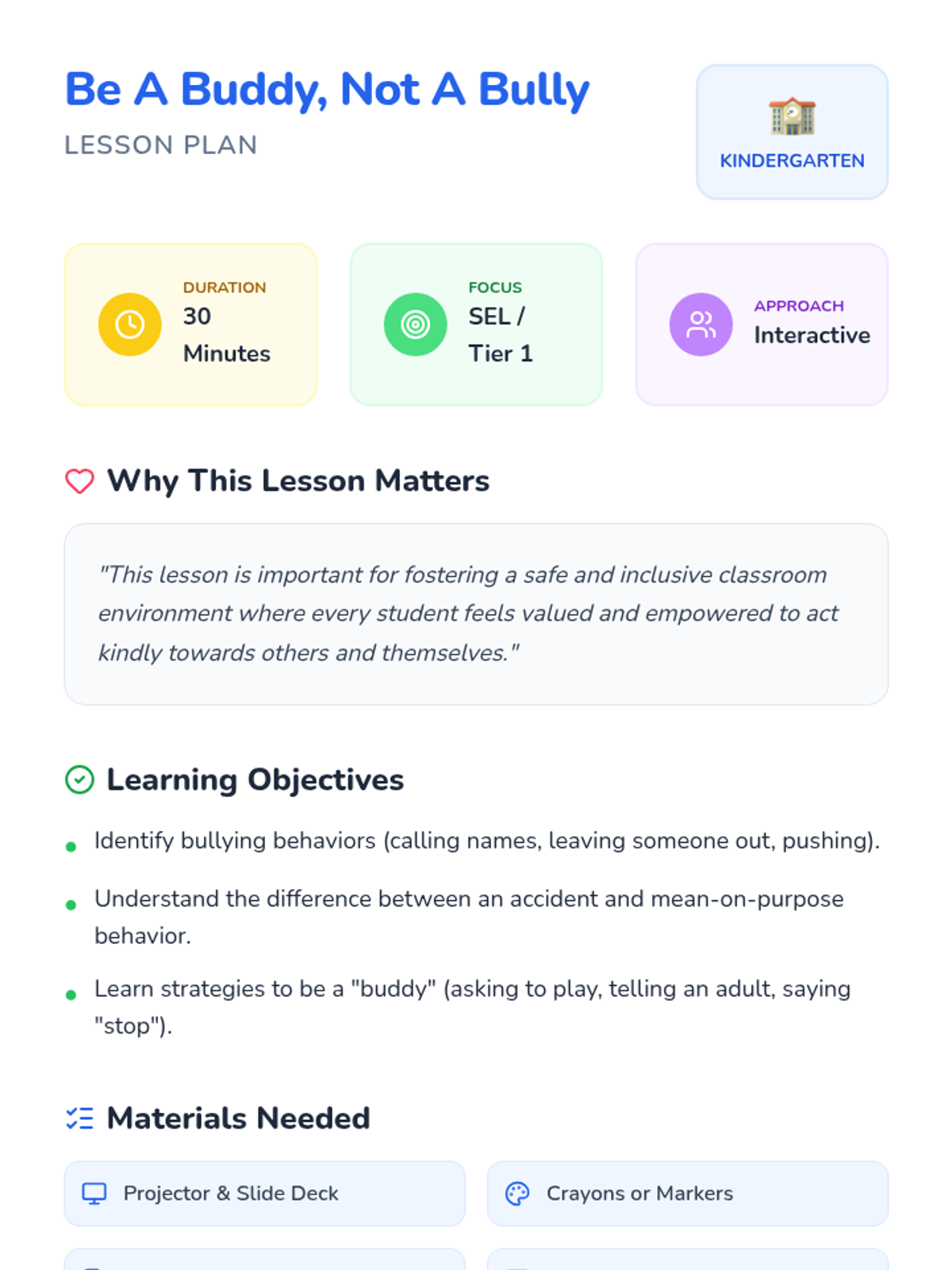 A 30-minute social-emotional learning lesson for Kindergarteners that defines bullying, explores feelings, and teaches students how to be supportive friends through discussion and a collaborative activity.