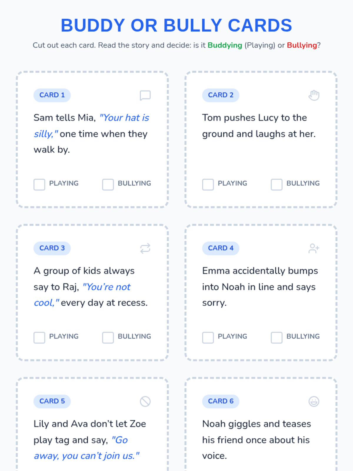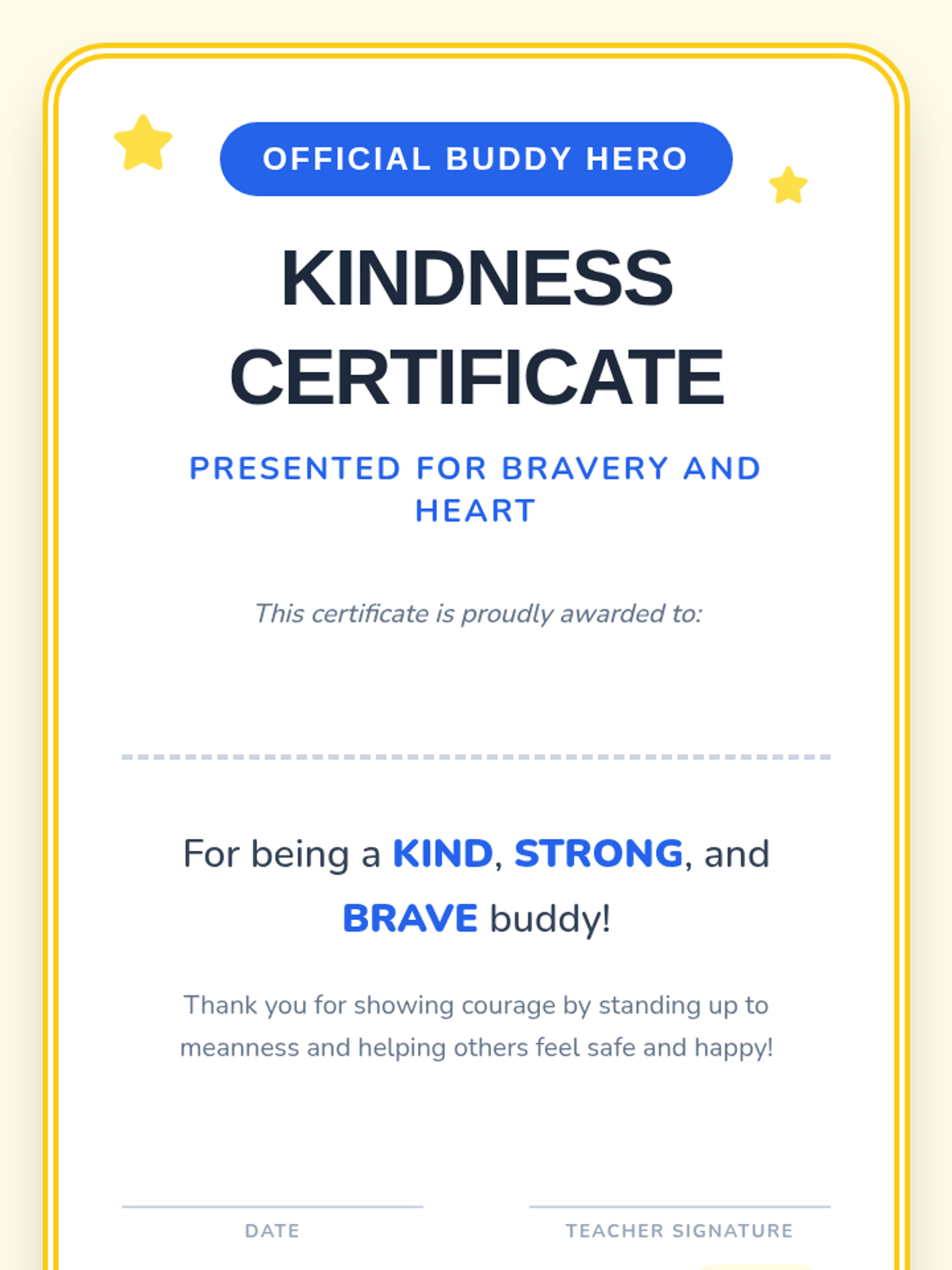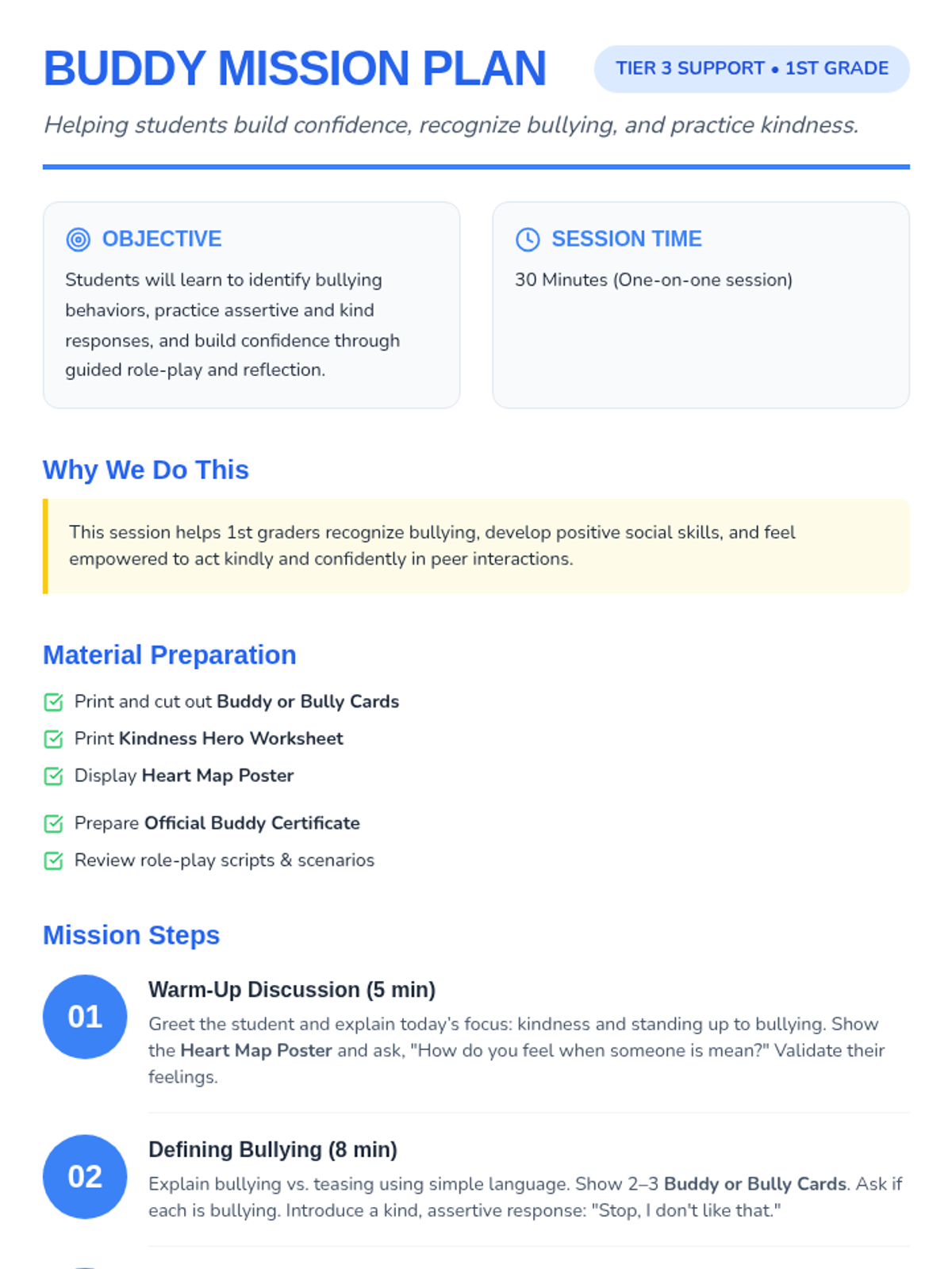 A Tier 3 individual support lesson for 1st graders to recognize bullying, practice assertive responses, and celebrate kindness through role-play and reflection.
