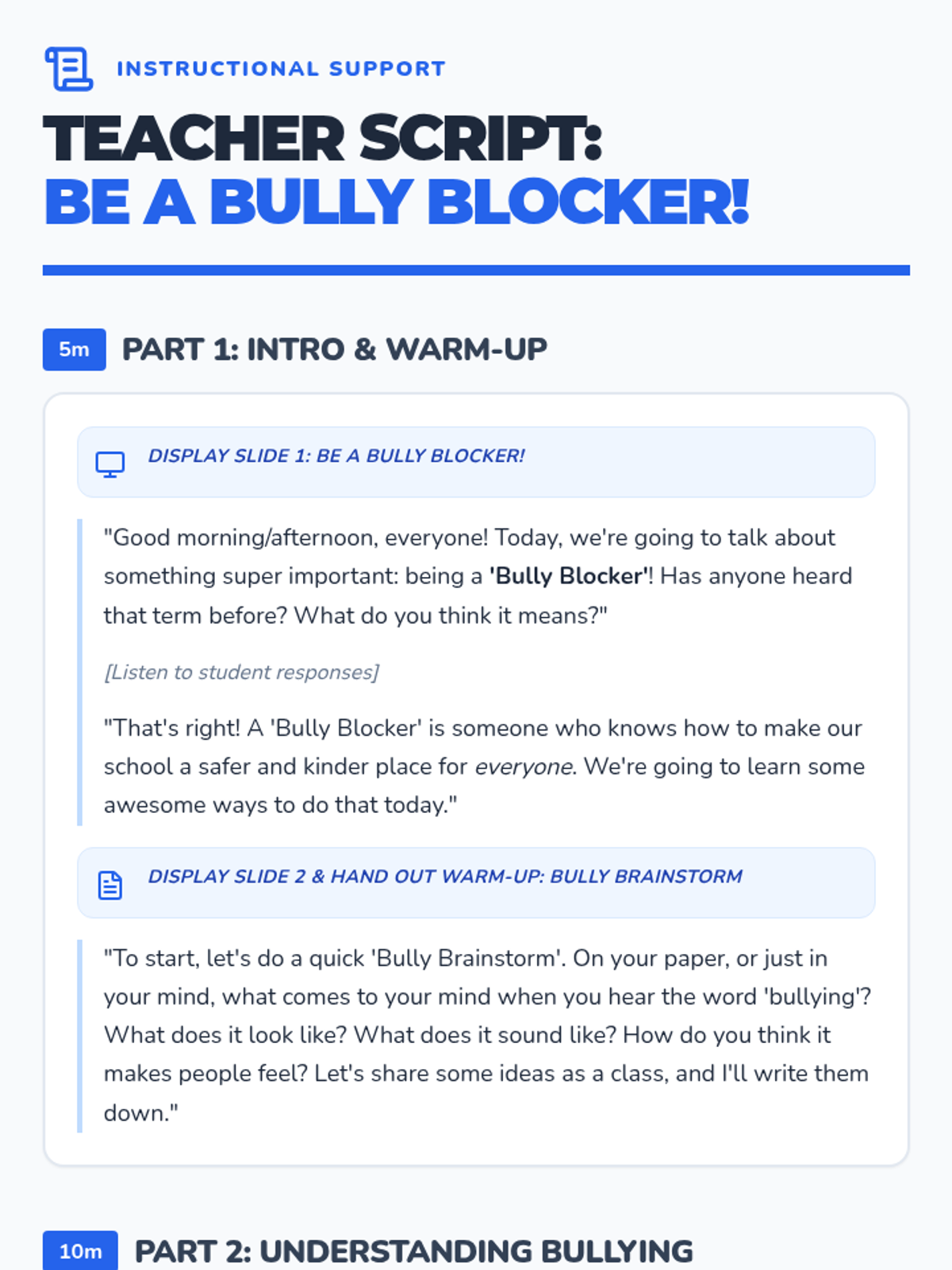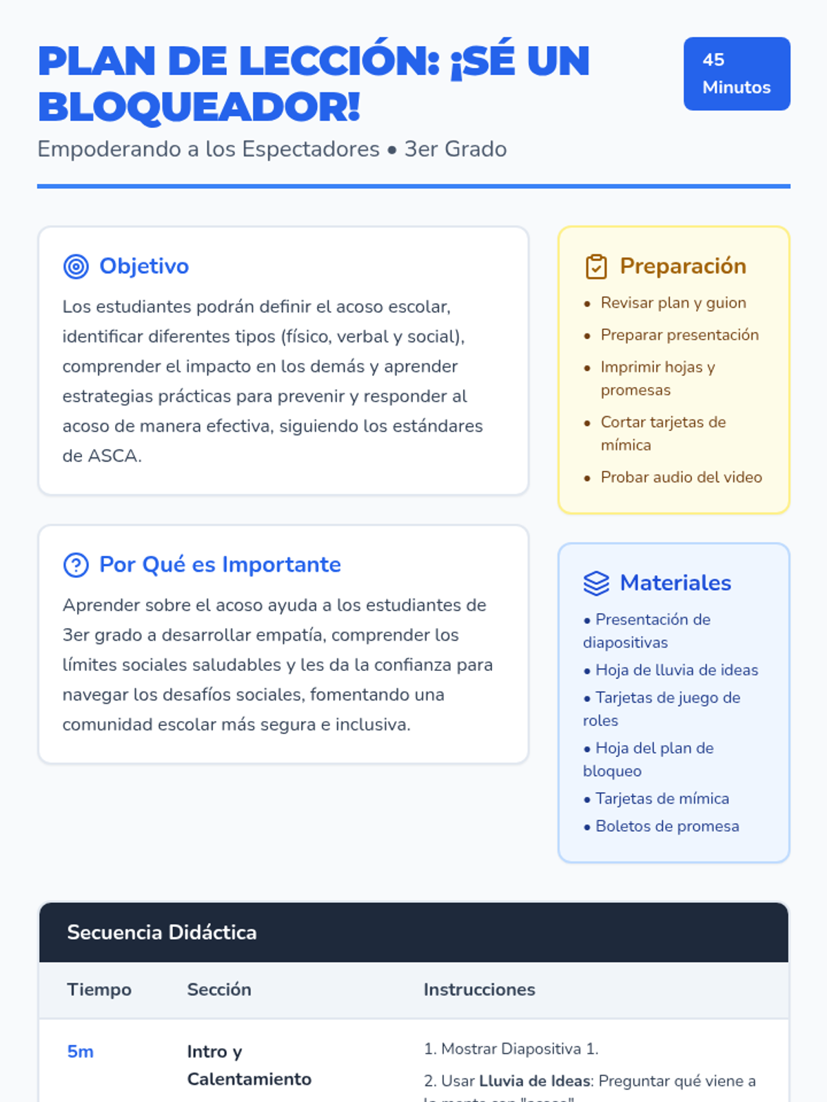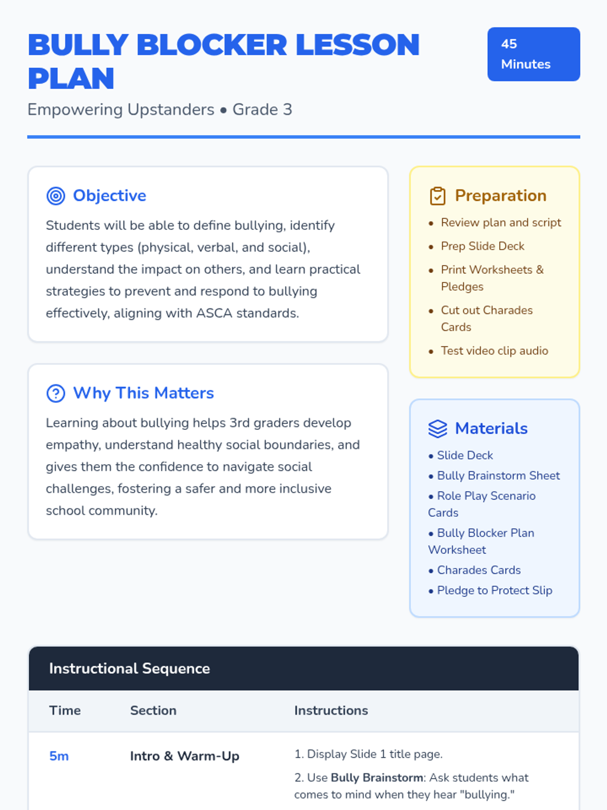 A 45-minute 3rd-grade lesson based on the ASCA model that empowers students to identify, prevent, and respond to bullying using 'Bully Blocker' strategies. Students engage in interactive discussions, role-playing, and personal planning to foster a safer school environment.