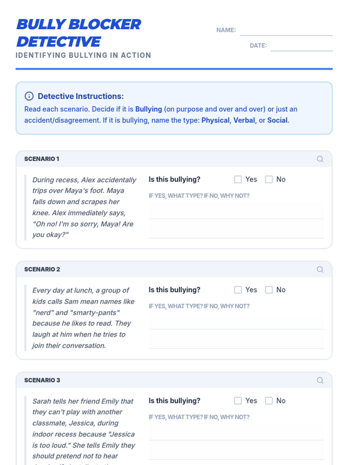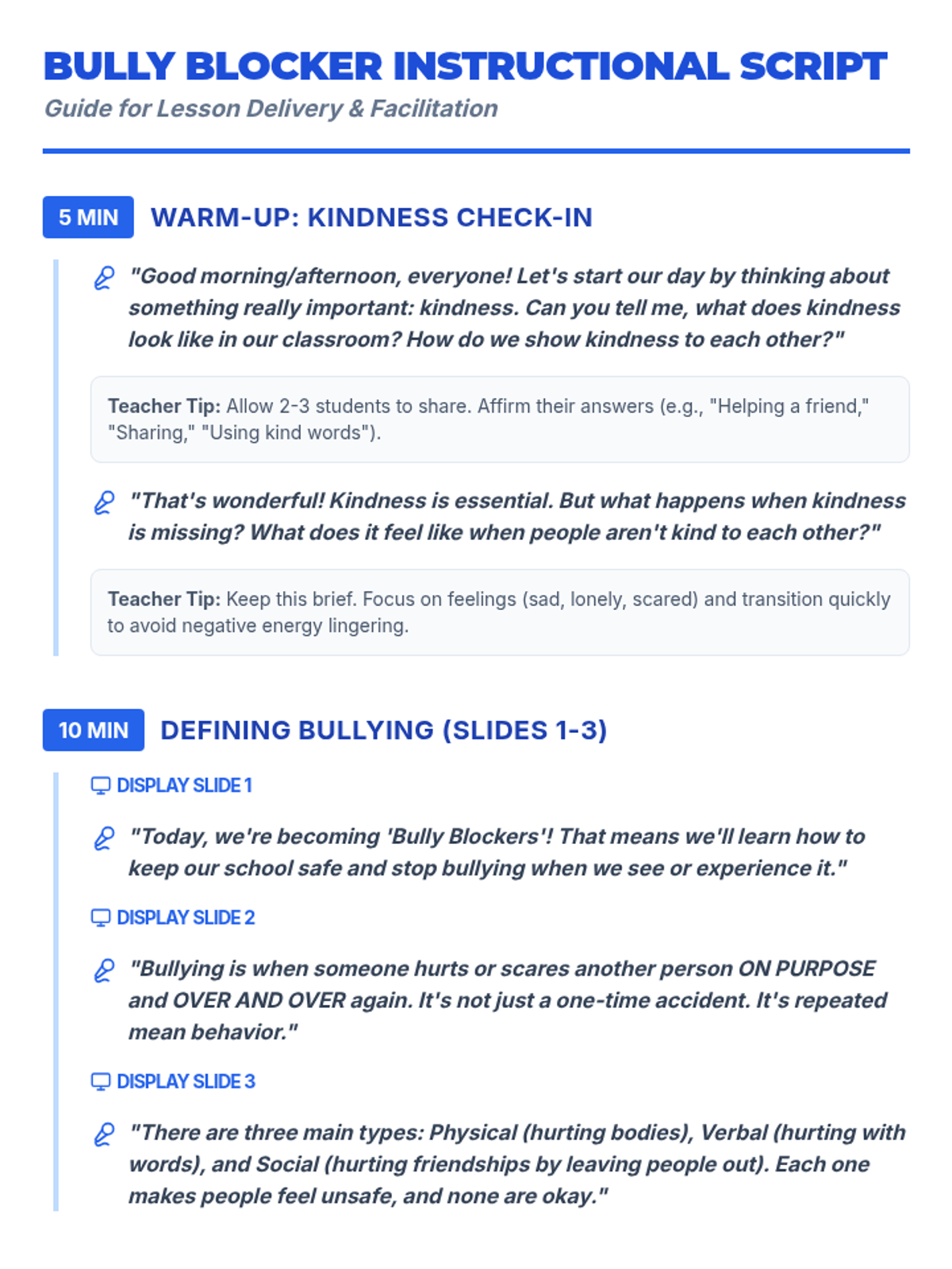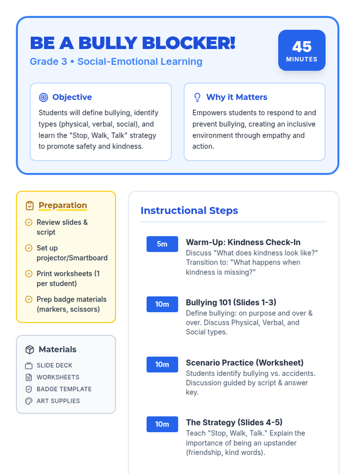 An interactive 45-minute lesson for 3rd graders to identify bullying, learn the 'Stop, Walk, Talk' strategy, and promote a kind classroom culture.