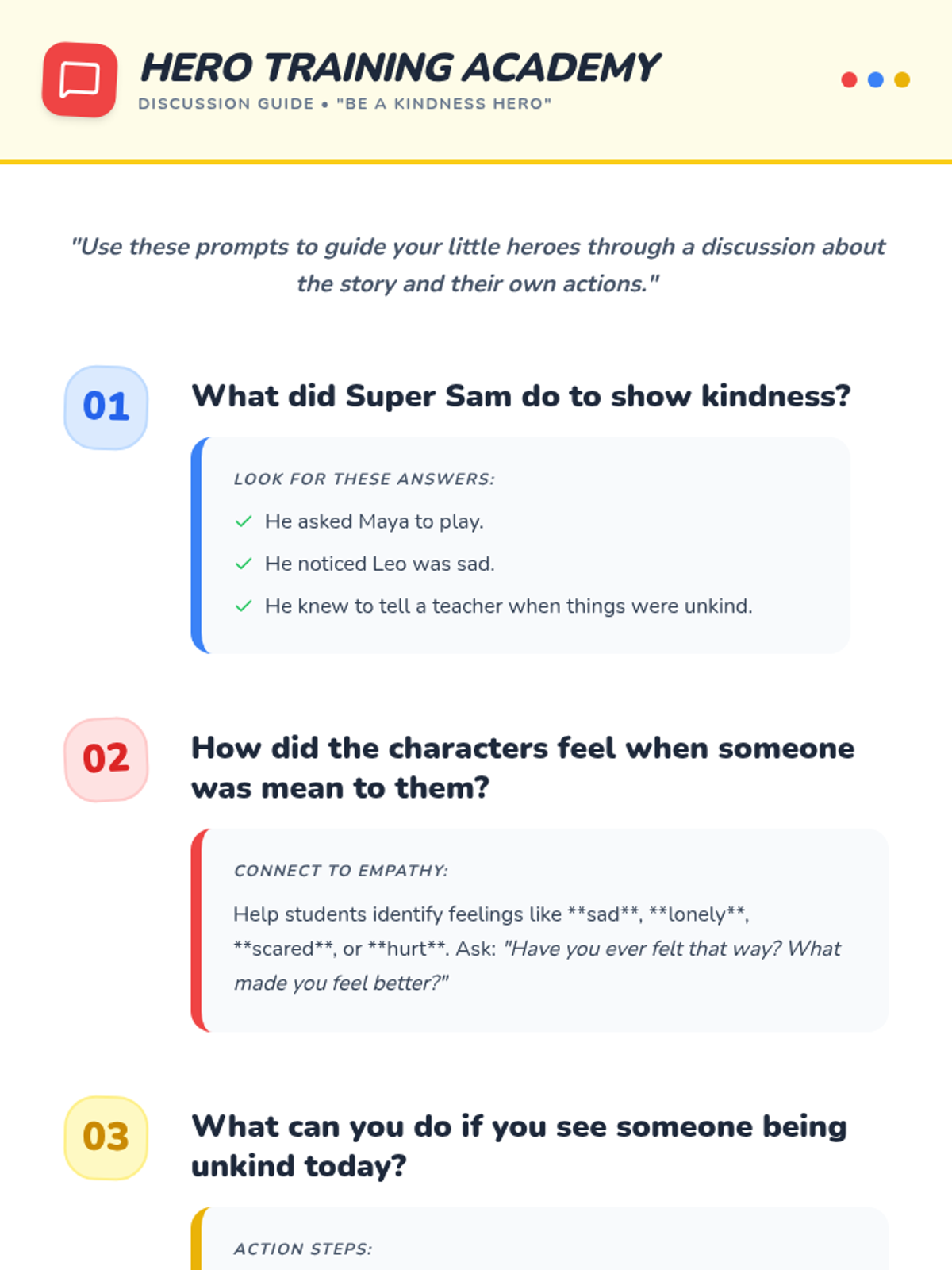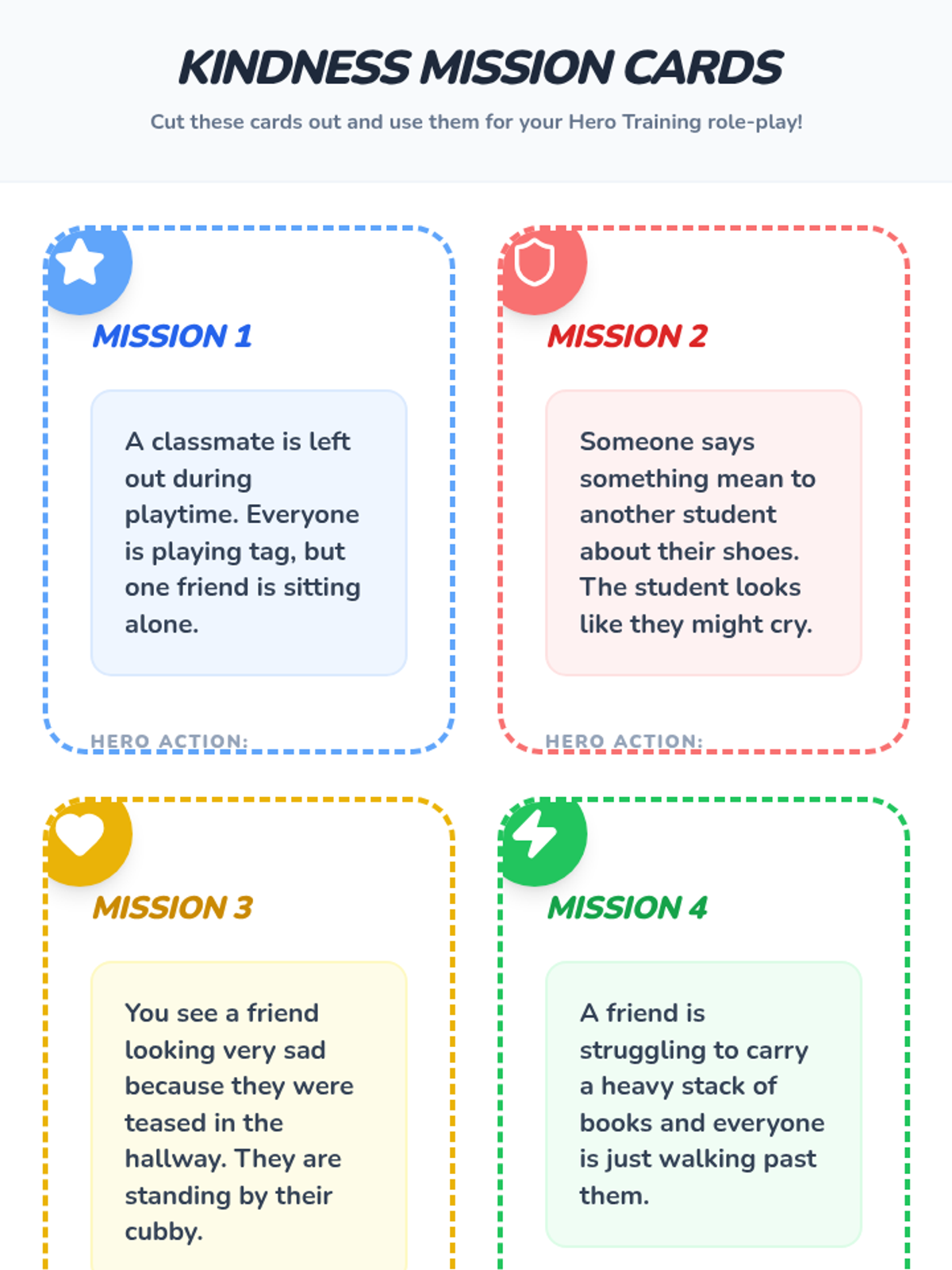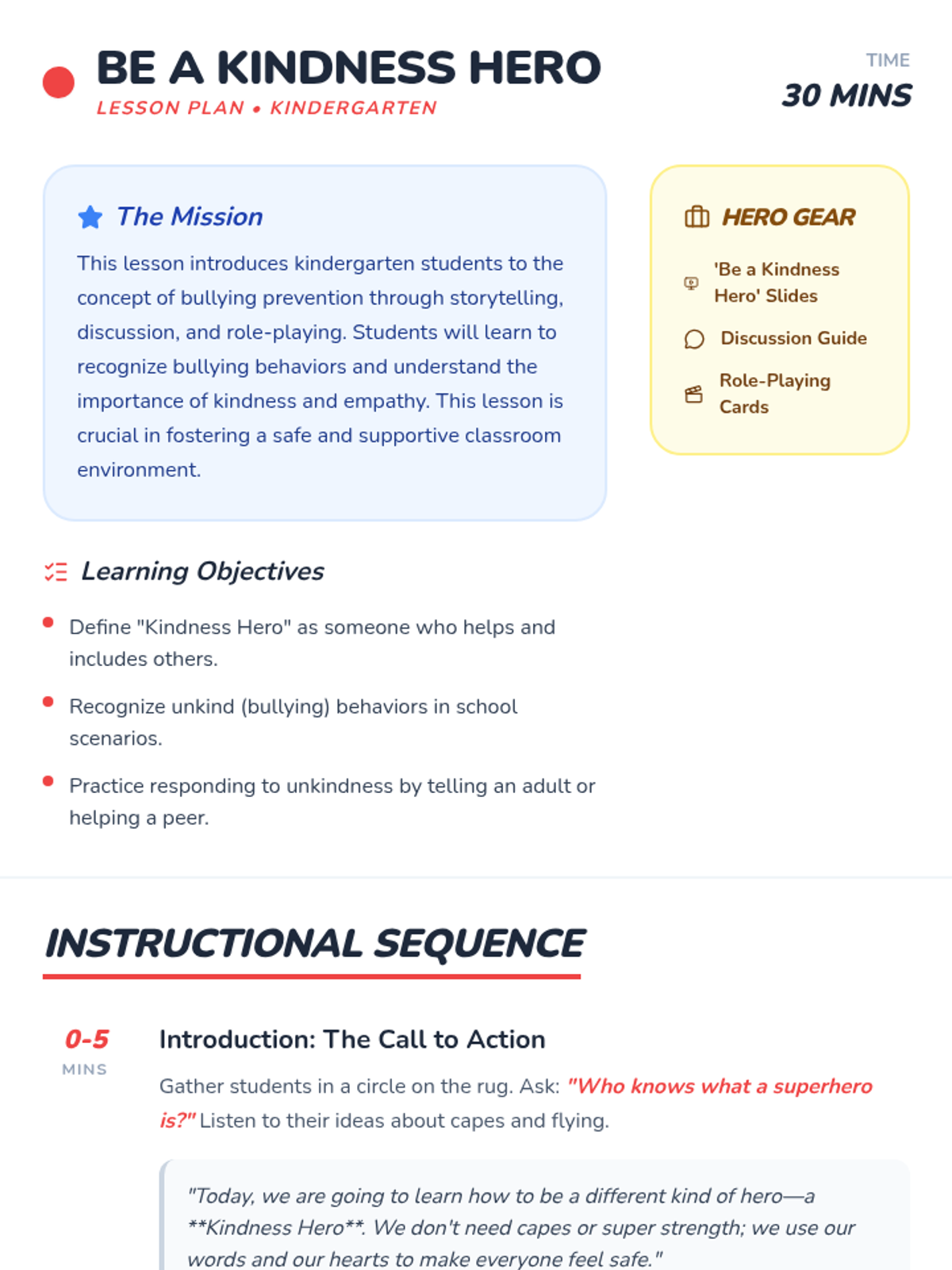 A kindergarten lesson on bullying prevention and empathy, using superhero themes to teach students how to be 'Kindness Heroes' through storytelling and role-play.