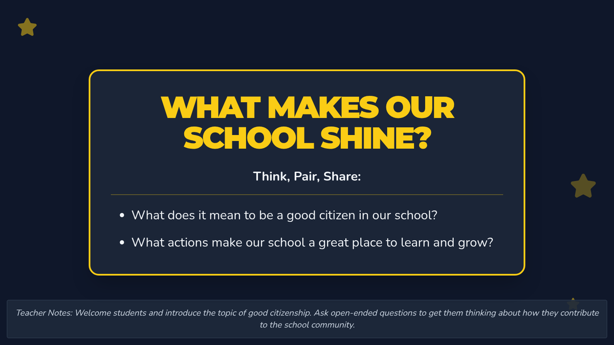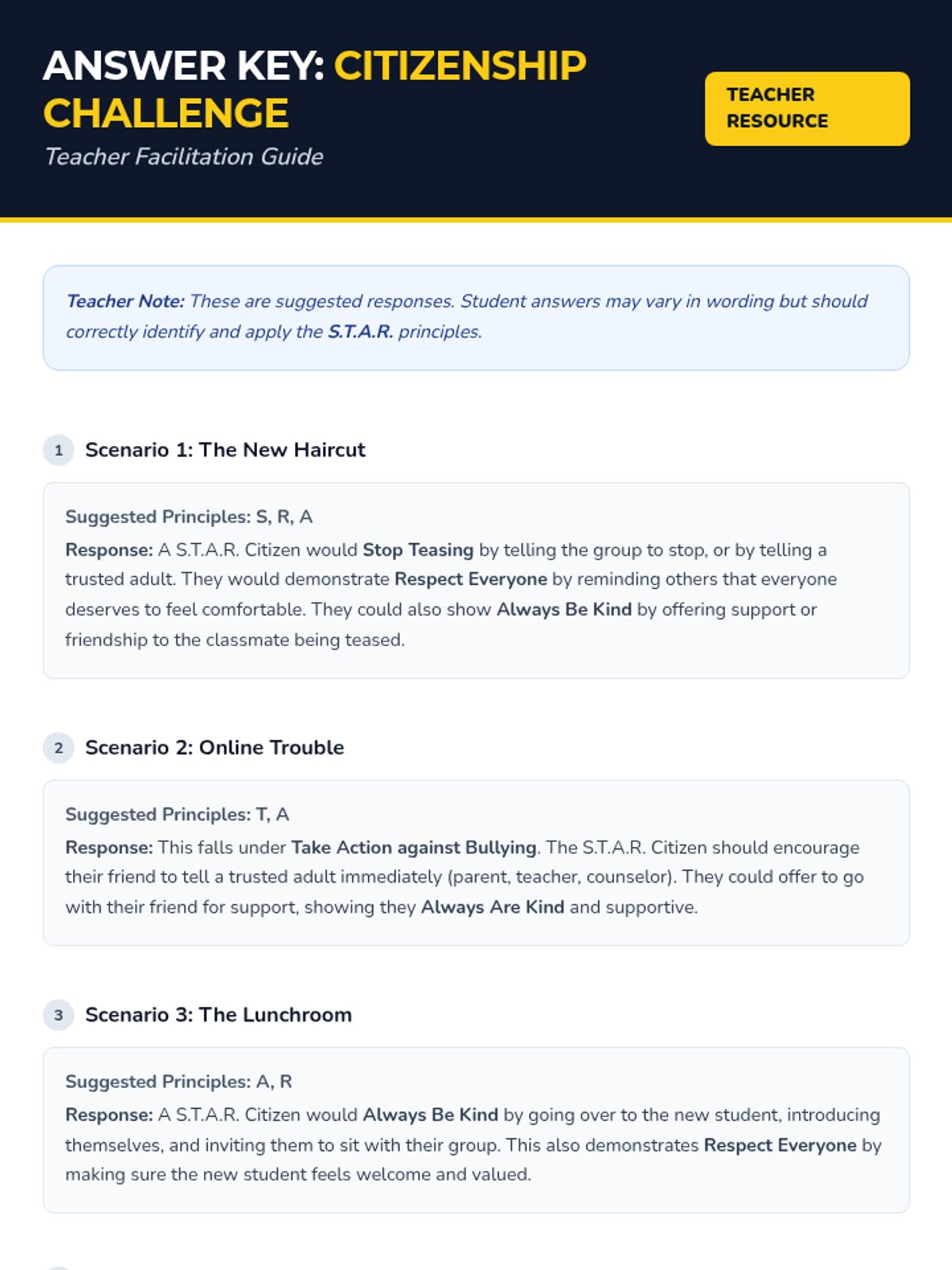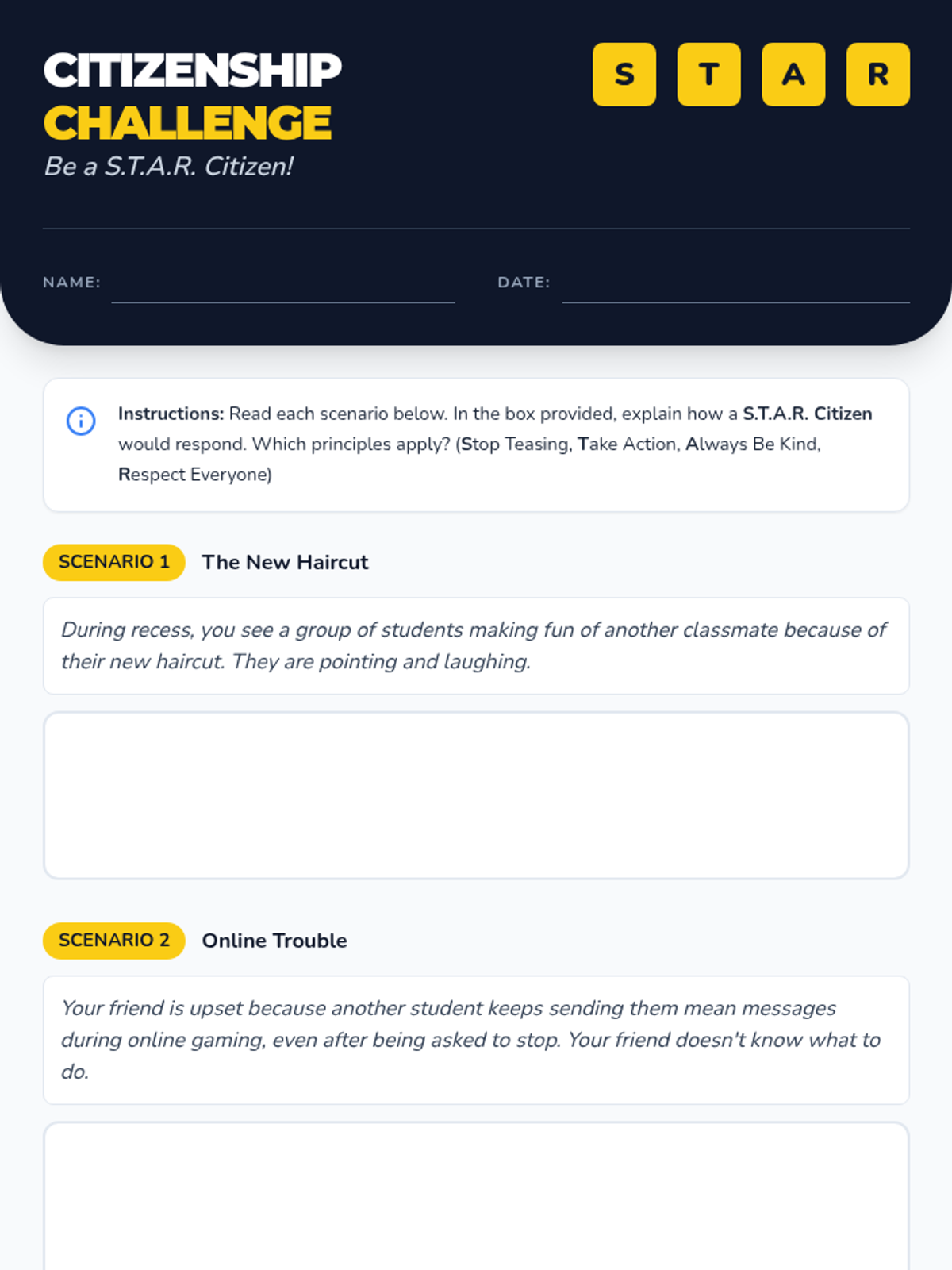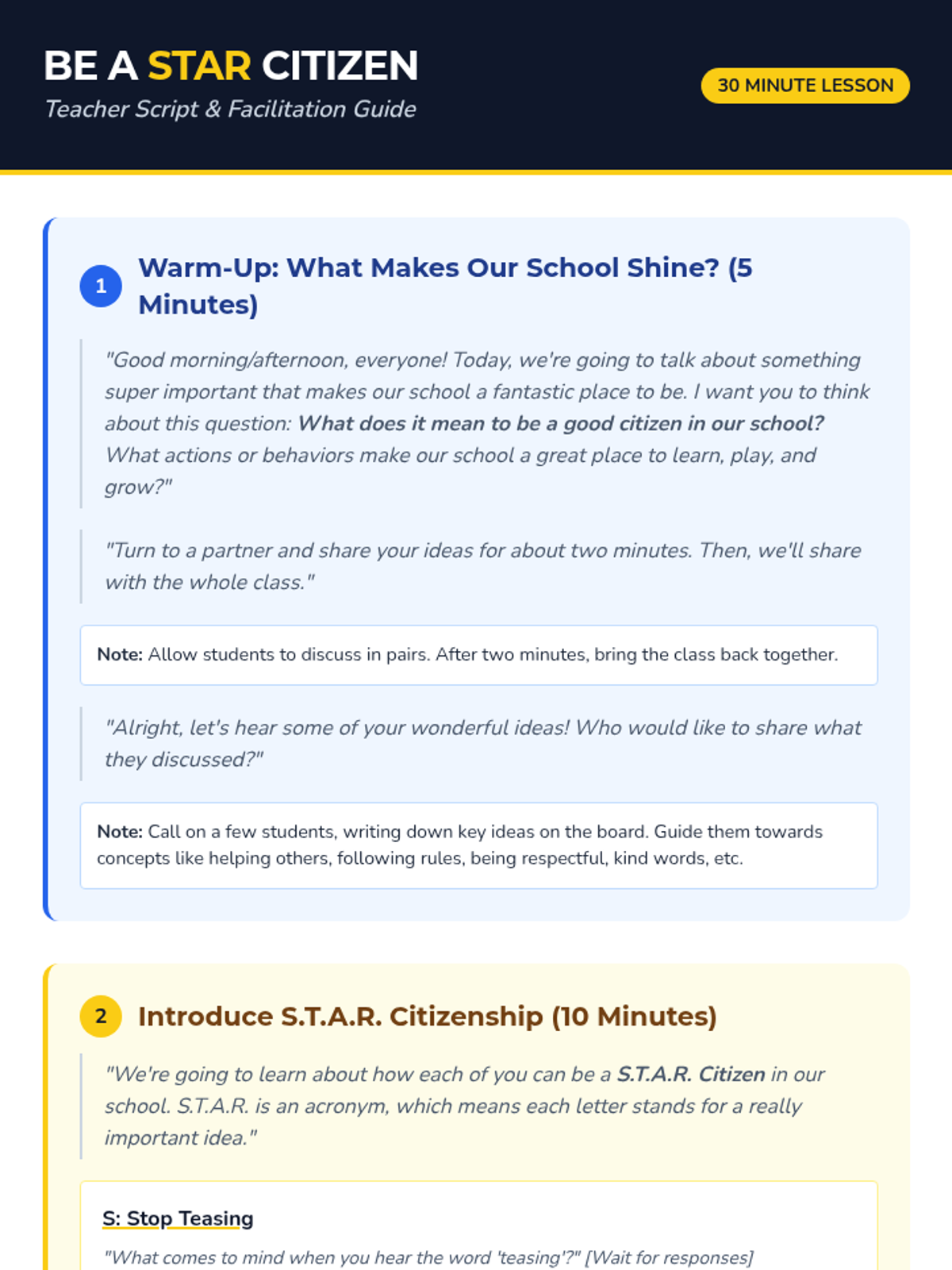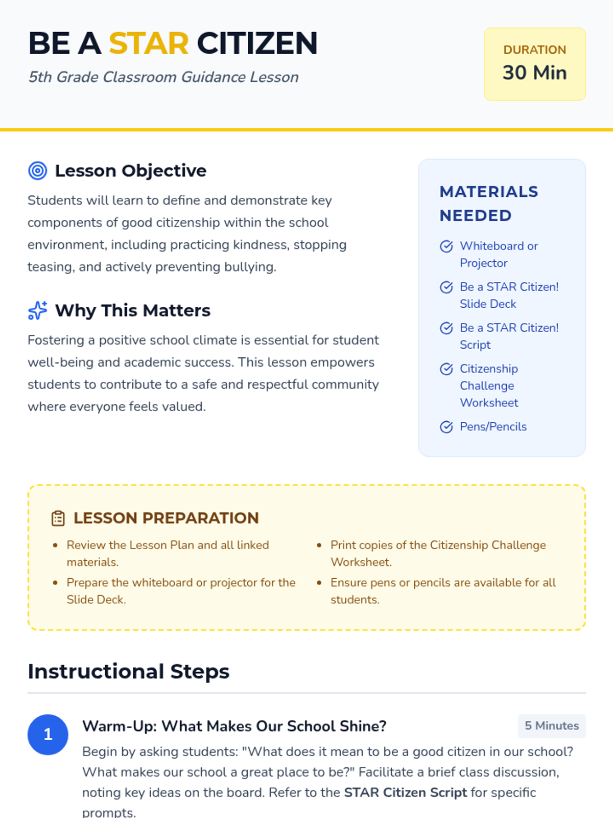 A 30-minute lesson for 5th graders on school citizenship, focusing on kindness, stopping teasing, and preventing bullying through the S.T.A.R. acronym.