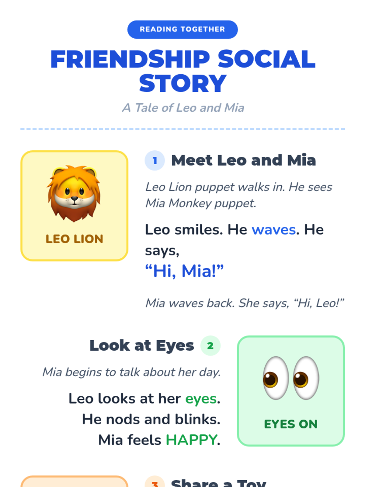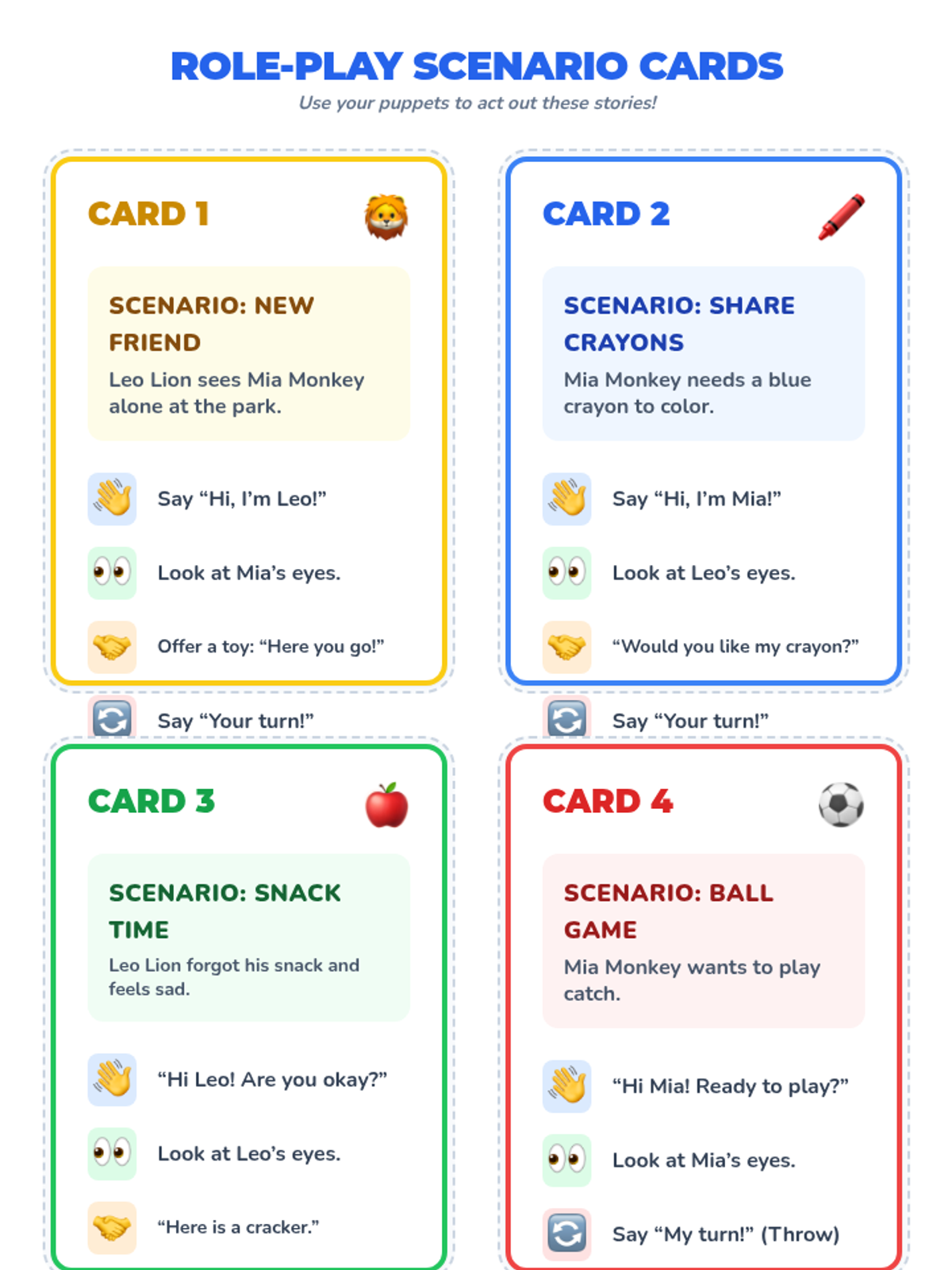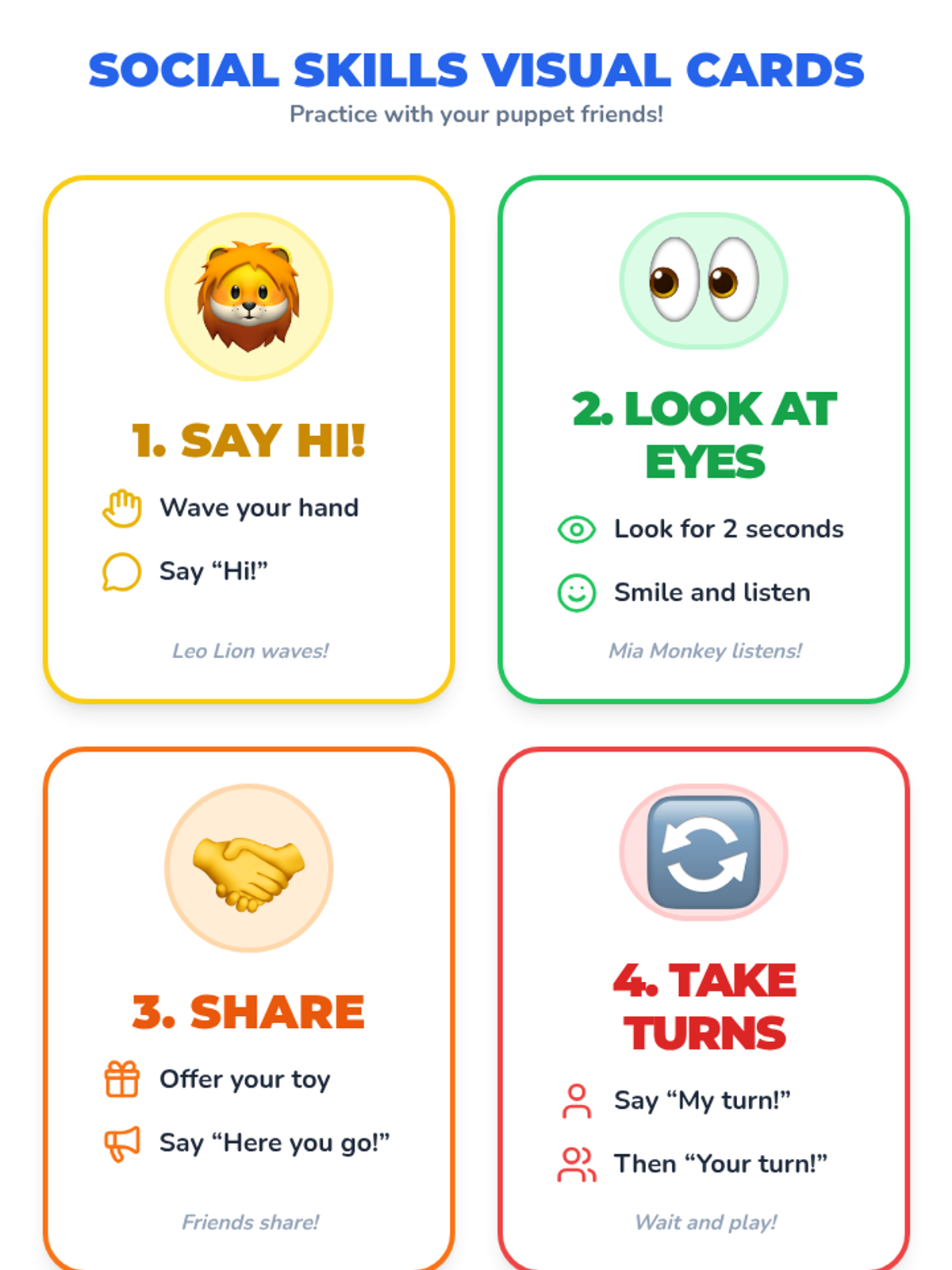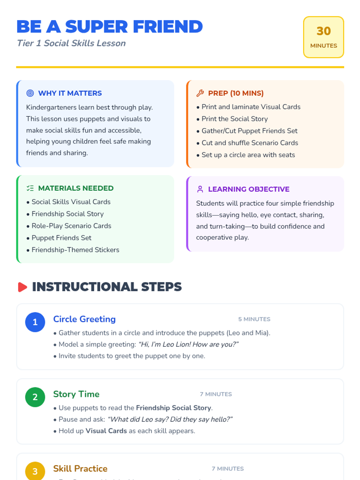 A fun, 30-minute social skills lesson for kindergarteners focusing on saying hello, making eye contact, sharing, and taking turns through puppets and play.