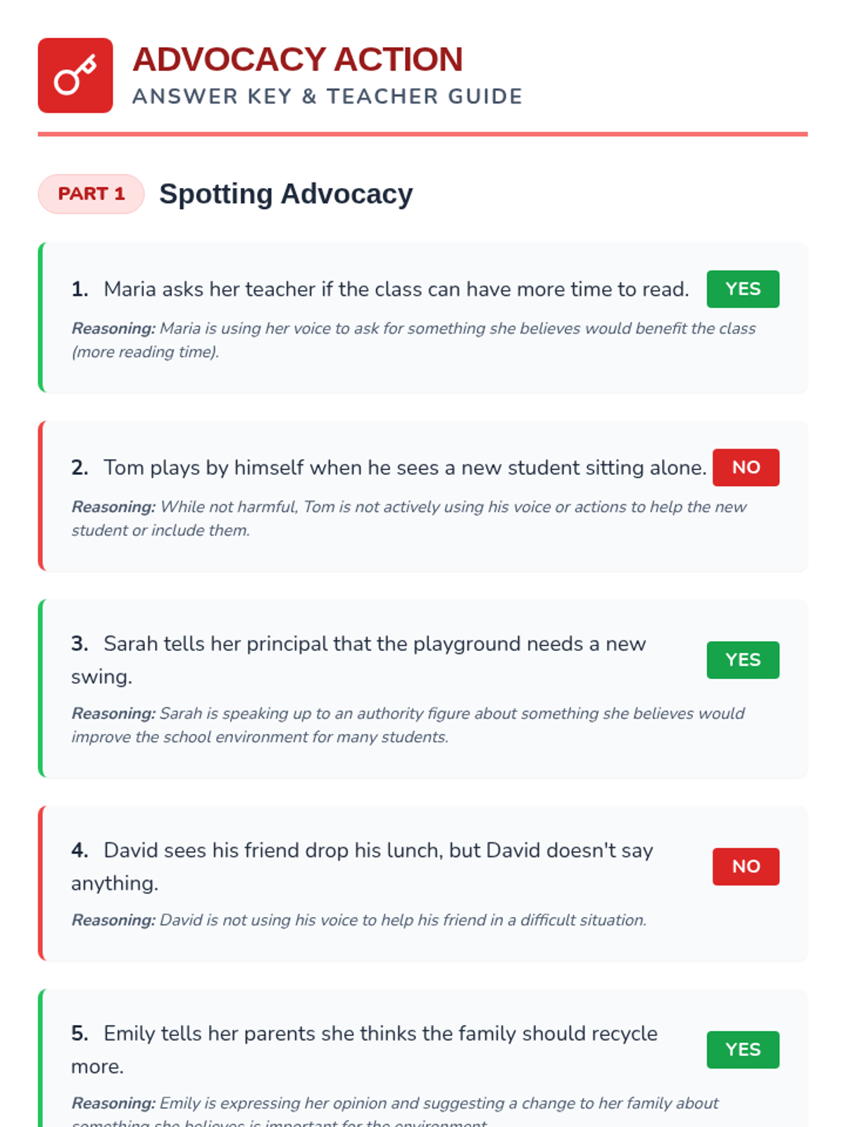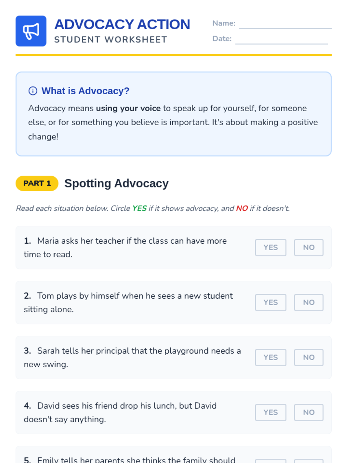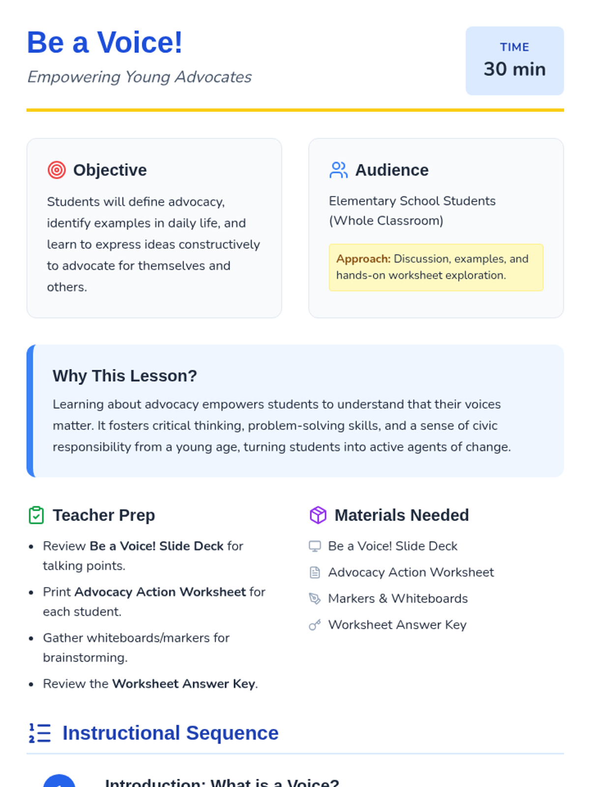 This lesson helps elementary students understand what advocacy is and how they can use their voices to make positive changes in their school and community through discussion and guided practice.