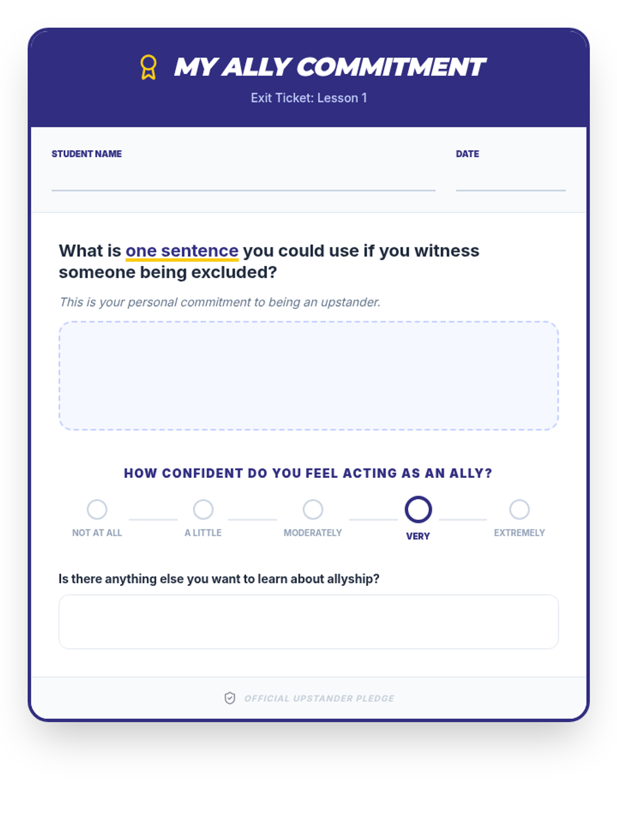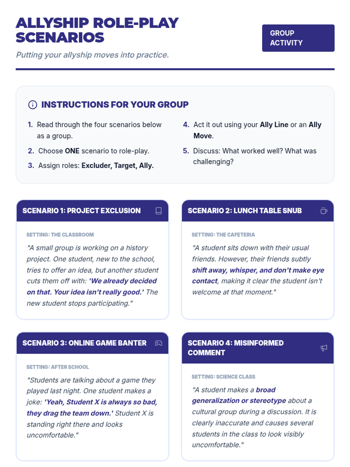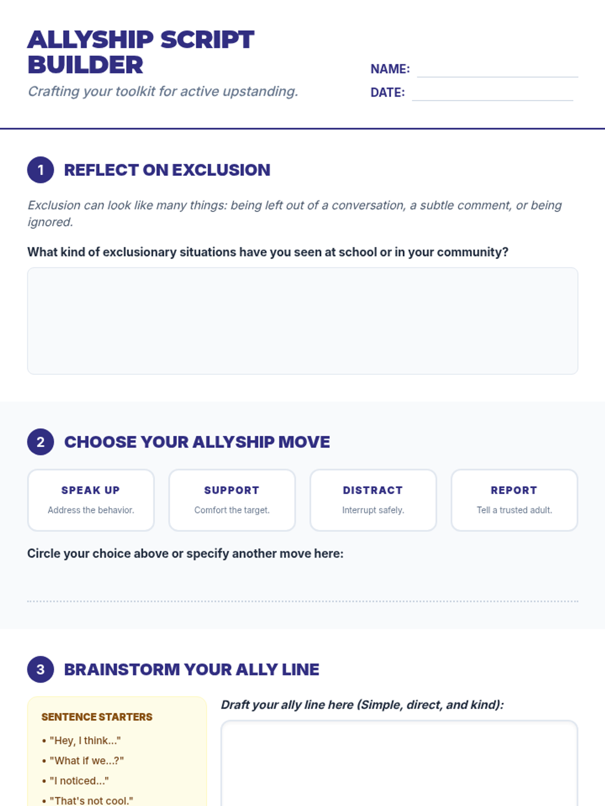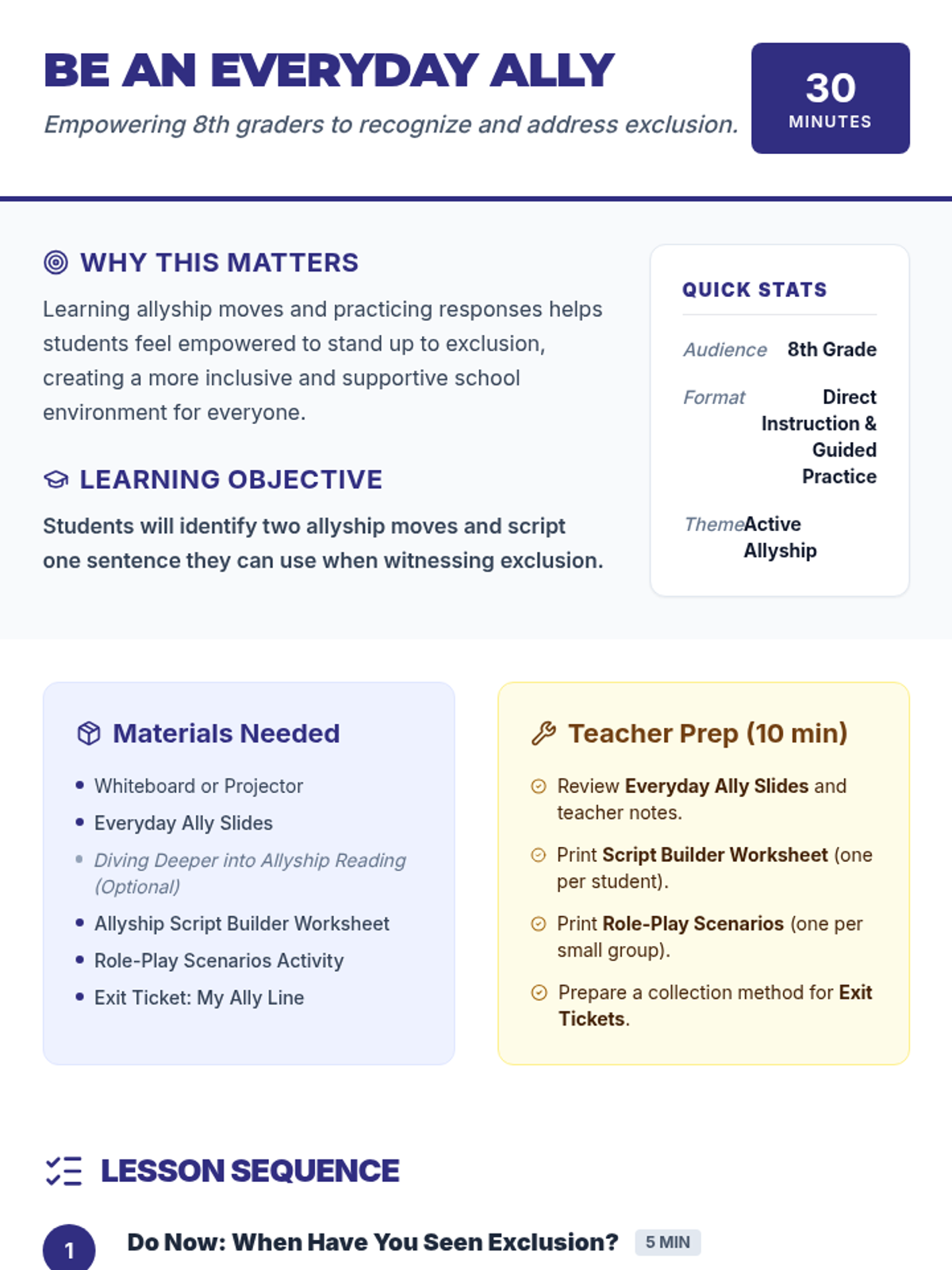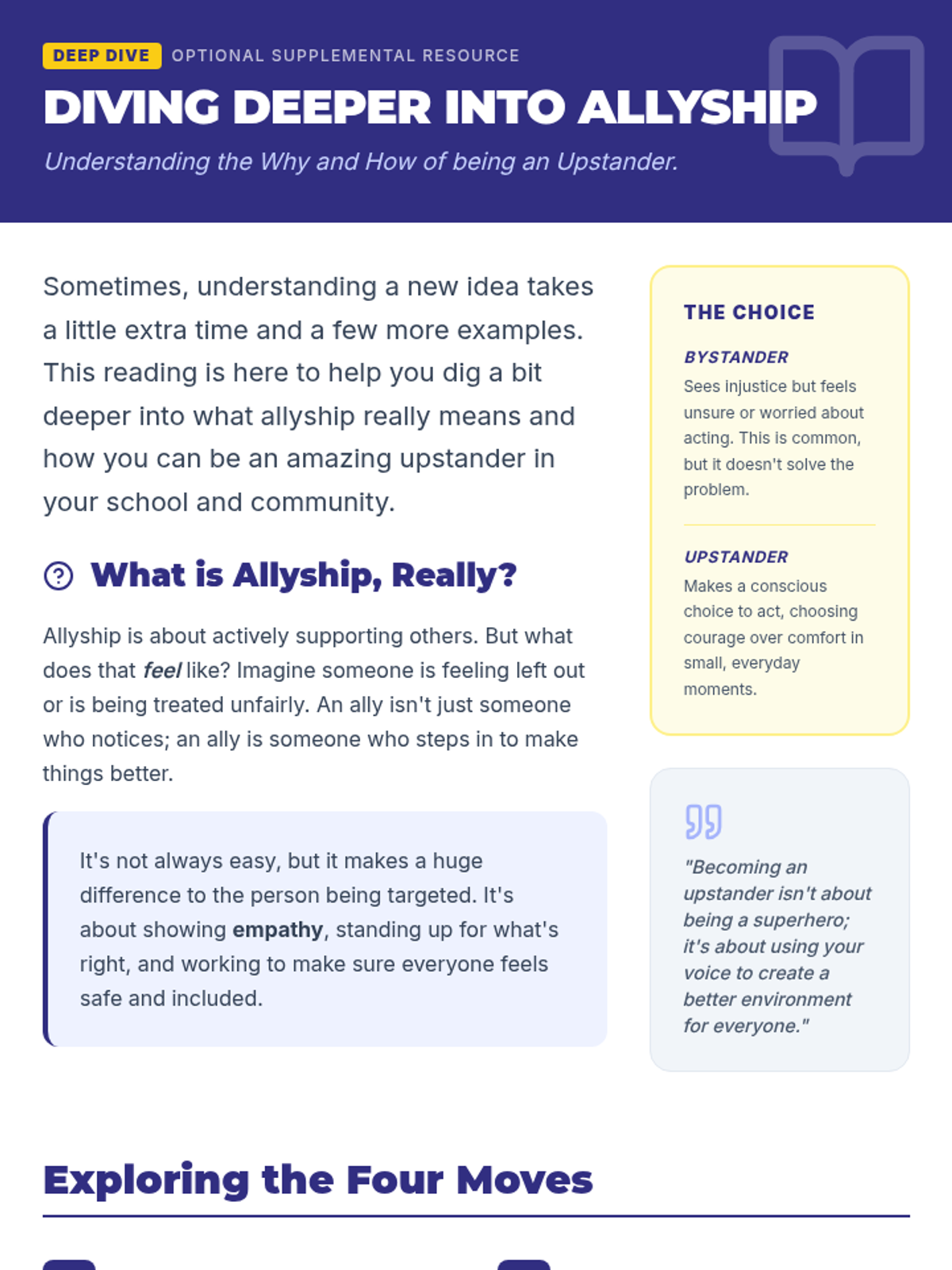 A 30-minute interactive lesson for 8th graders focused on moving from bystander to upstander through the 4 D's of allyship and practical scripting.