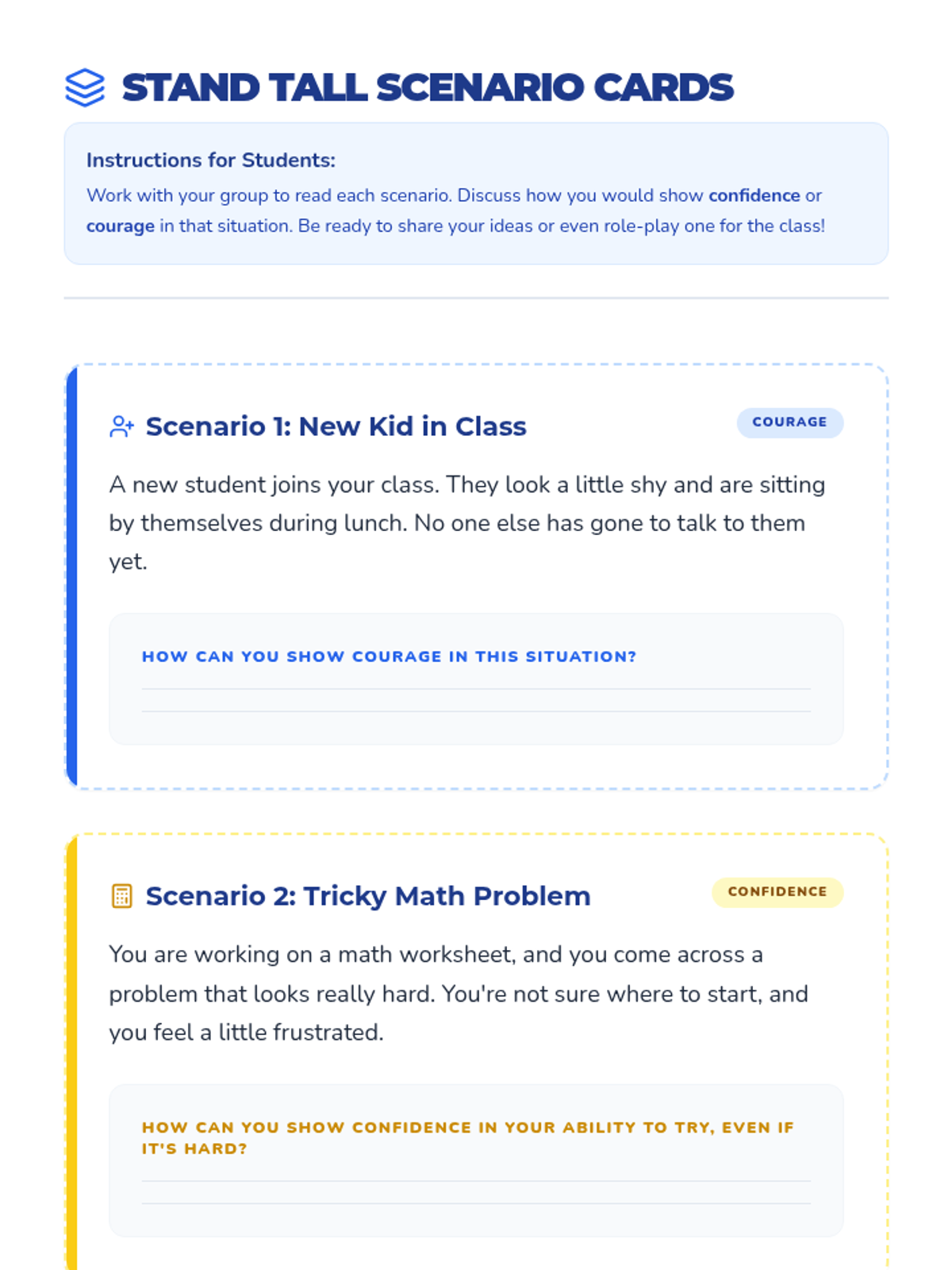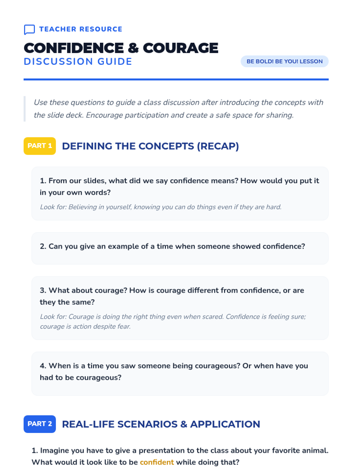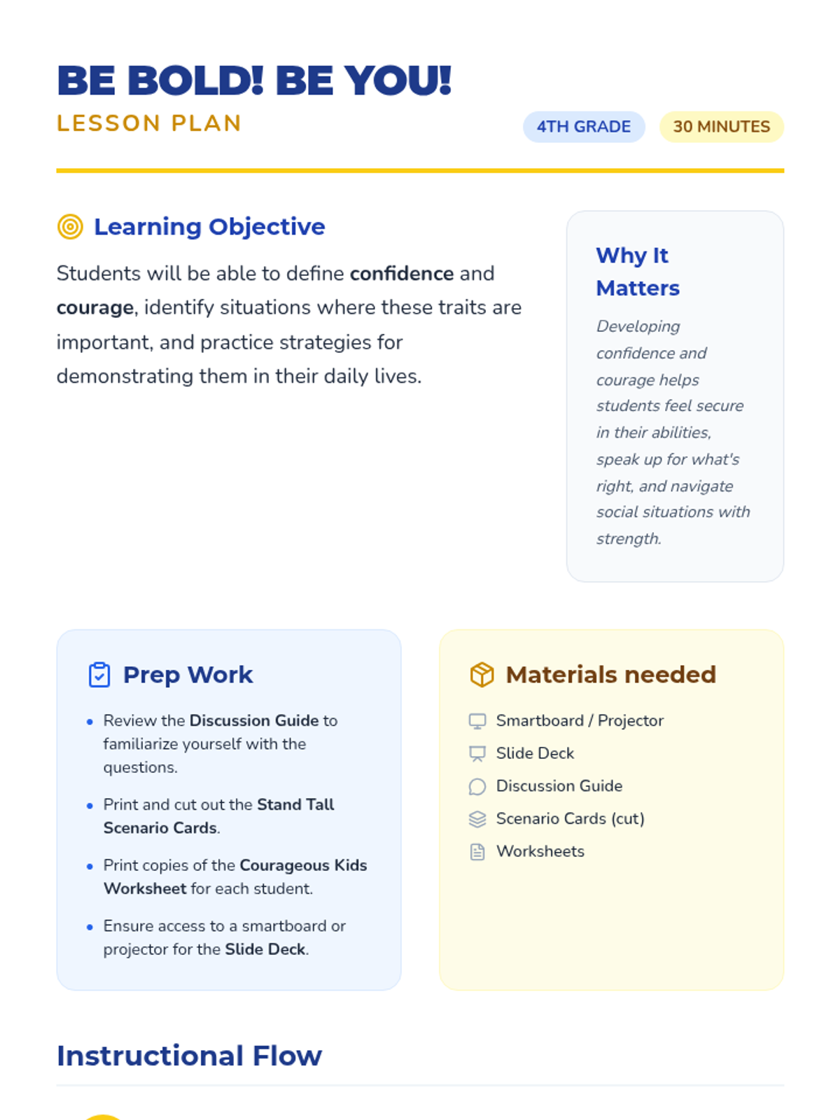 A 30-minute 4th-grade lesson designed to help students define and practice confidence and courage through discussion, scenarios, and reflection.