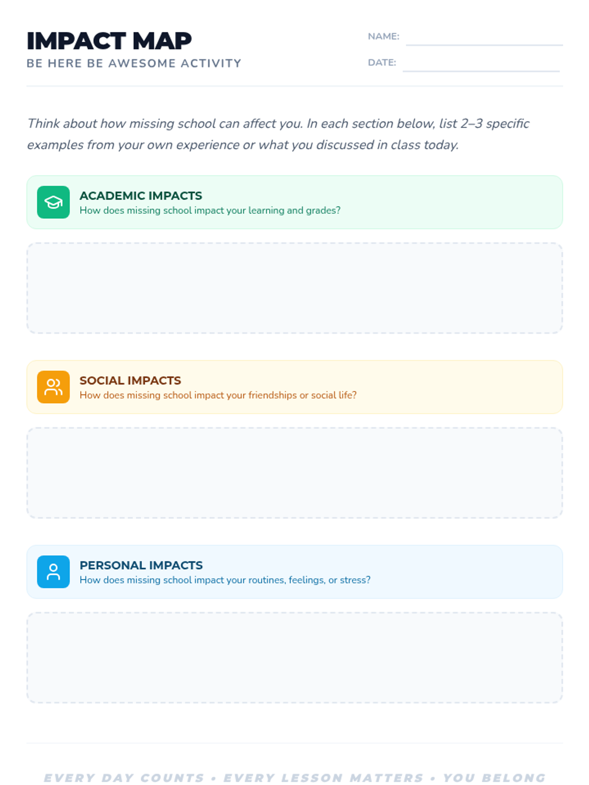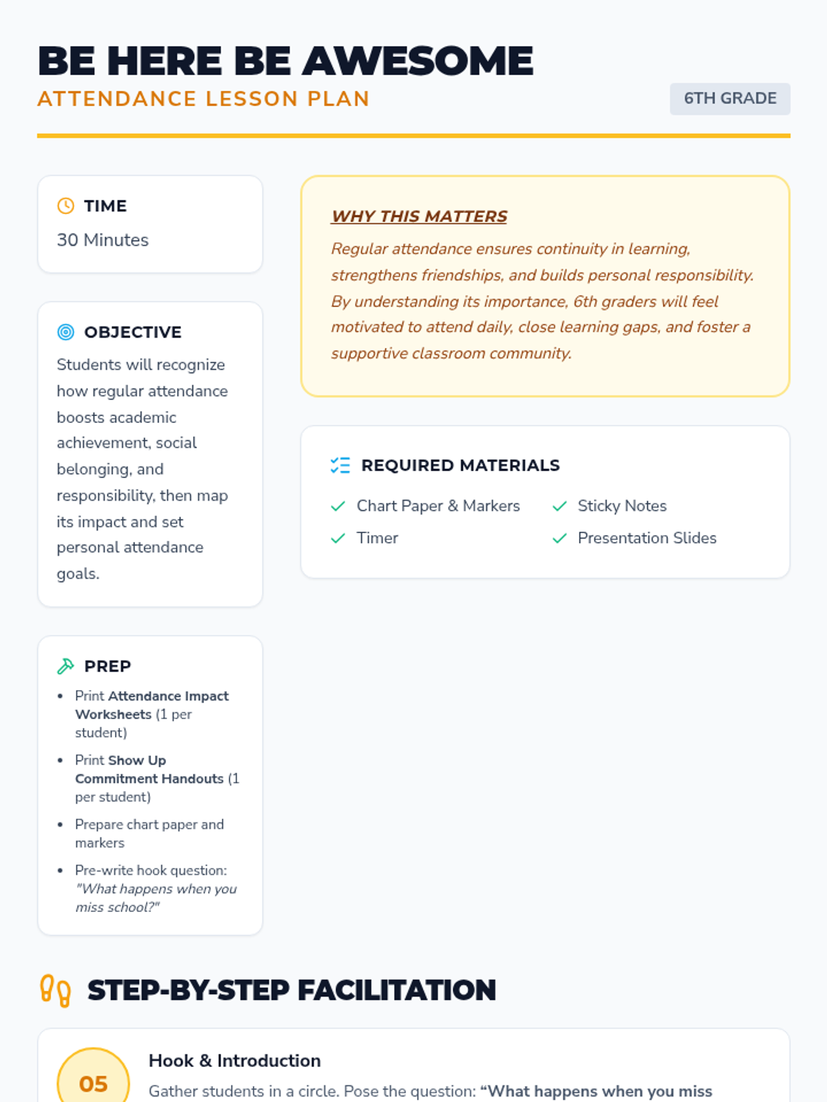 This one-session lesson teaches 6th graders the importance of regular attendance by connecting attendance to academic success, social belonging, and personal responsibility through interactive mapping and goal setting.