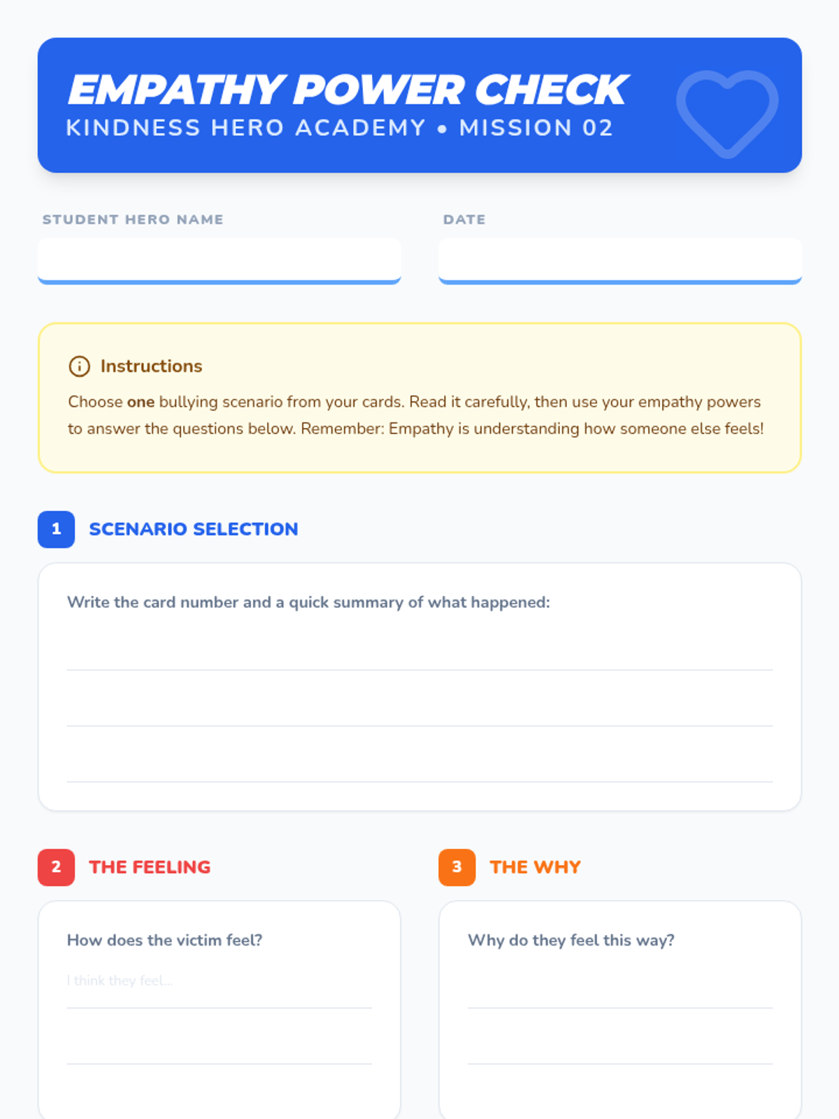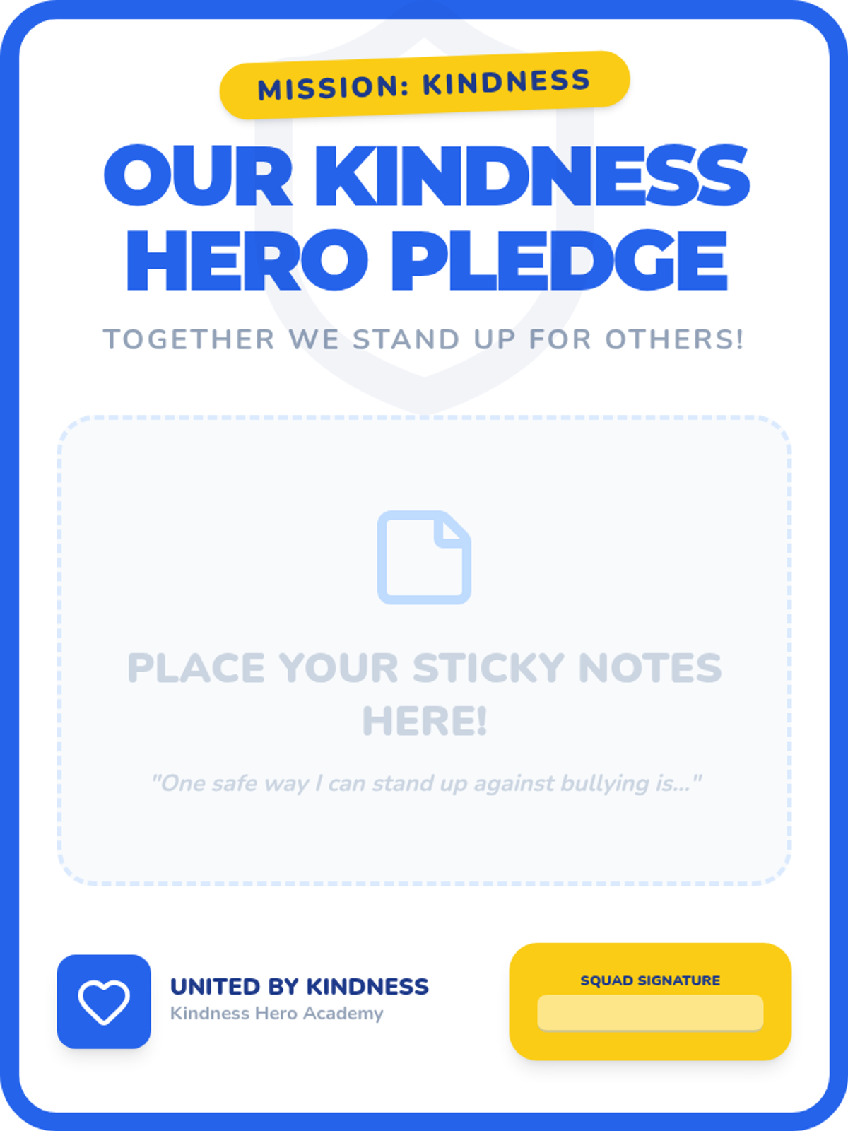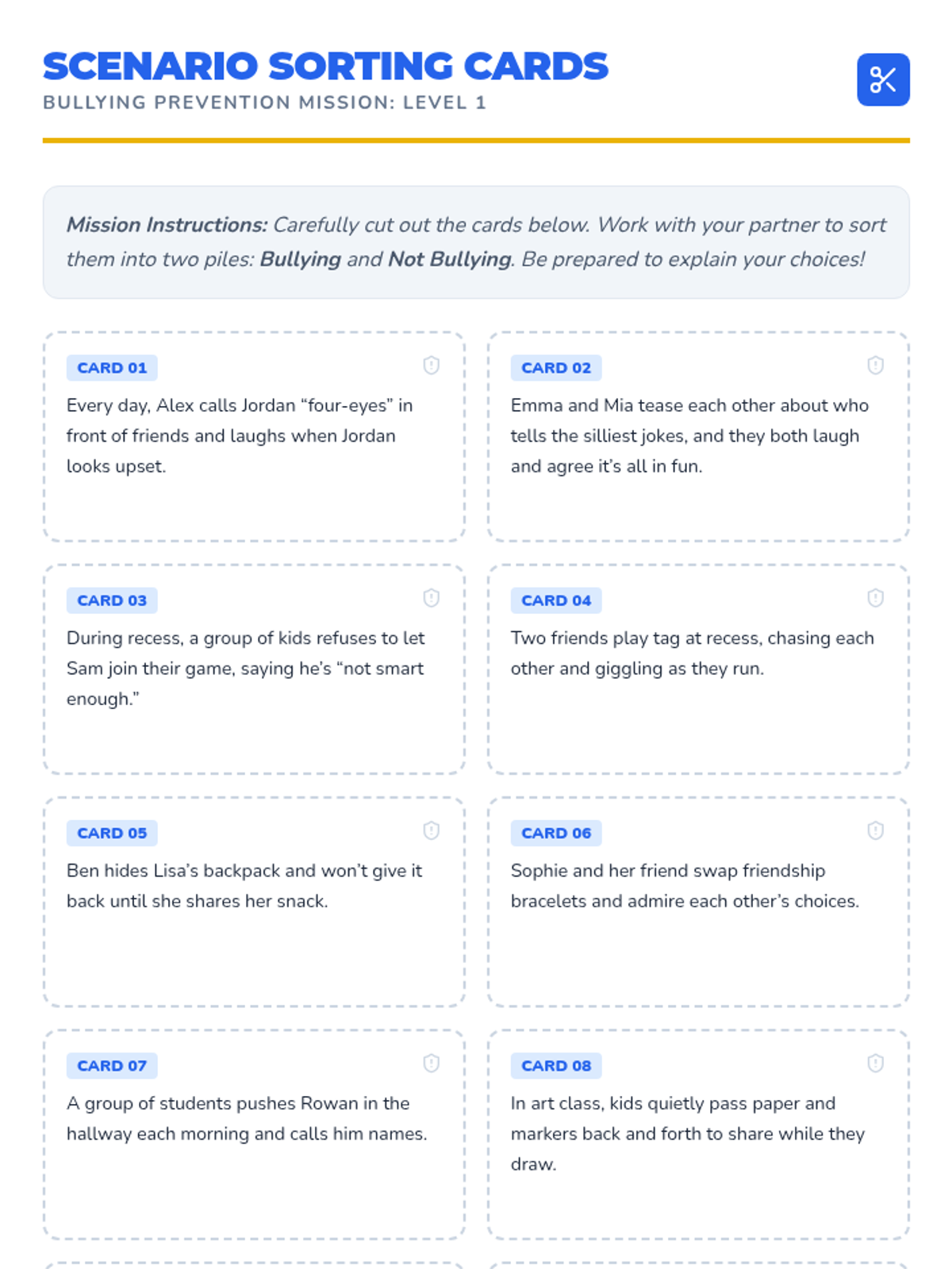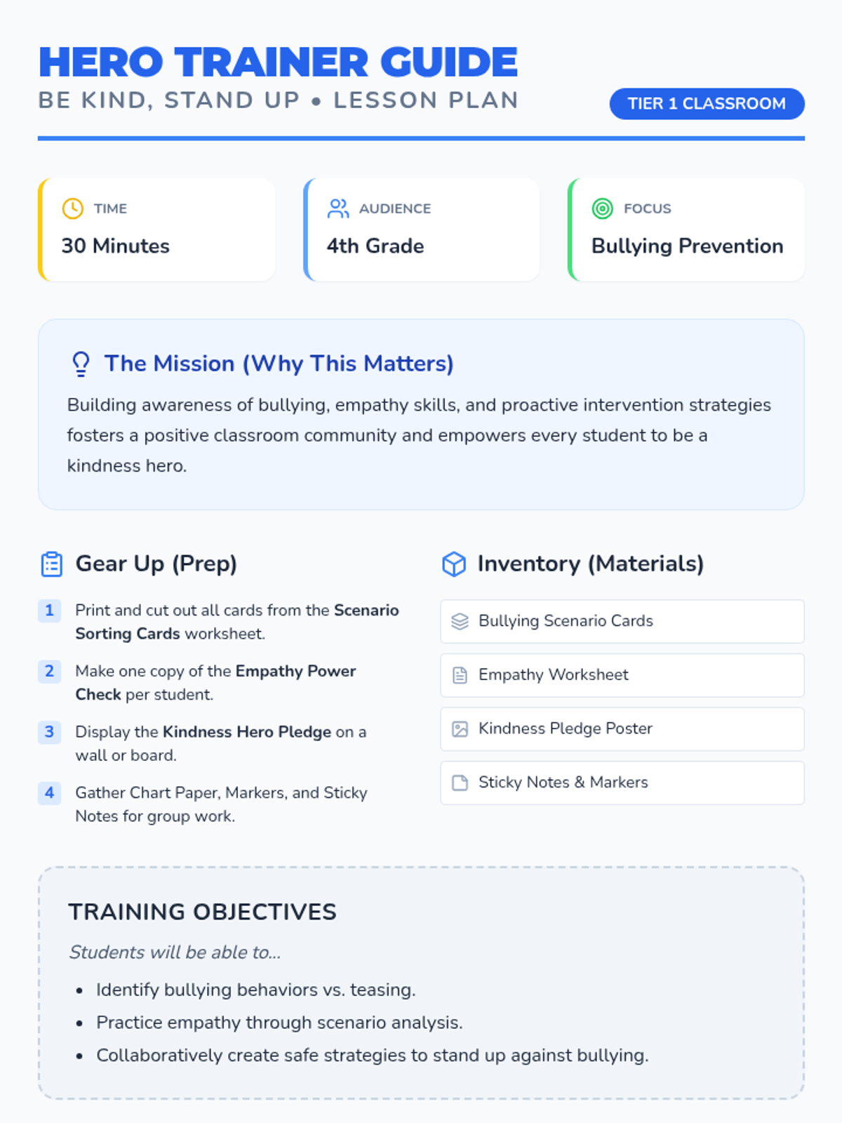 A 30-minute Tier 1 lesson for 4th-grade students to recognize bullying, practice empathy, and learn safe intervention strategies. Students engage in scenario sorting, empathy reflection, and a collective kindness pledge.