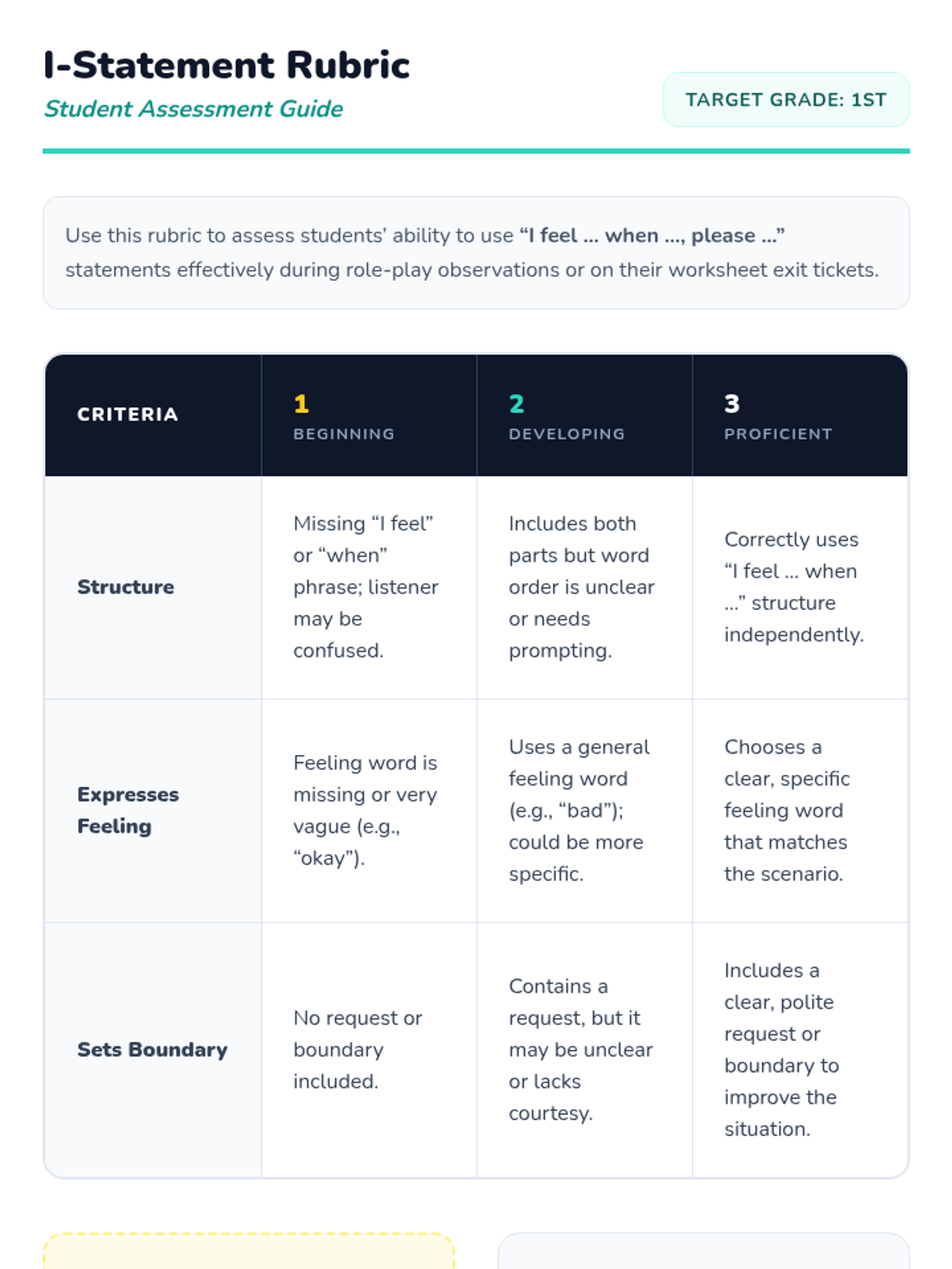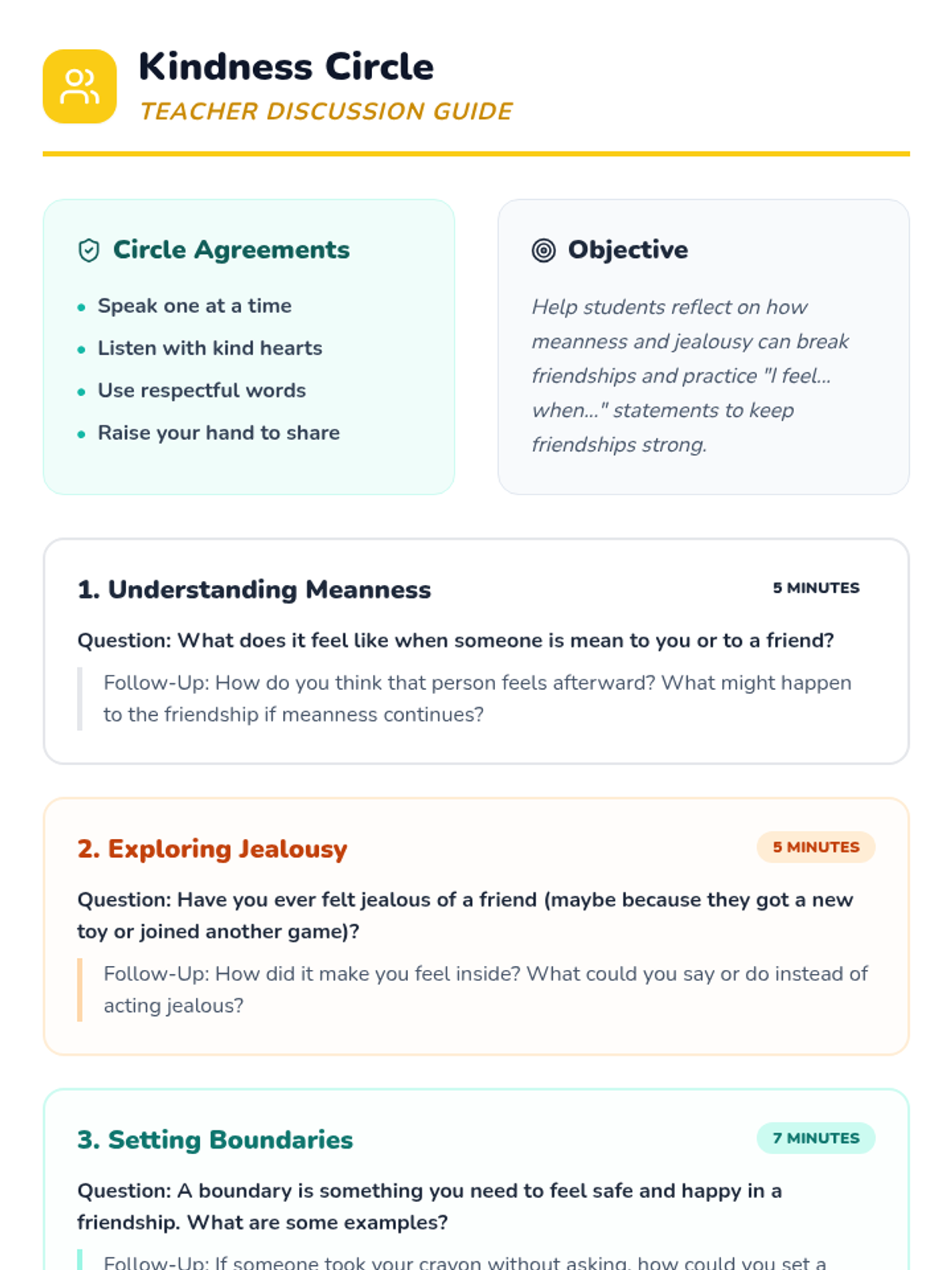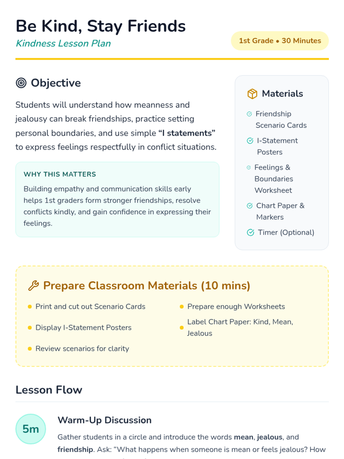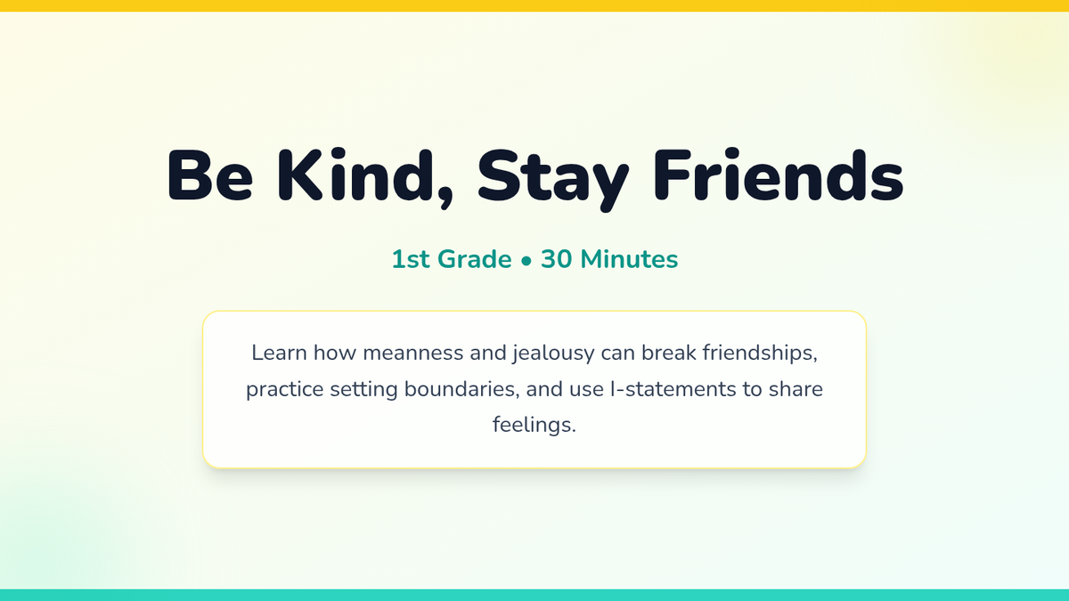 A 30-minute Tier 1 lesson for 1st graders focused on identifying meanness and jealousy, setting boundaries, and using 'I-statements' to maintain healthy friendships.