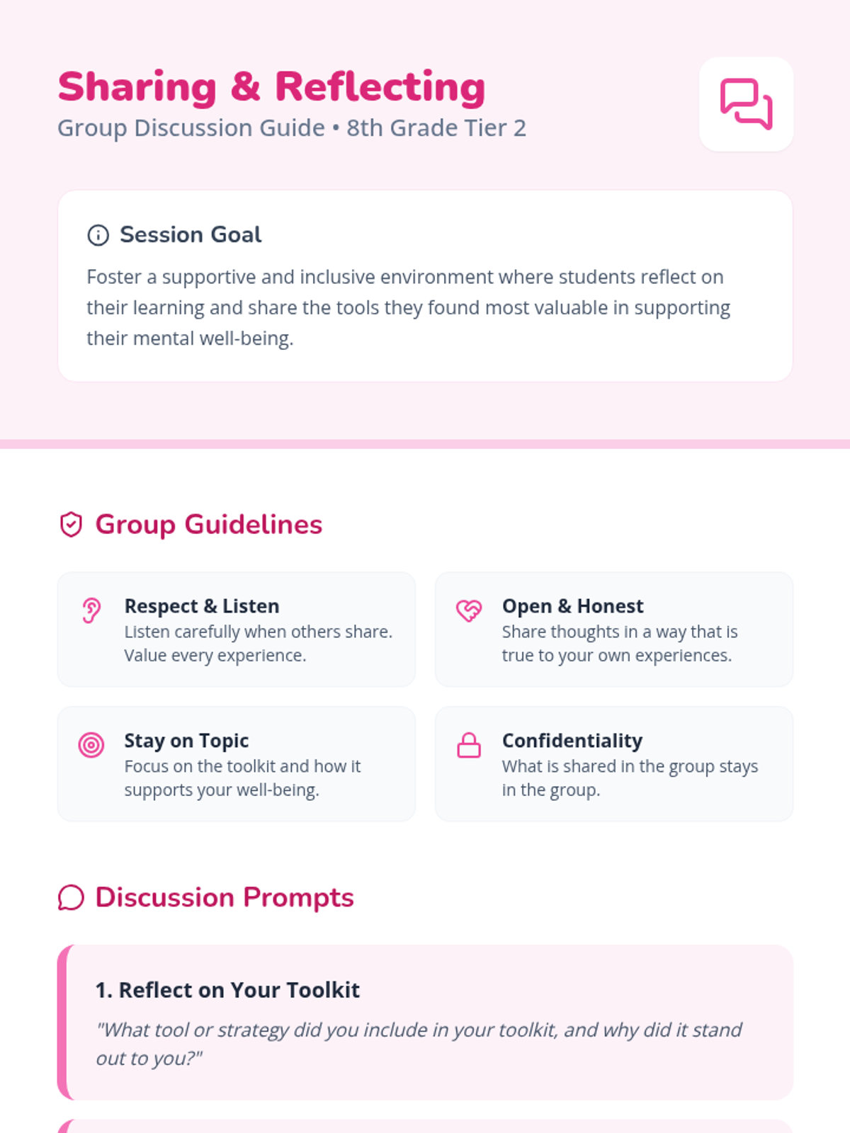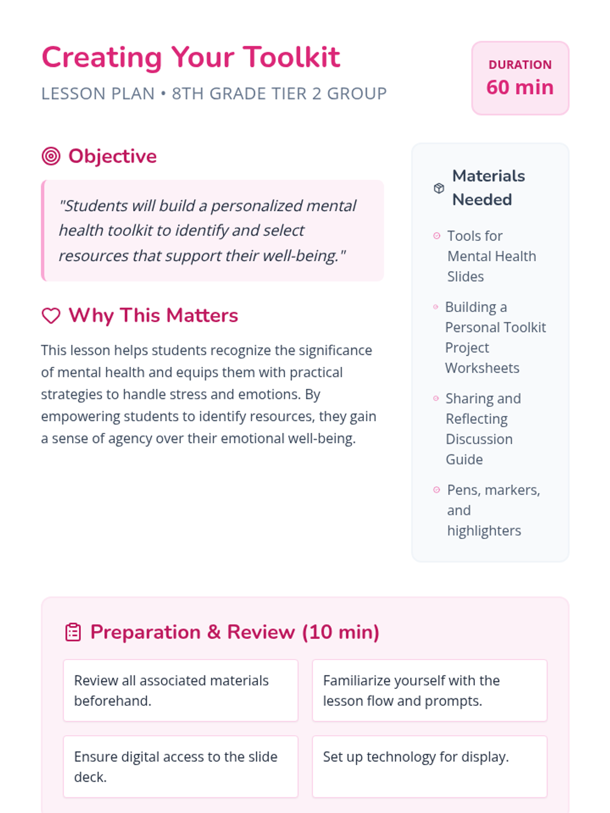 A 60-minute Tier 2 group support lesson for 8th-grade students focused on building a personalized mental health toolkit to manage stress and emotions.
