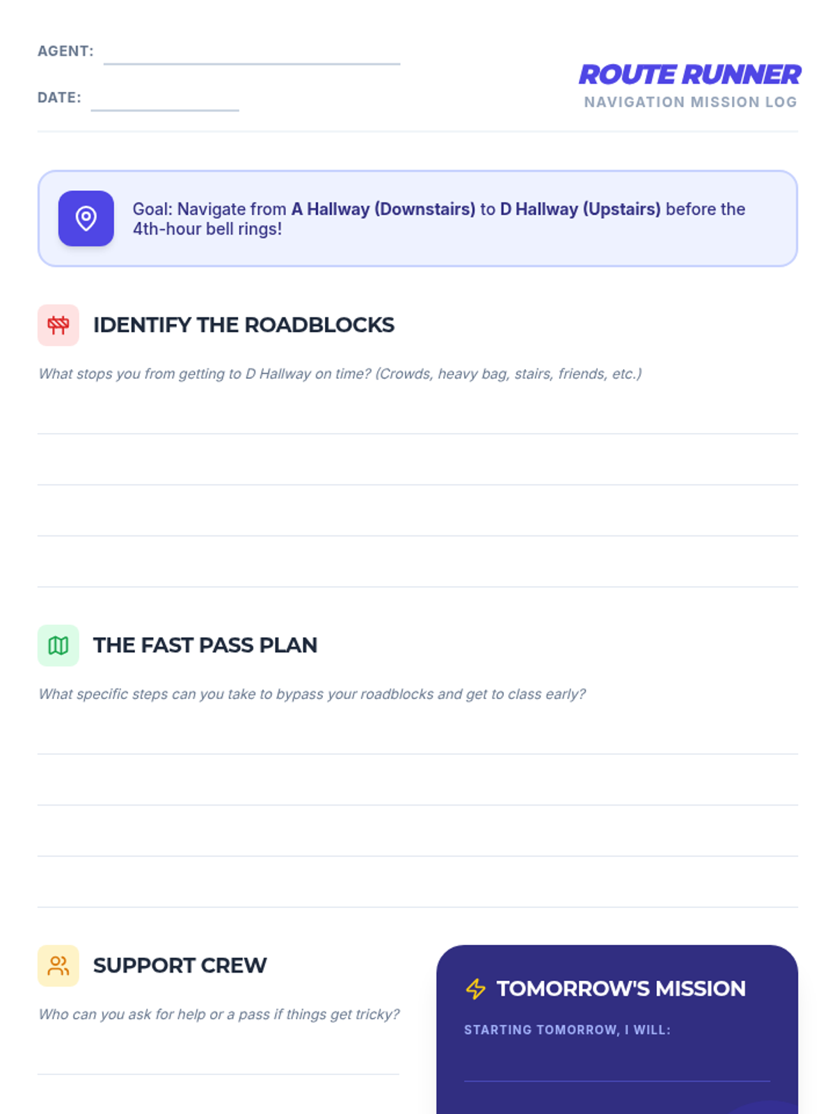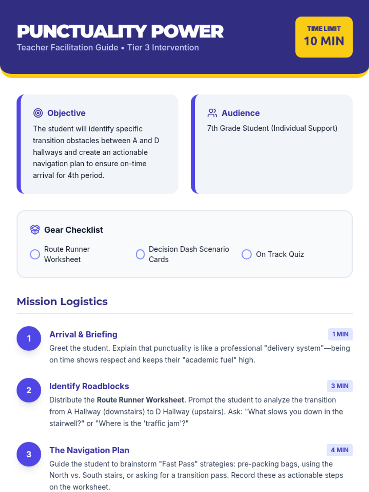A quick Tier 3 intervention for a 7th-grade student to improve punctuality between specific hallways by identifying obstacles and creating a step-by-step navigation plan.
