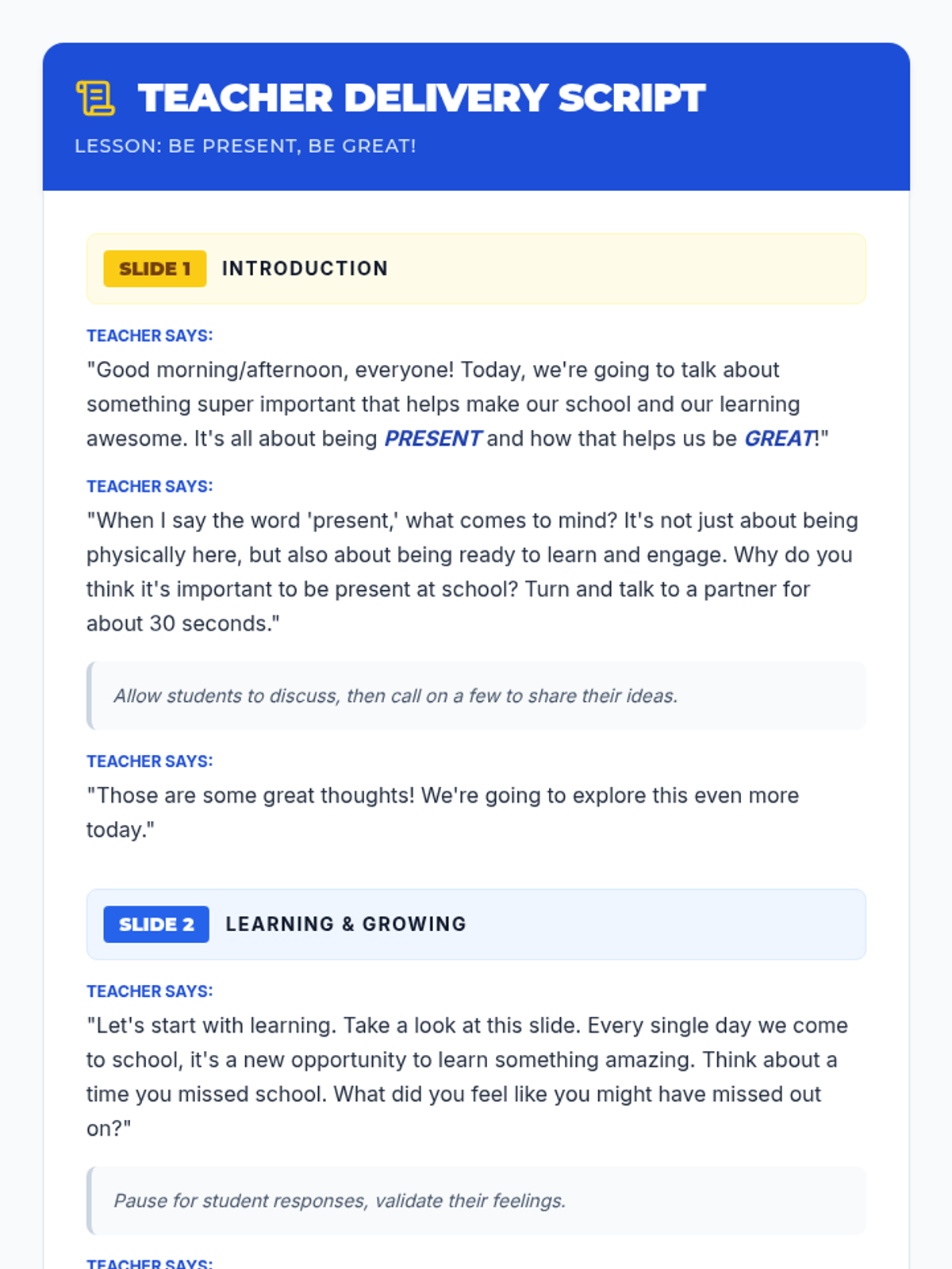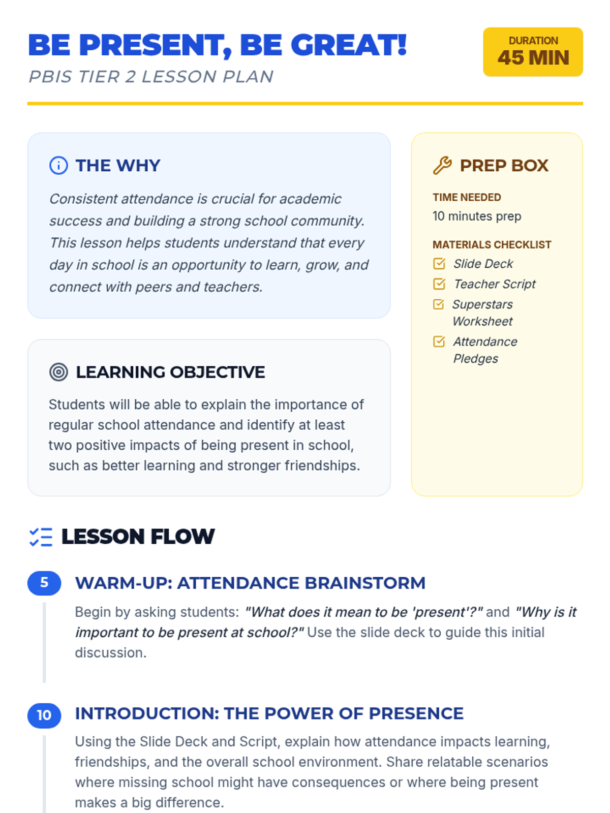 A 45-minute PBIS lesson for 4th-grade small groups focused on the importance of consistent school attendance for academic success and community building. Students explore the positive impacts of being present and make a personal commitment to their attendance.