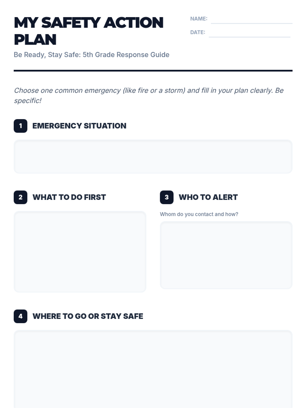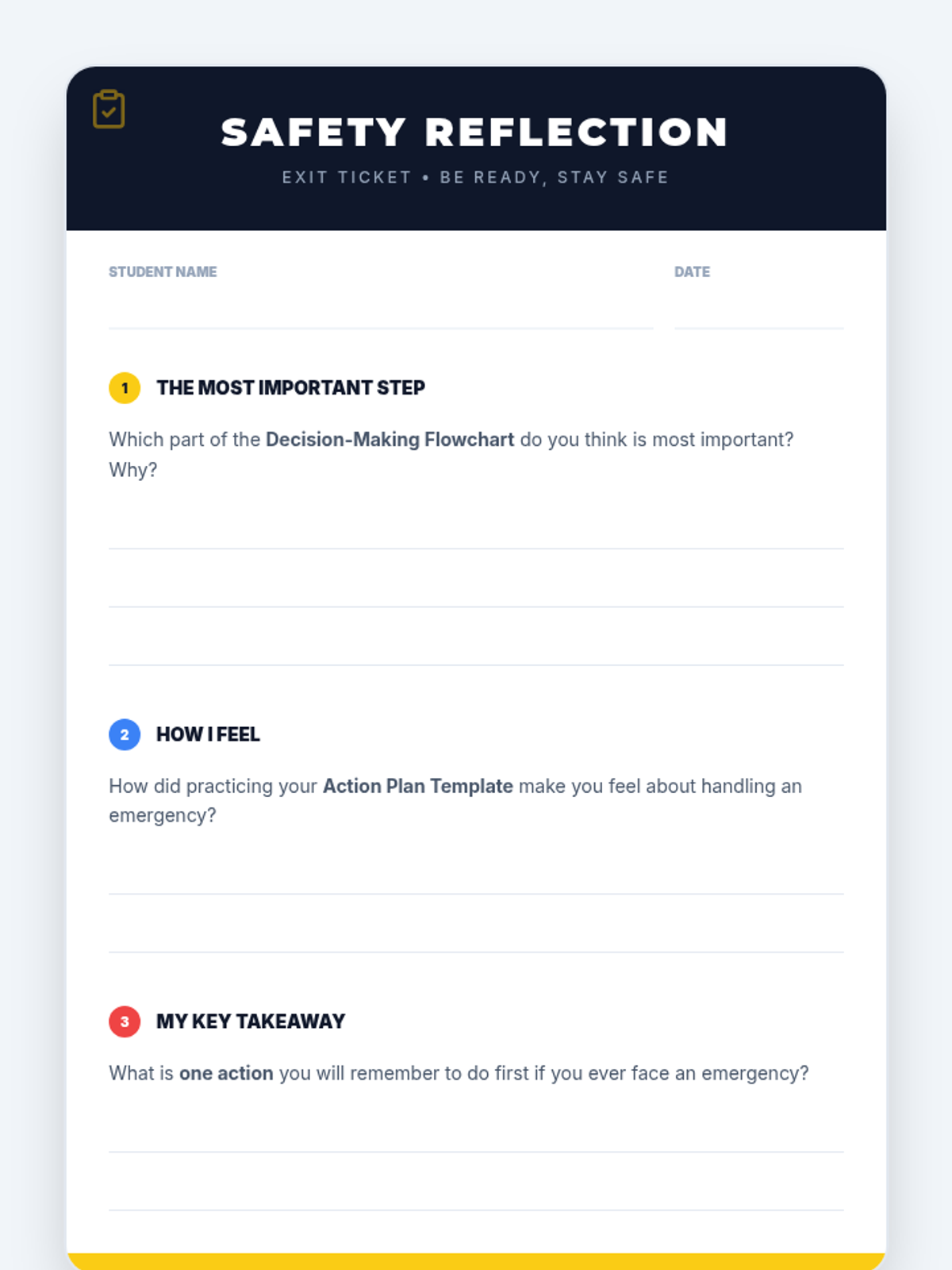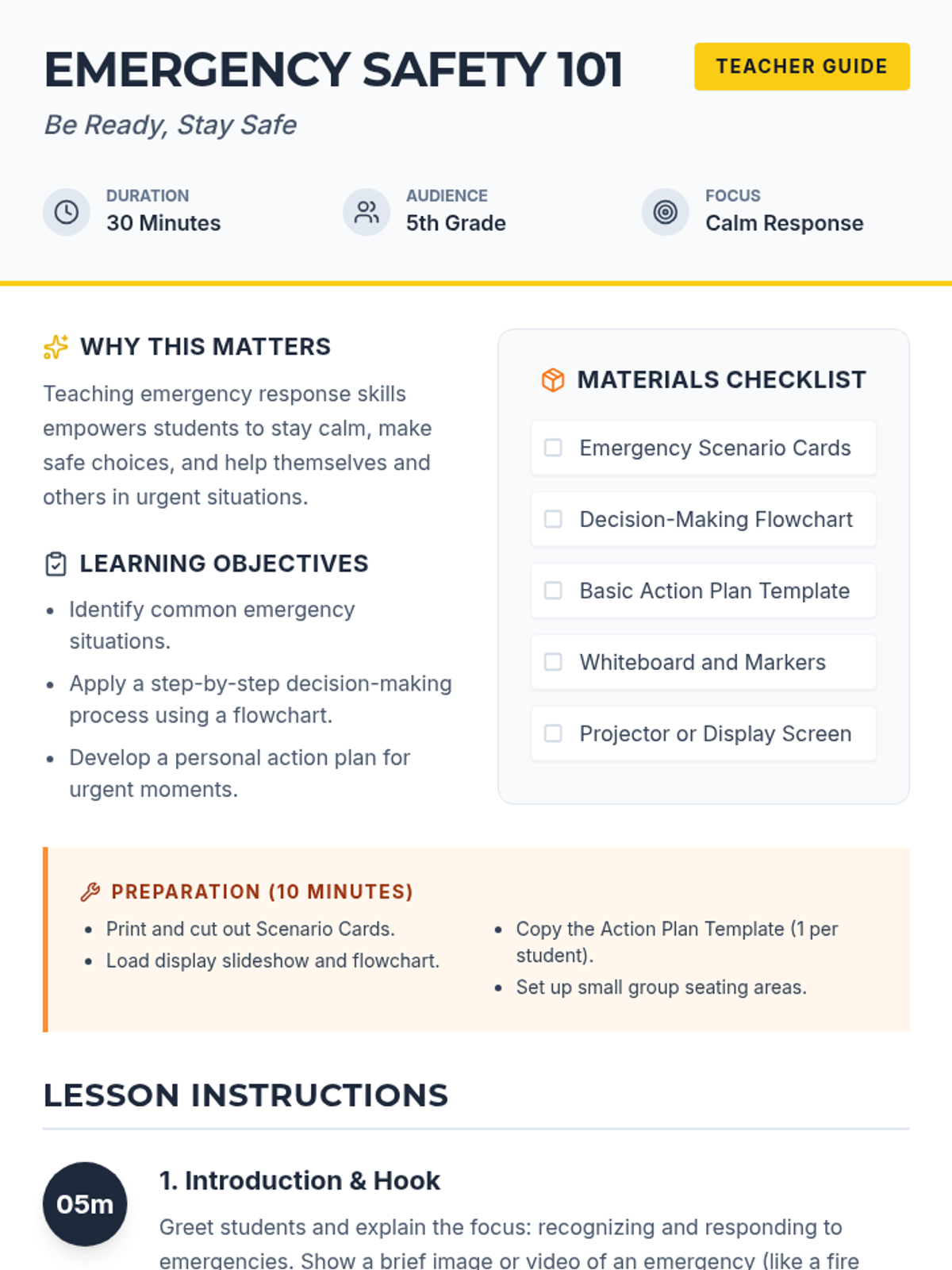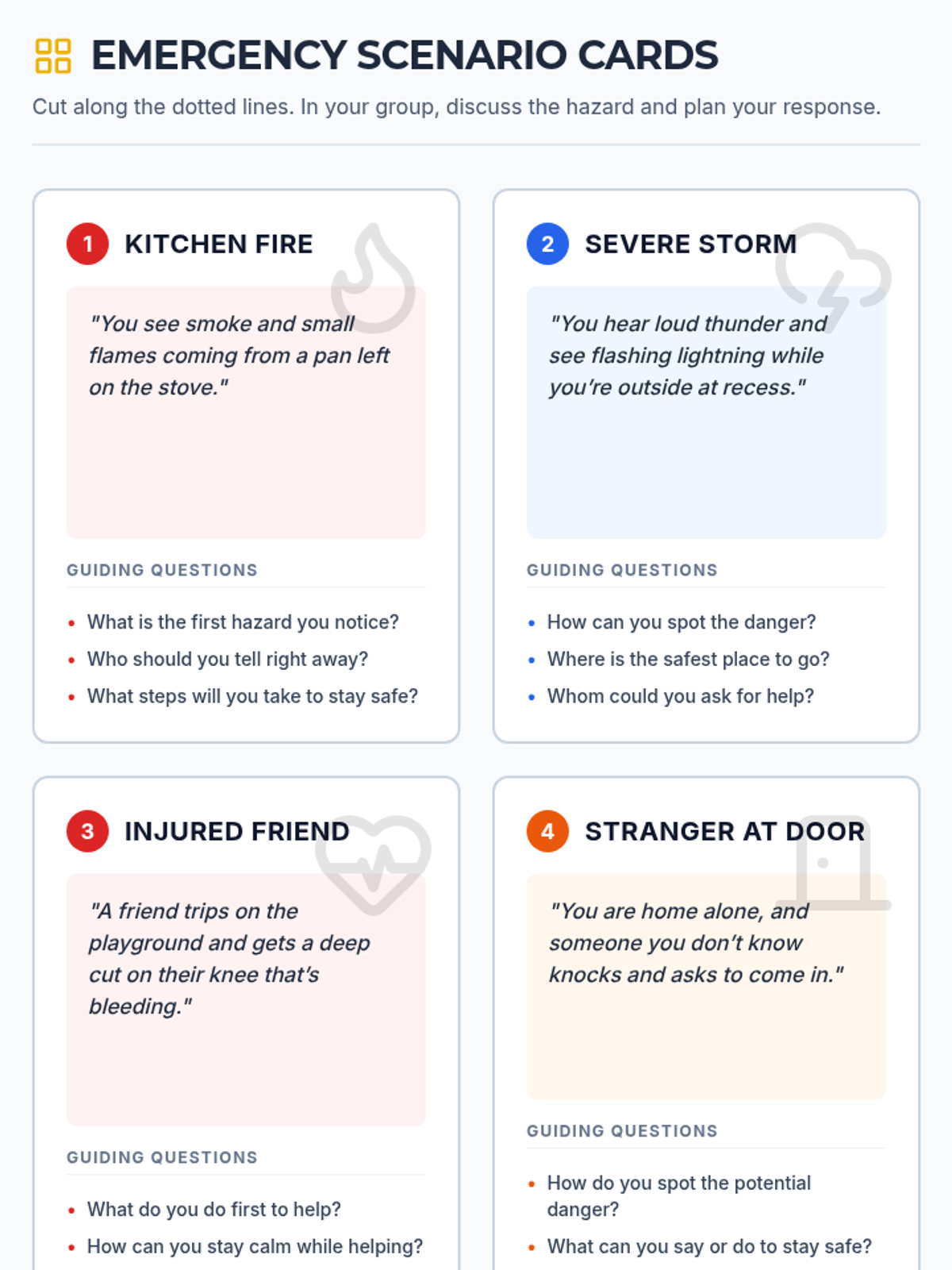 In this 30-minute lesson, 5th graders learn to recognize and respond to common emergencies. They practice using a decision-making flowchart and create their own personal action plans.