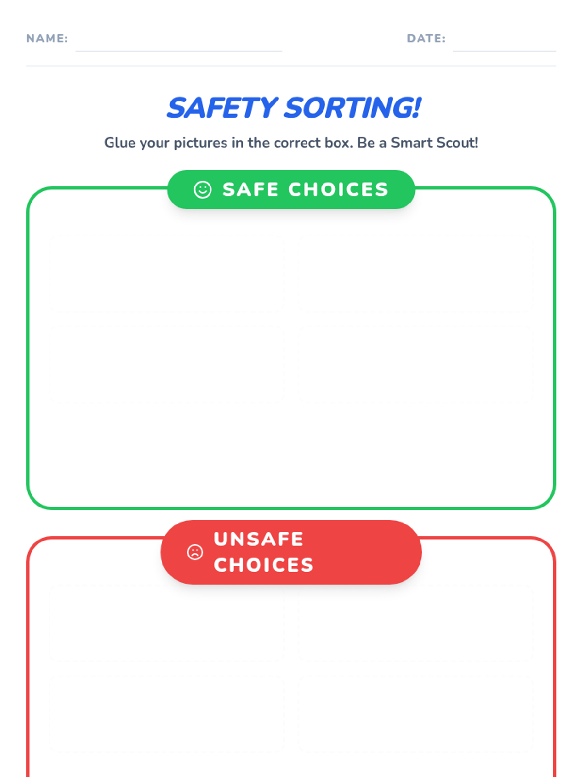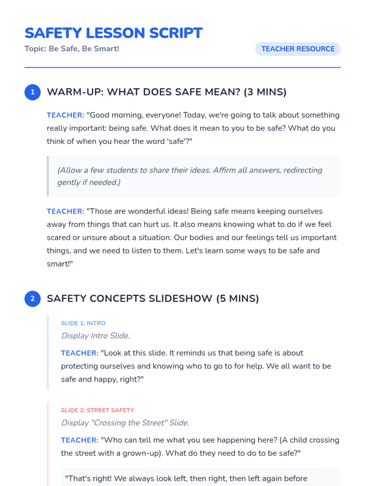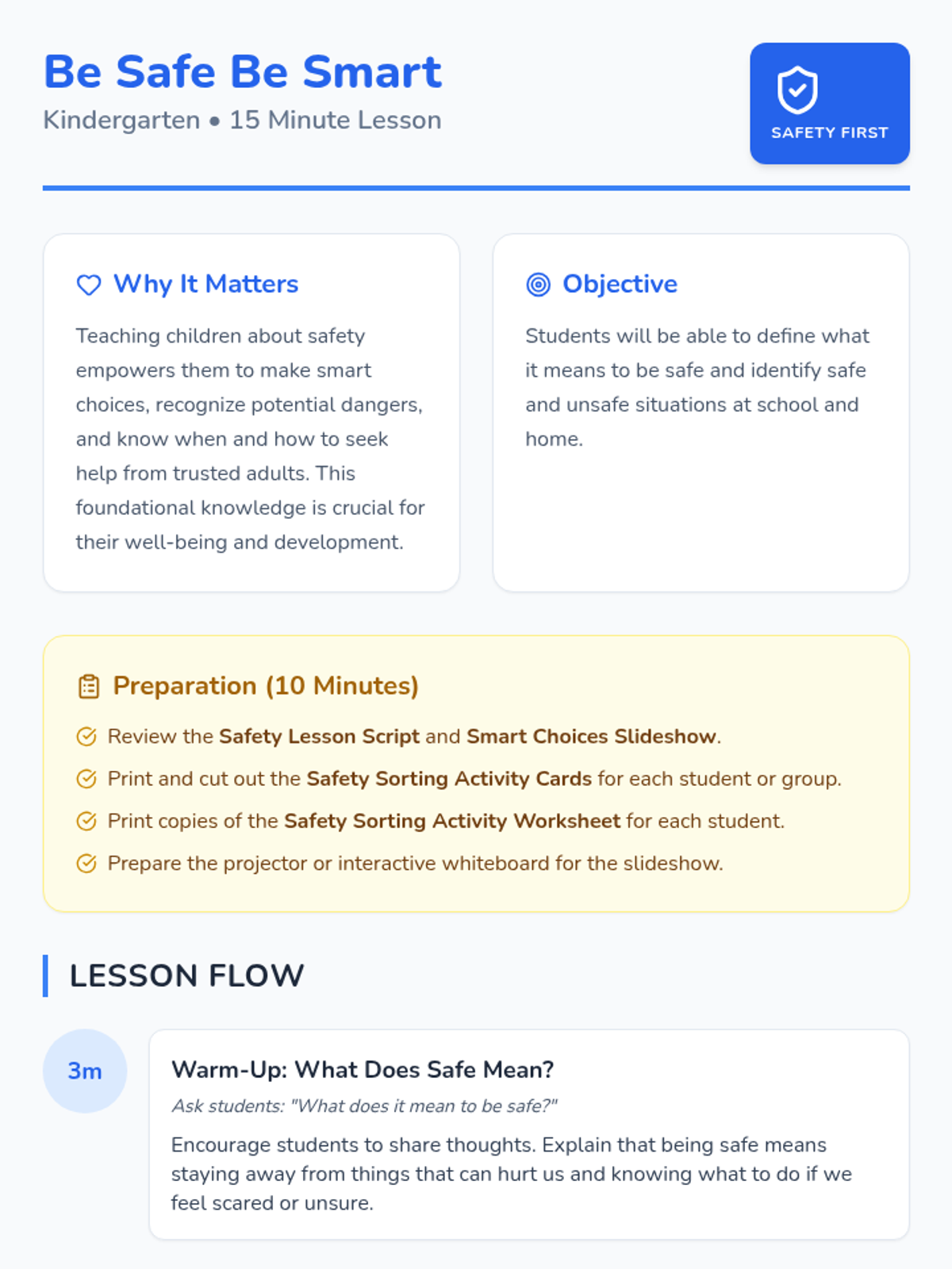 This lesson introduces Kindergarten students to the concept of 'being safe' by identifying safe behaviors and situations at school and home. It helps children understand how to recognize and react to unsafe situations, fostering a sense of awareness and self-protection.