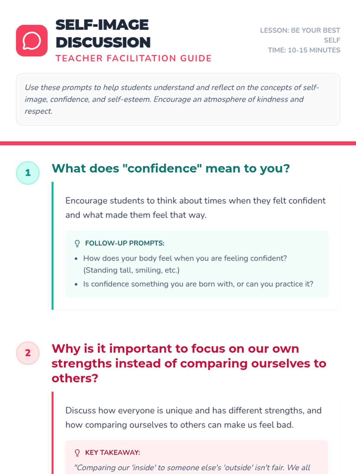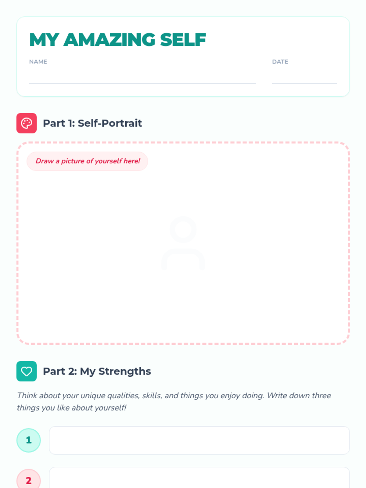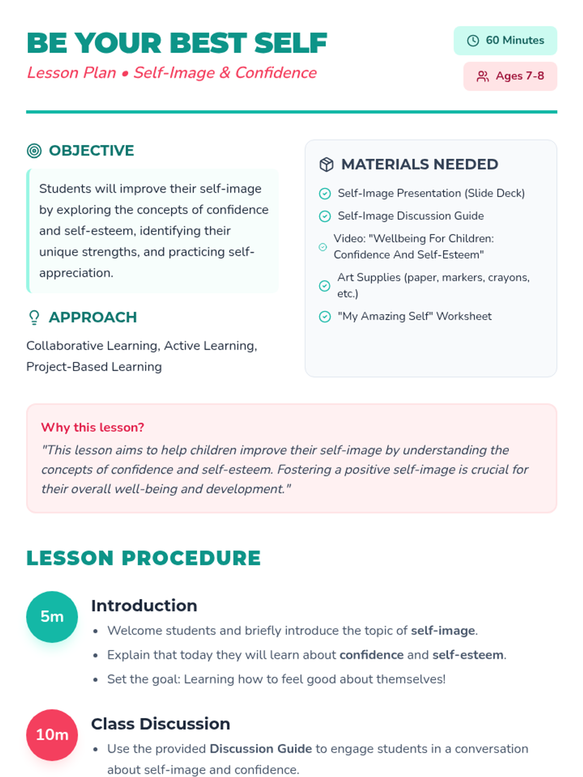 This lesson helps children improve their self-image by exploring confidence and self-esteem. Students will engage in discussions, watch a video, and create self-portraits to celebrate their unique strengths.