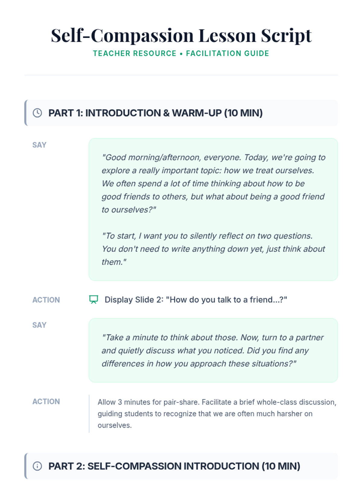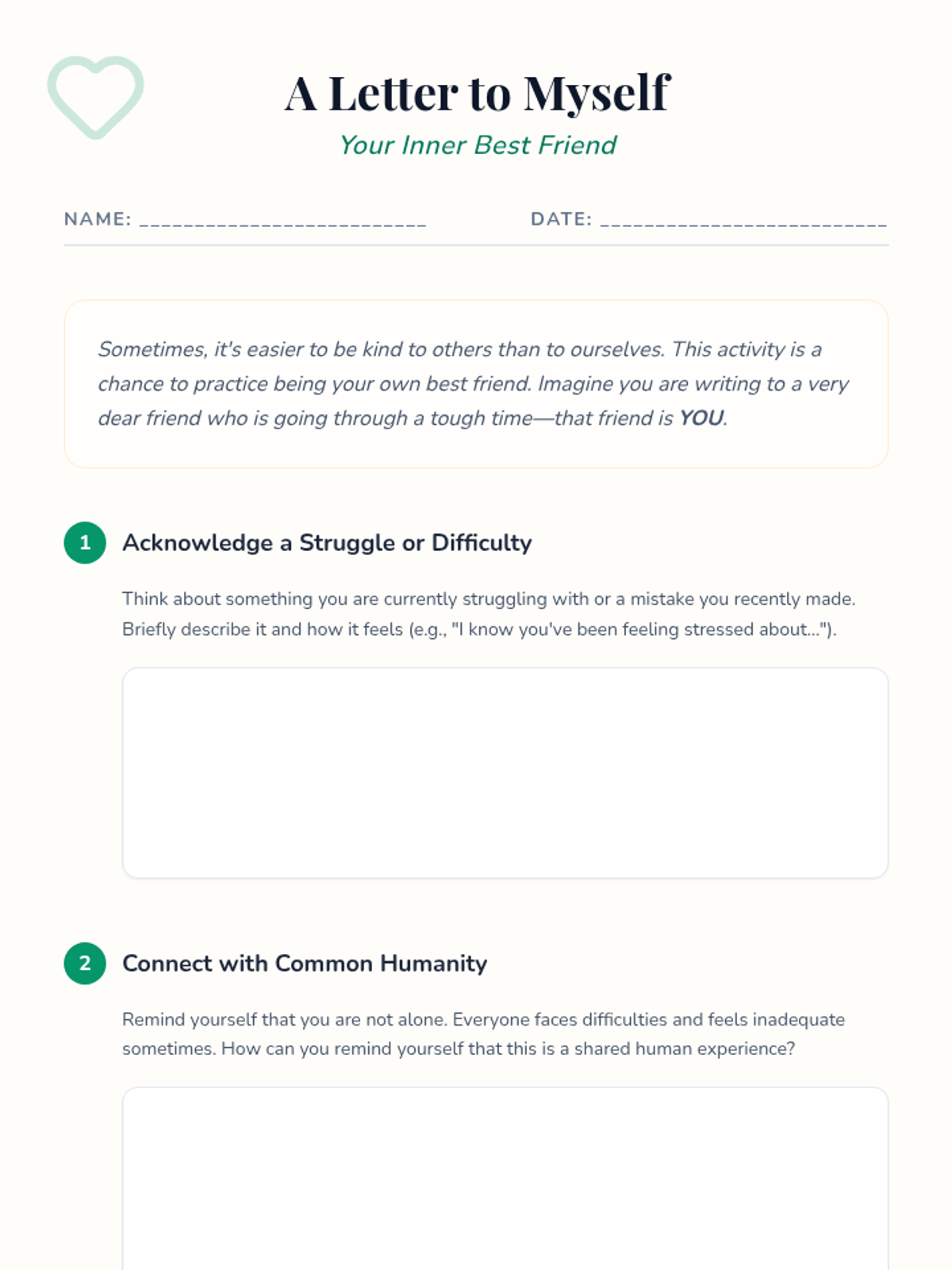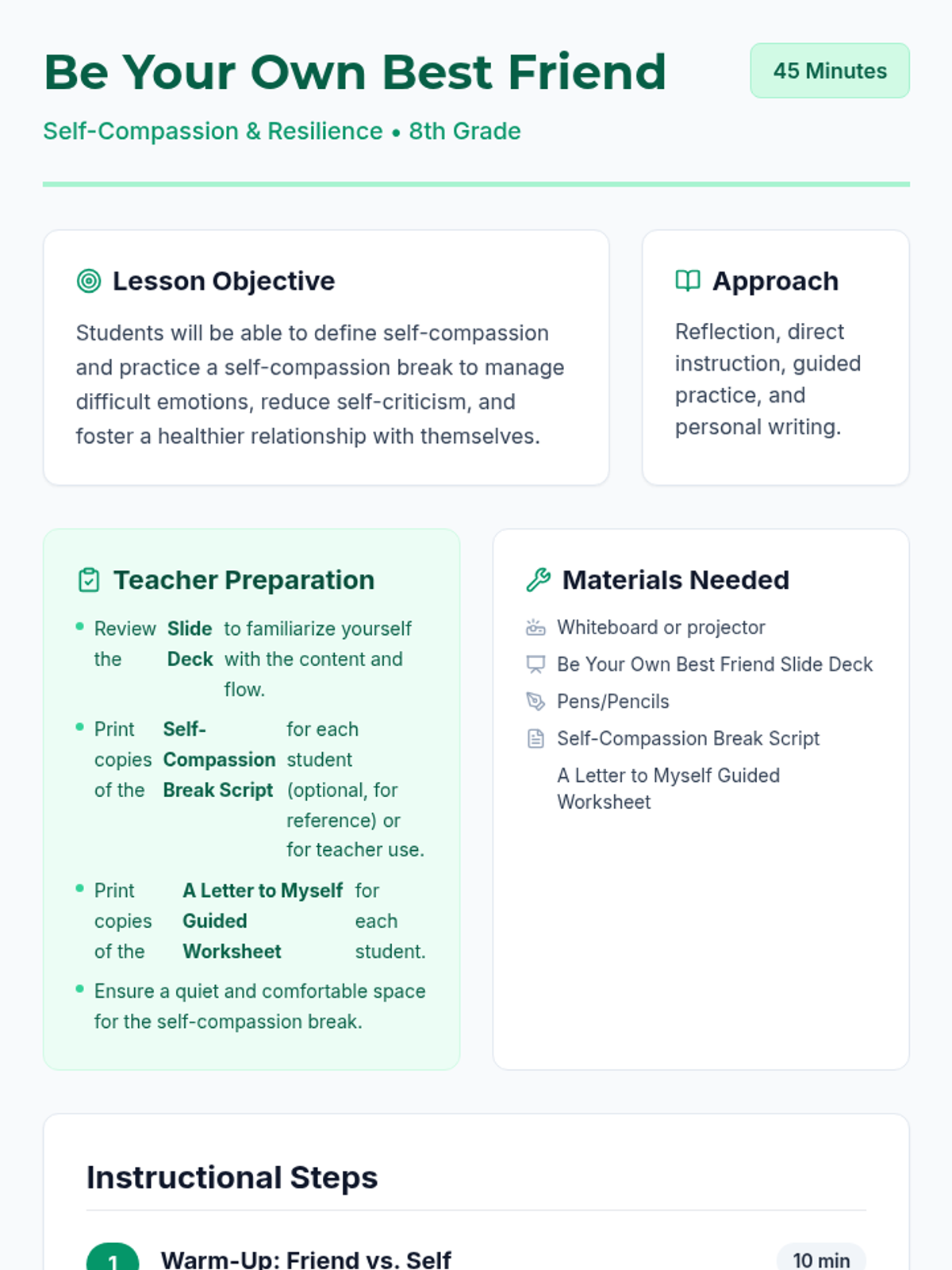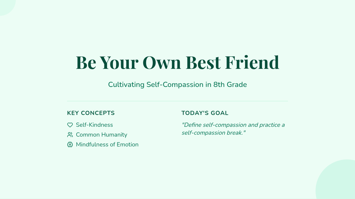 This 45-minute lesson for 8th-grade students helps them understand and practice self-compassion by exploring its three core elements and practicing a self-compassion break. Students will cultivate a supportive inner voice through reflection and a guided journaling activity.