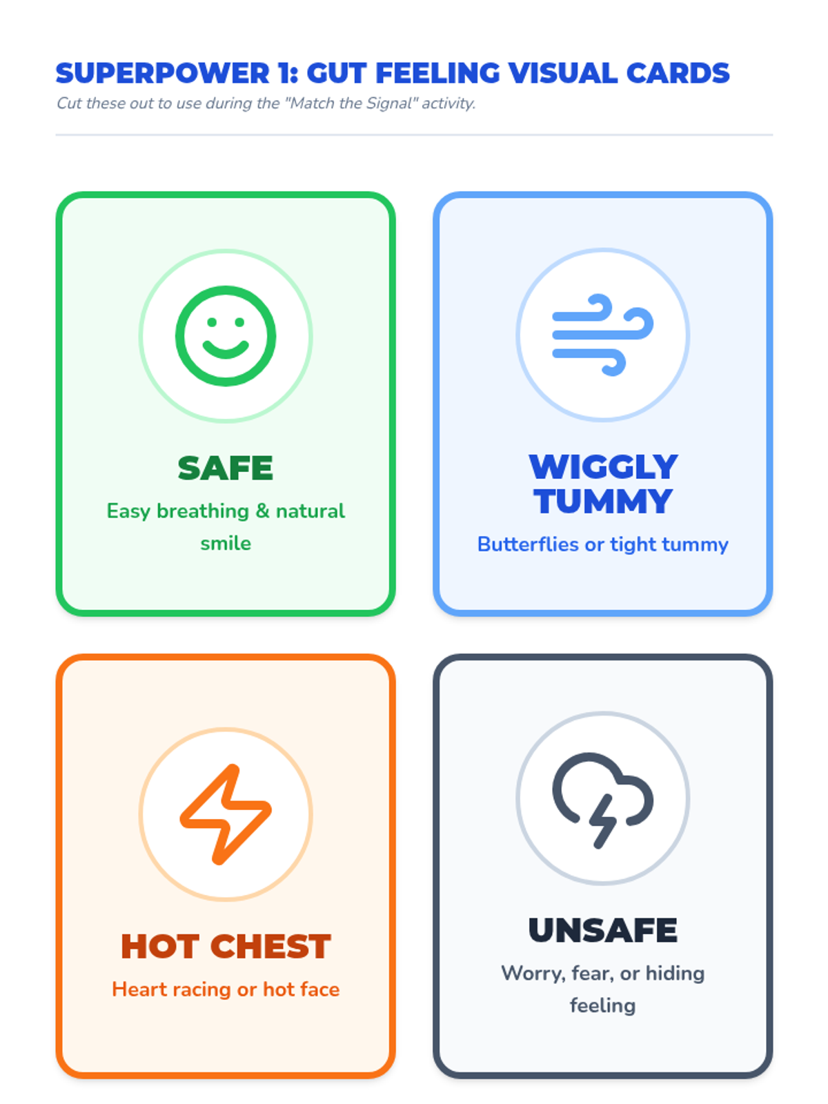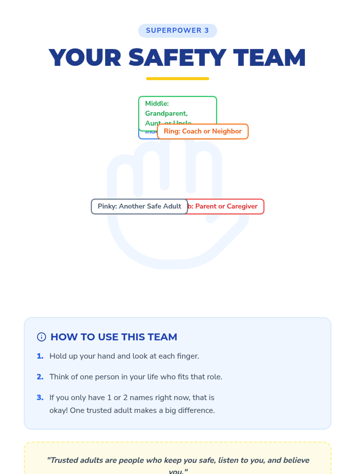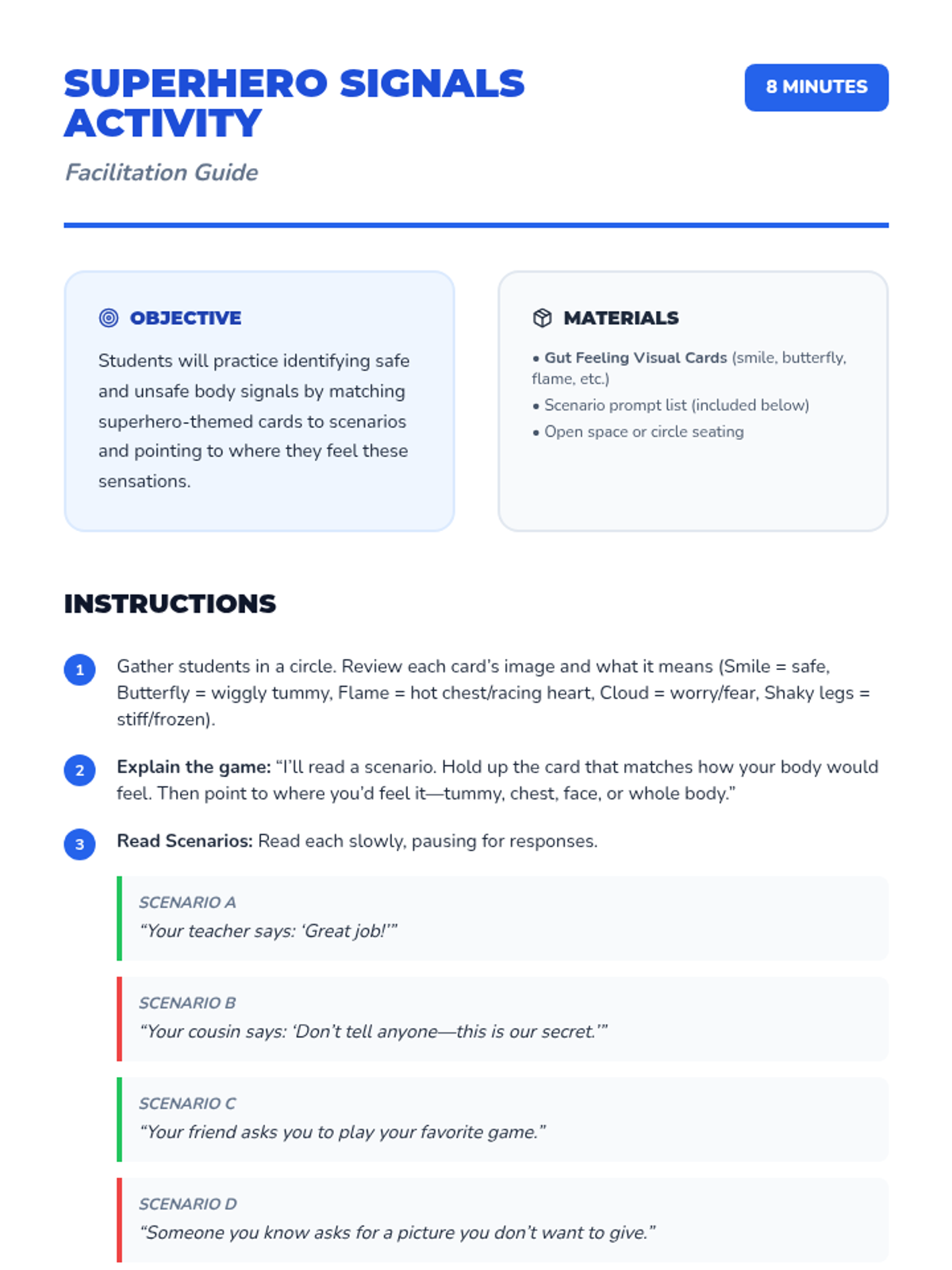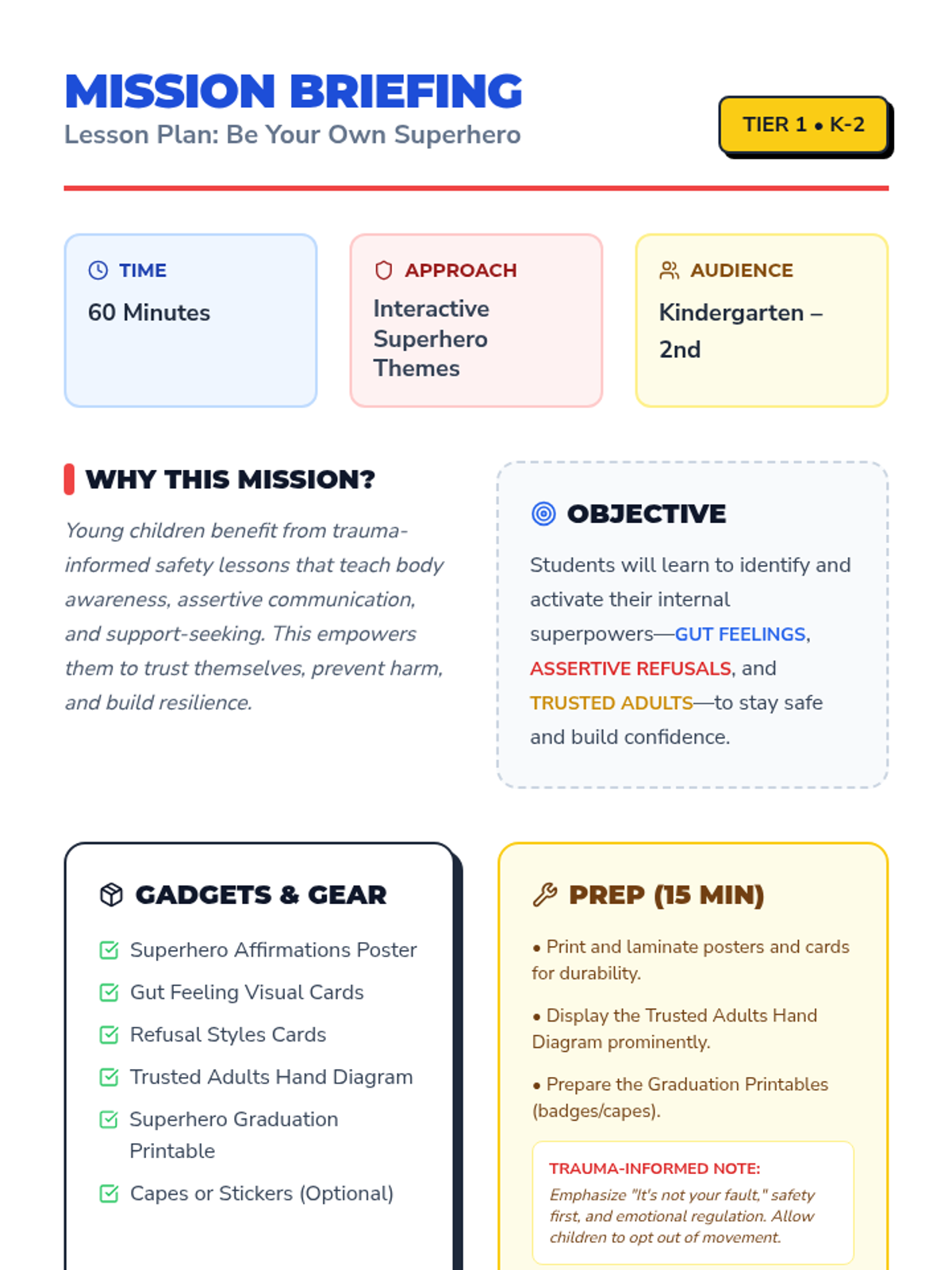 A 60-minute trauma-informed safety assembly for K-2 students that teaches internal 'superpowers' like gut feelings, assertive refusals, and identifying trusted adults.