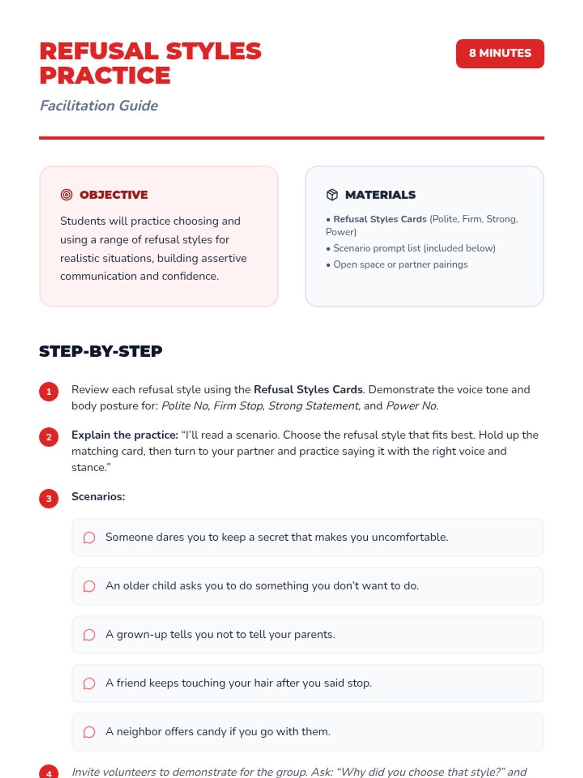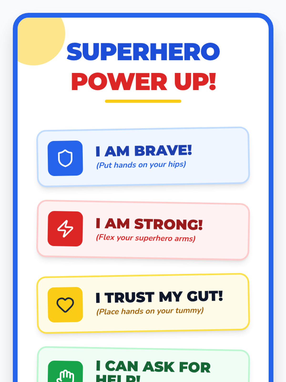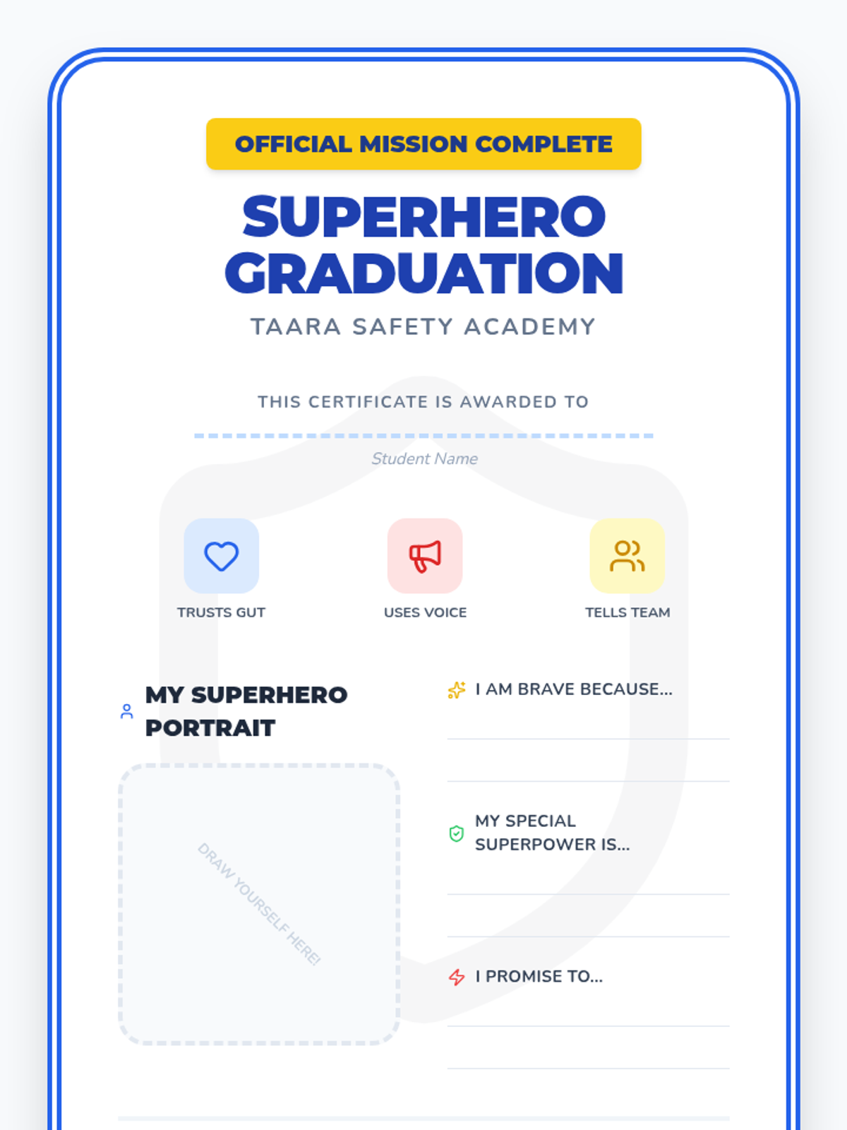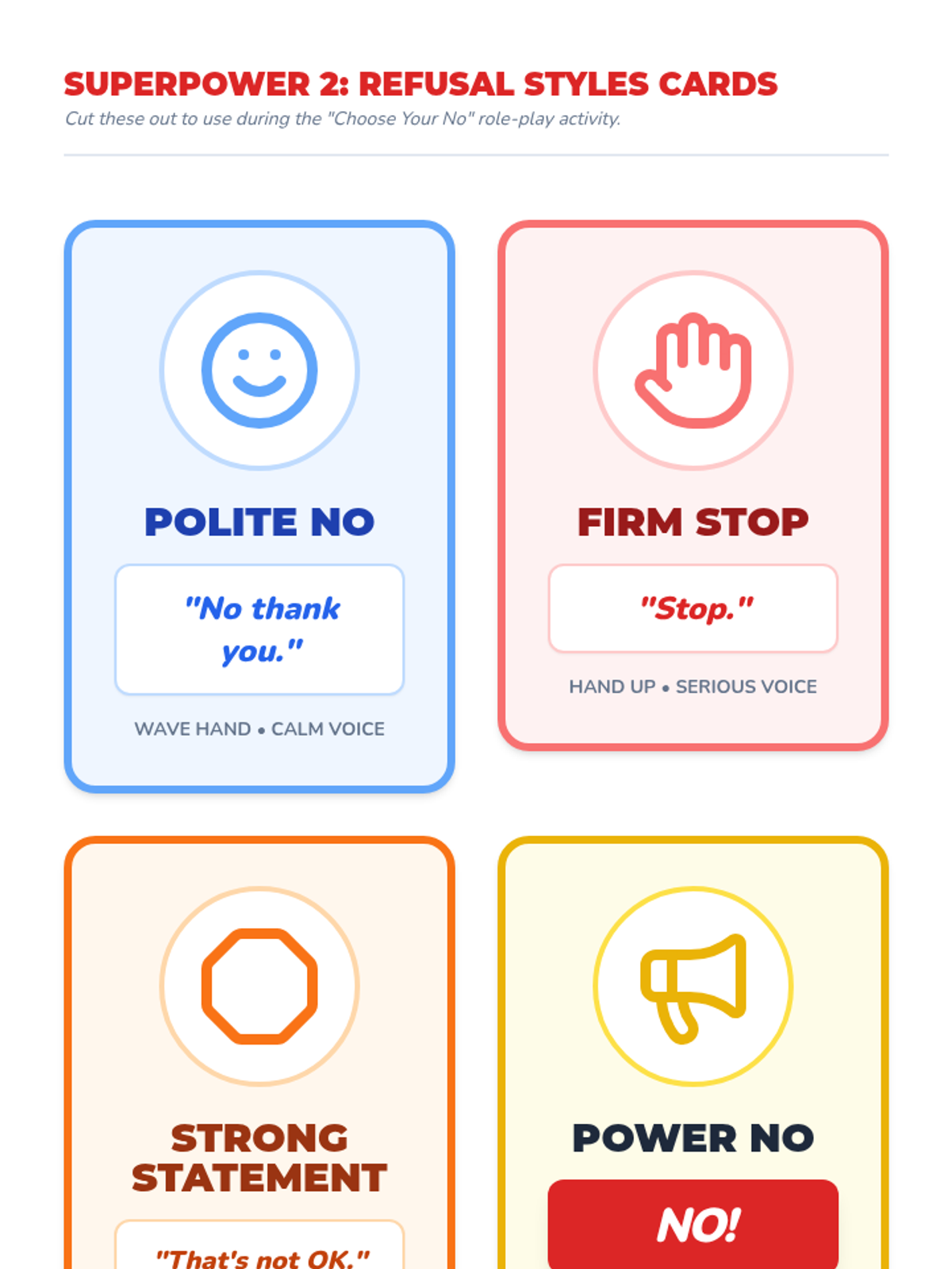 A 60-minute trauma-informed safety assembly for K-2 students that teaches internal 'superpowers' like gut feelings, assertive refusals, and identifying trusted adults.
