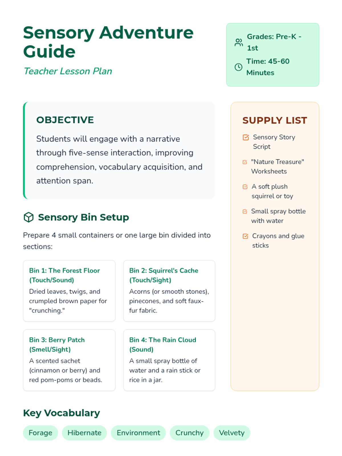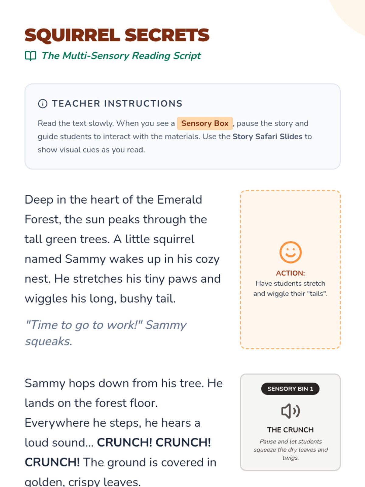 A multi-sensory literacy experience for early learners, using tactile objects, sounds, and smells to bring a story about a forest animal to life.