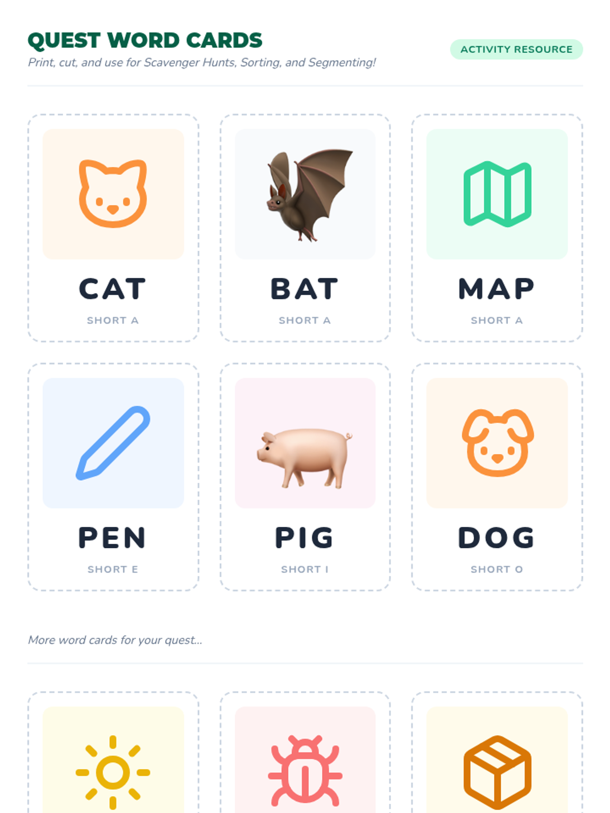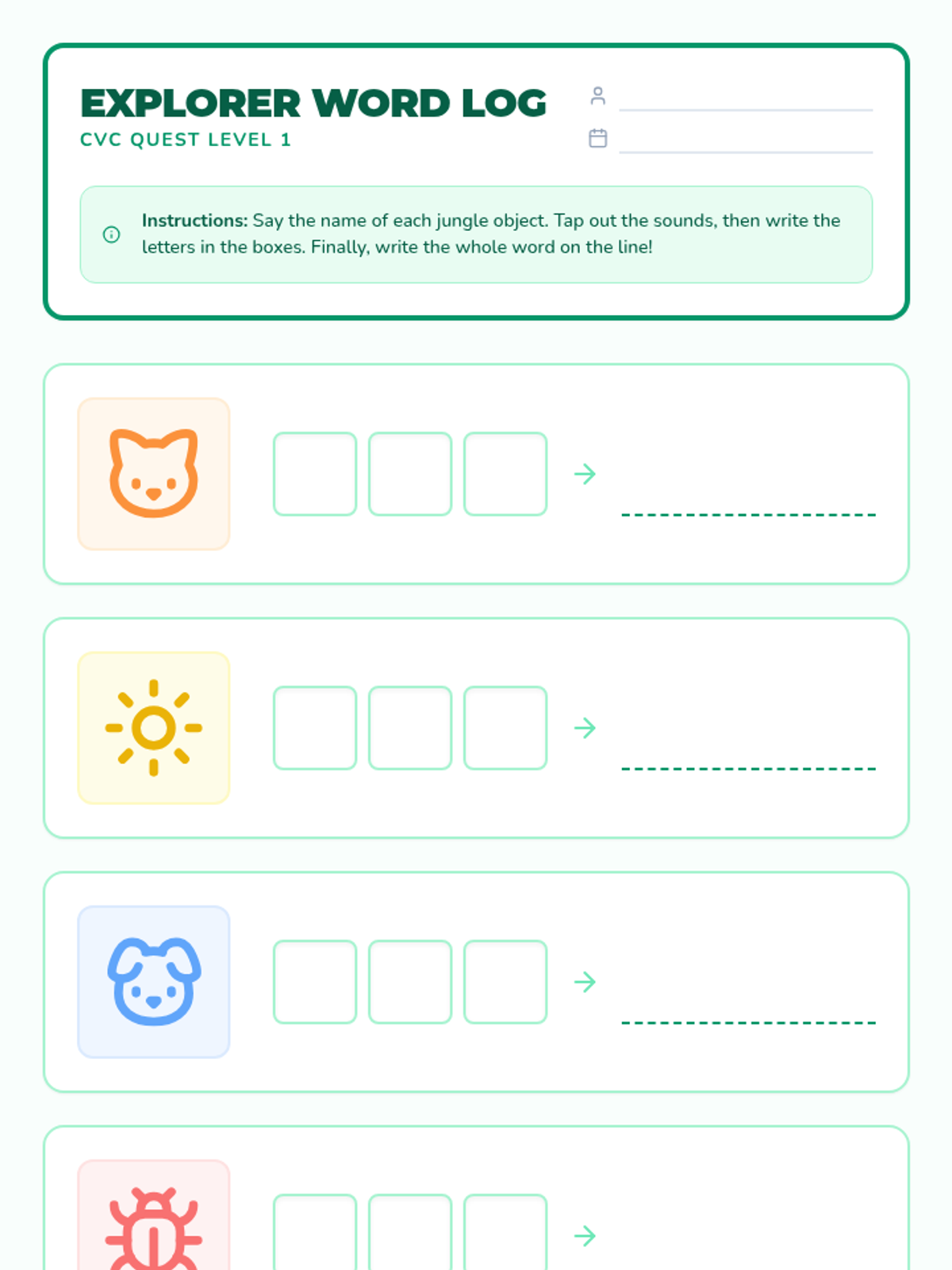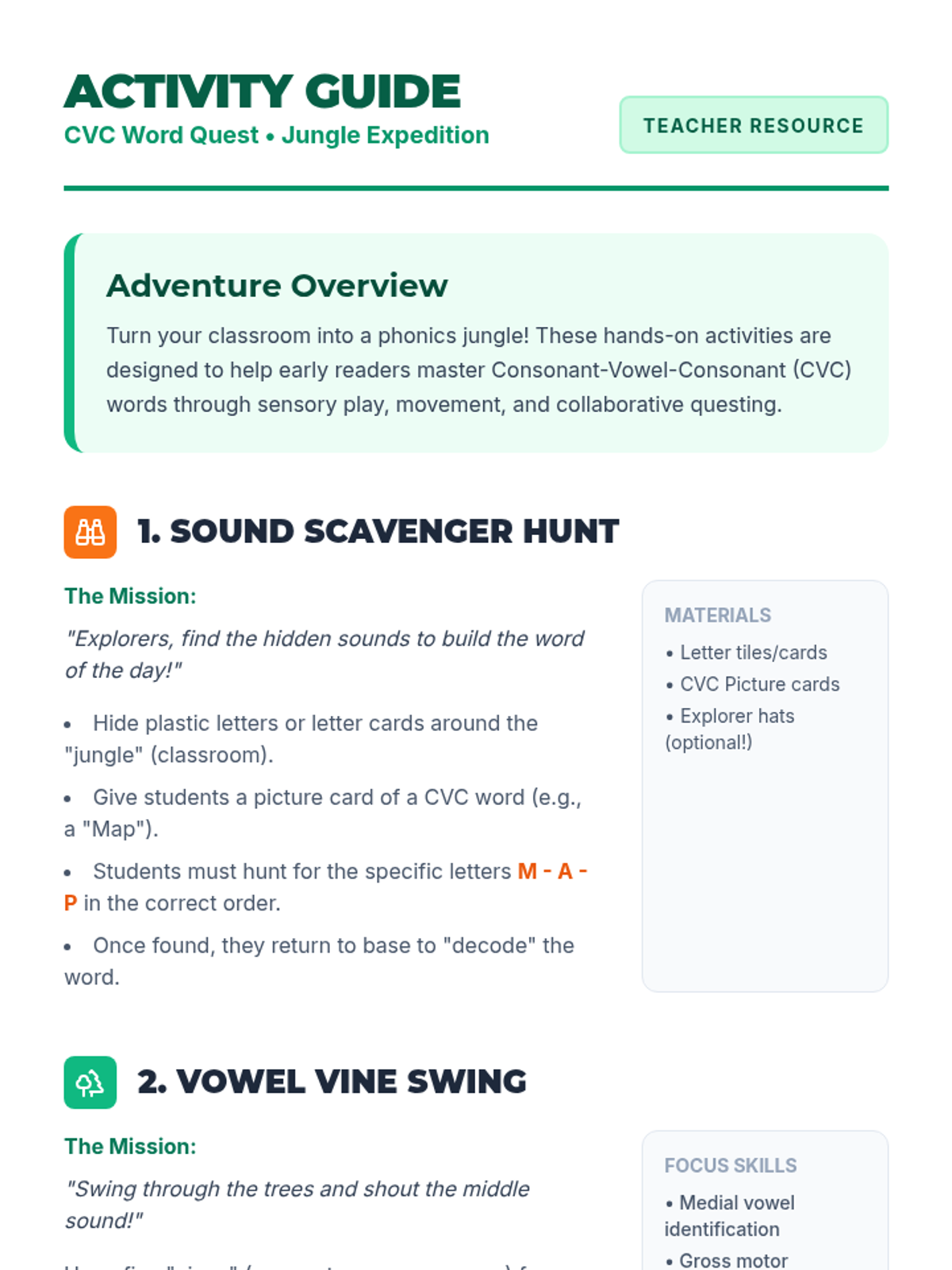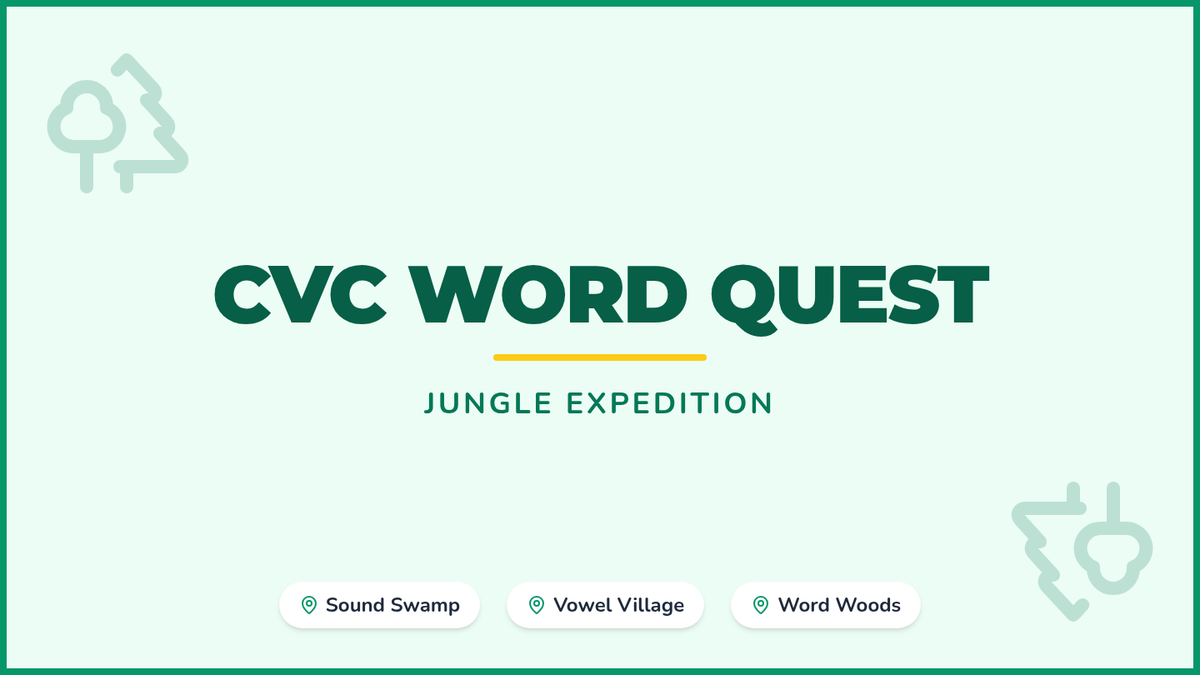 A fun, jungle-themed introduction to reading and building CVC words through blending and segmenting sounds. Students will embark on a "Word Quest" to master short vowel sounds and consonant-vowel-consonant patterns.