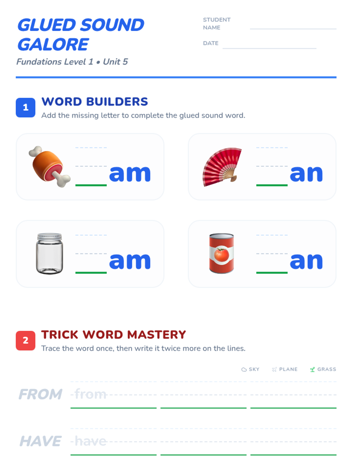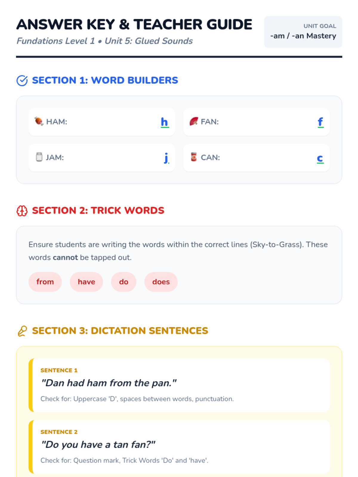 A lesson focusing on glued sounds -am and -an, along with trick words 'from', 'have', 'do', and 'does' for early literacy development.