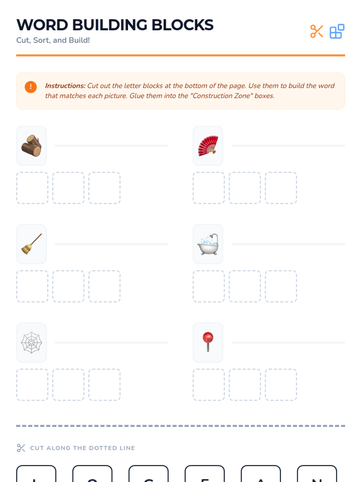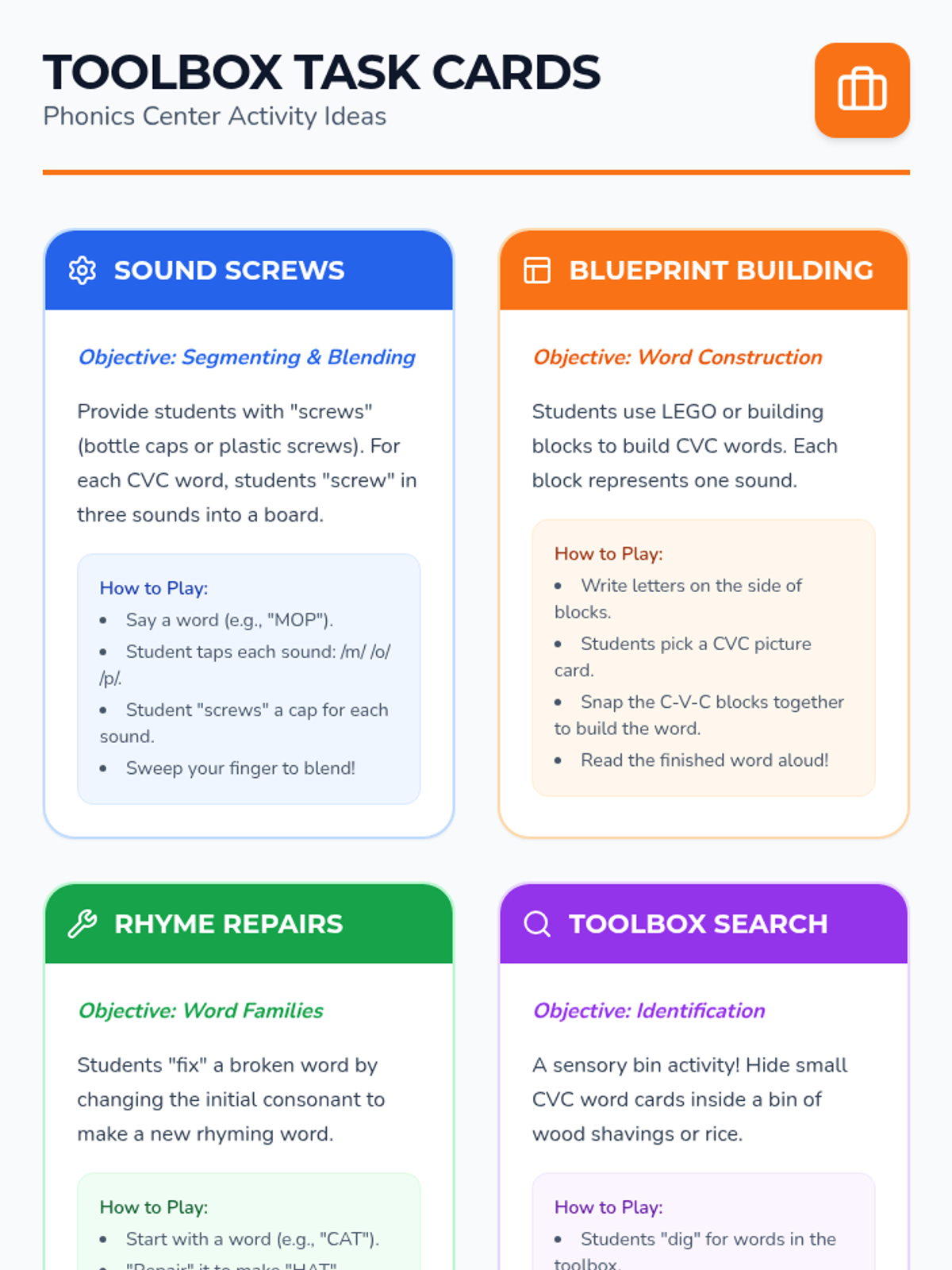 Students will learn to blend and segment CVC words, identifying initial, medial, and final sounds through 'construction' themed activities.