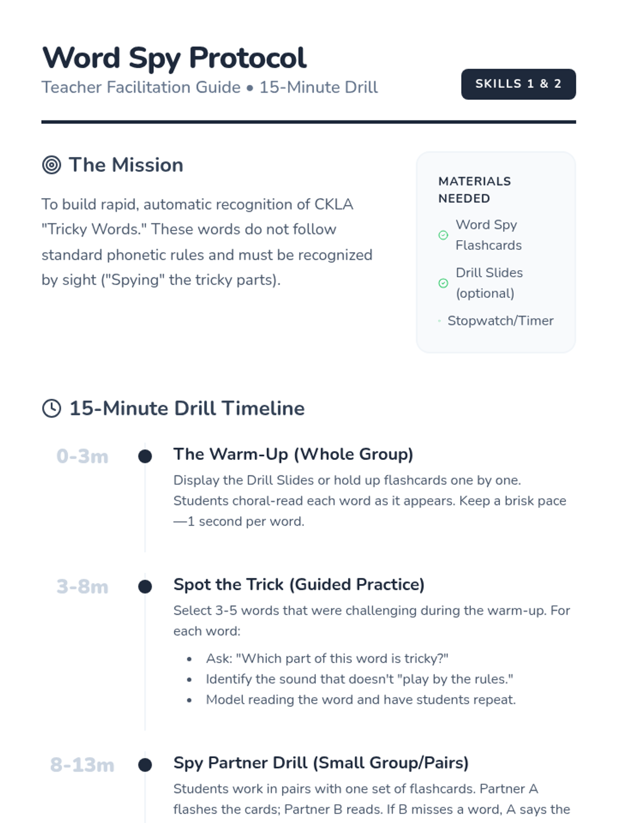 A focused practice session for CKLA Grade 1 Skills 1 & 2 Tricky Words, featuring printable flashcards and a teacher-led 15-minute drill protocol to build word recognition automaticity.